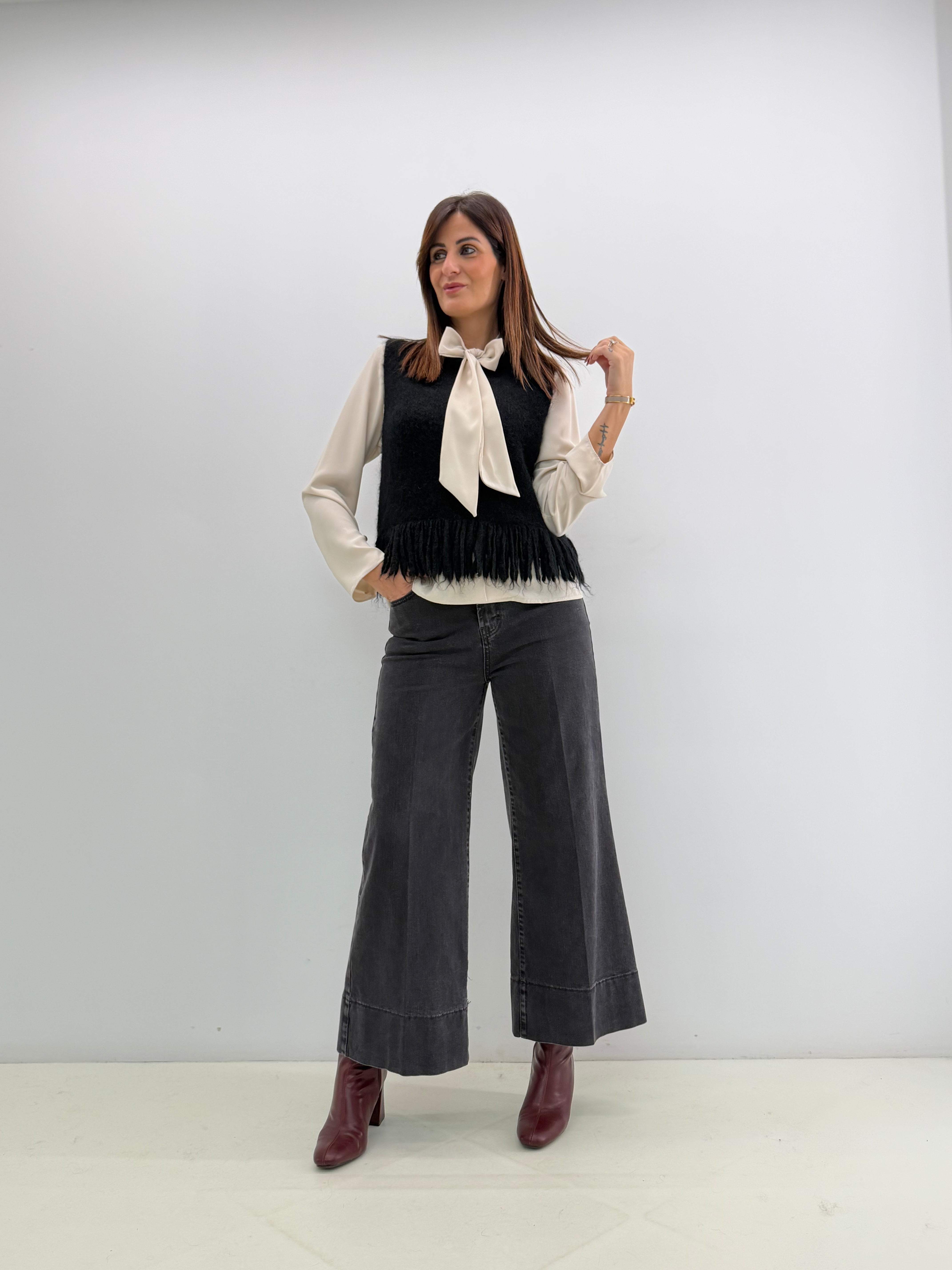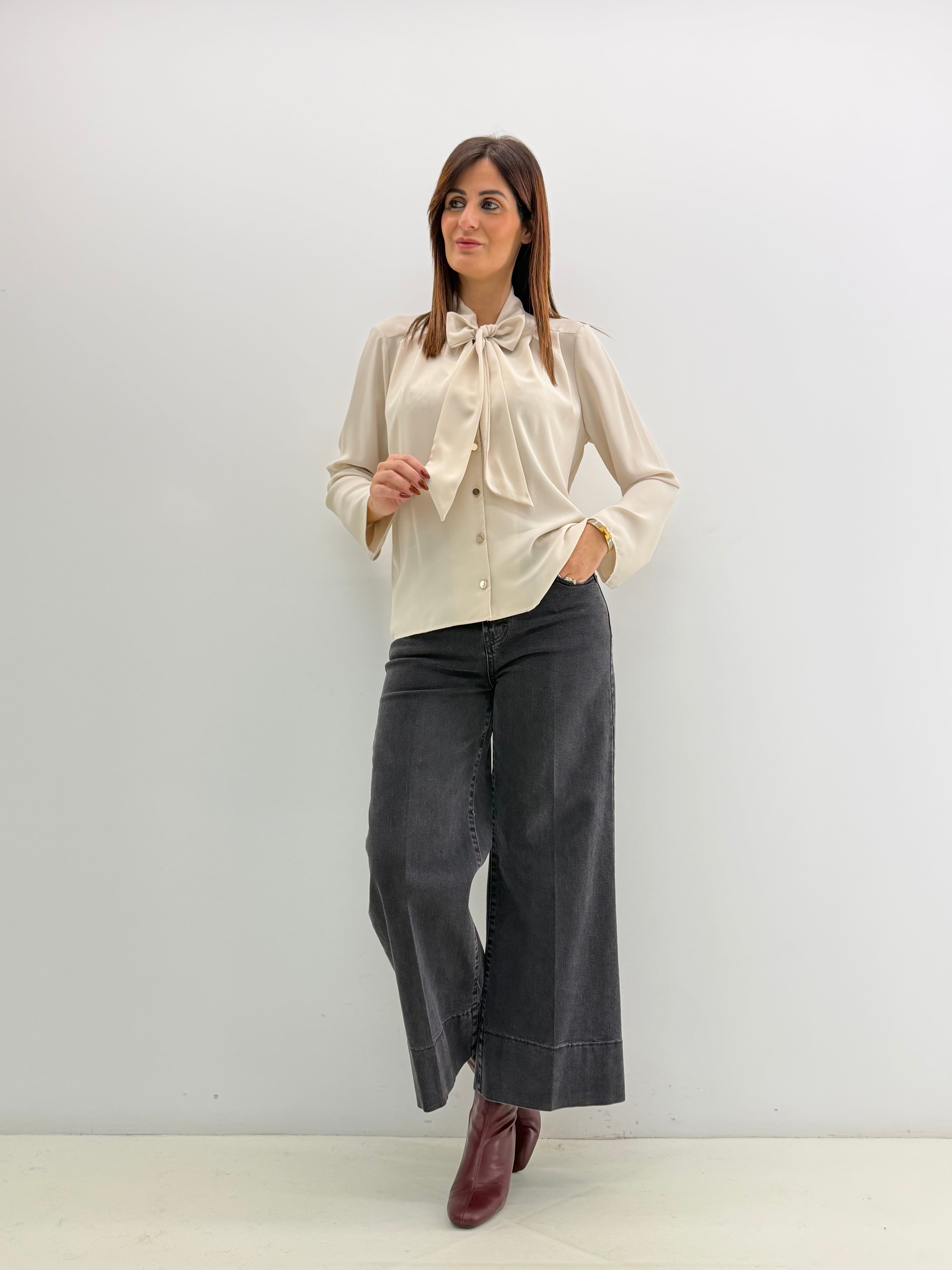 Camicia dal design fluido, tessuto fermo, caratterizzata da un raffinato fiocco al collo e leggere pieghe sulle spalle che ne esaltano la linea. Chiusura con bottoni davanti. Vestibilità a taglie.