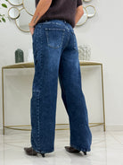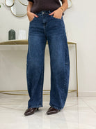 Jeans elasticizzato, modello baggy. Chiusura frontale con cerniera e bottone, modello 5 tasche. Vestibilità a taglie