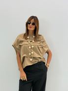 Blusa in misto viscosa, scollo asimmetrico, manica più lunga nella parte sinistra, arricciature sul davanti. Stondata sul davanti e più lunga dietro. Orlo finale più ristretto. Vestibilità comoda.