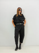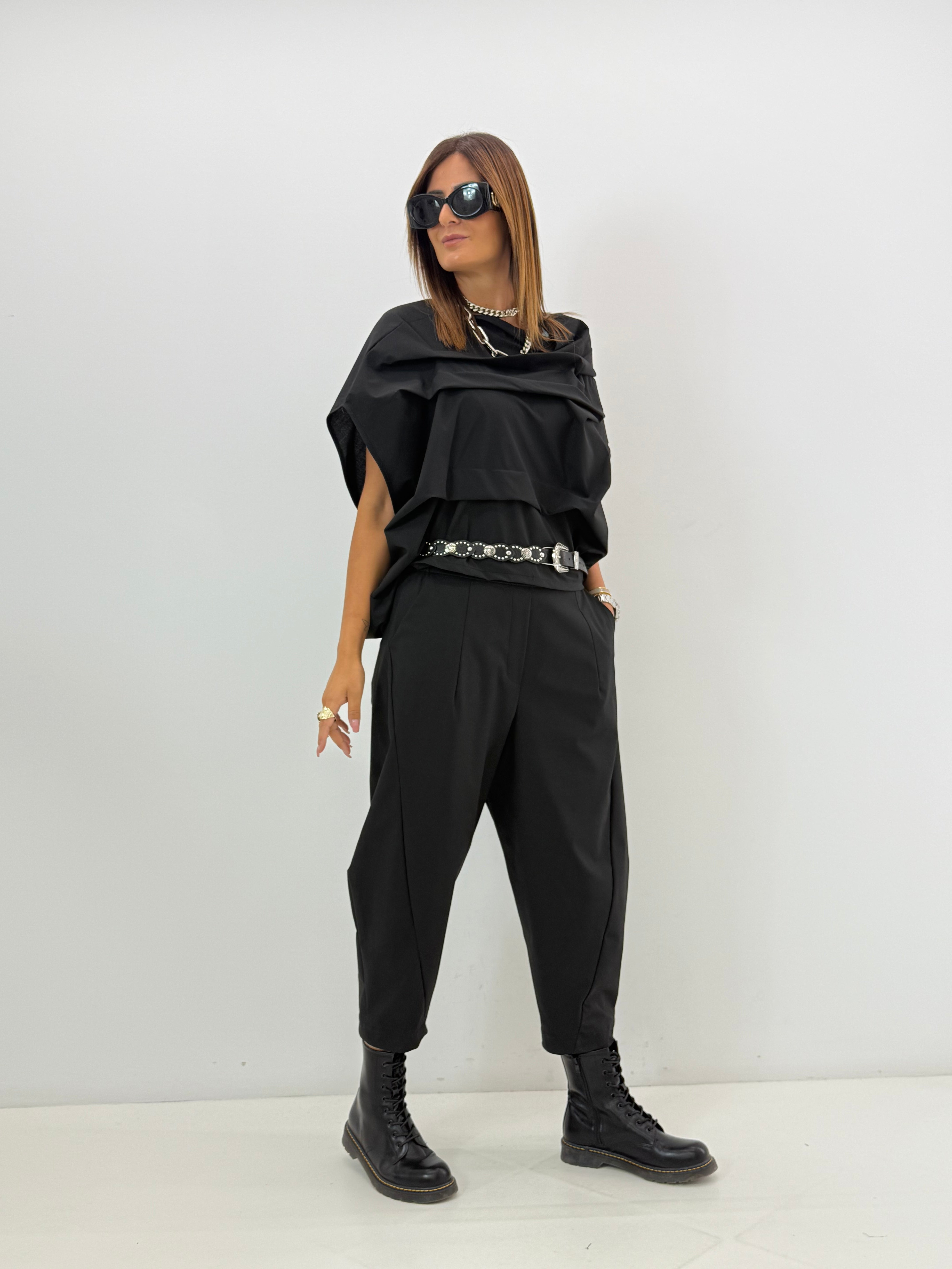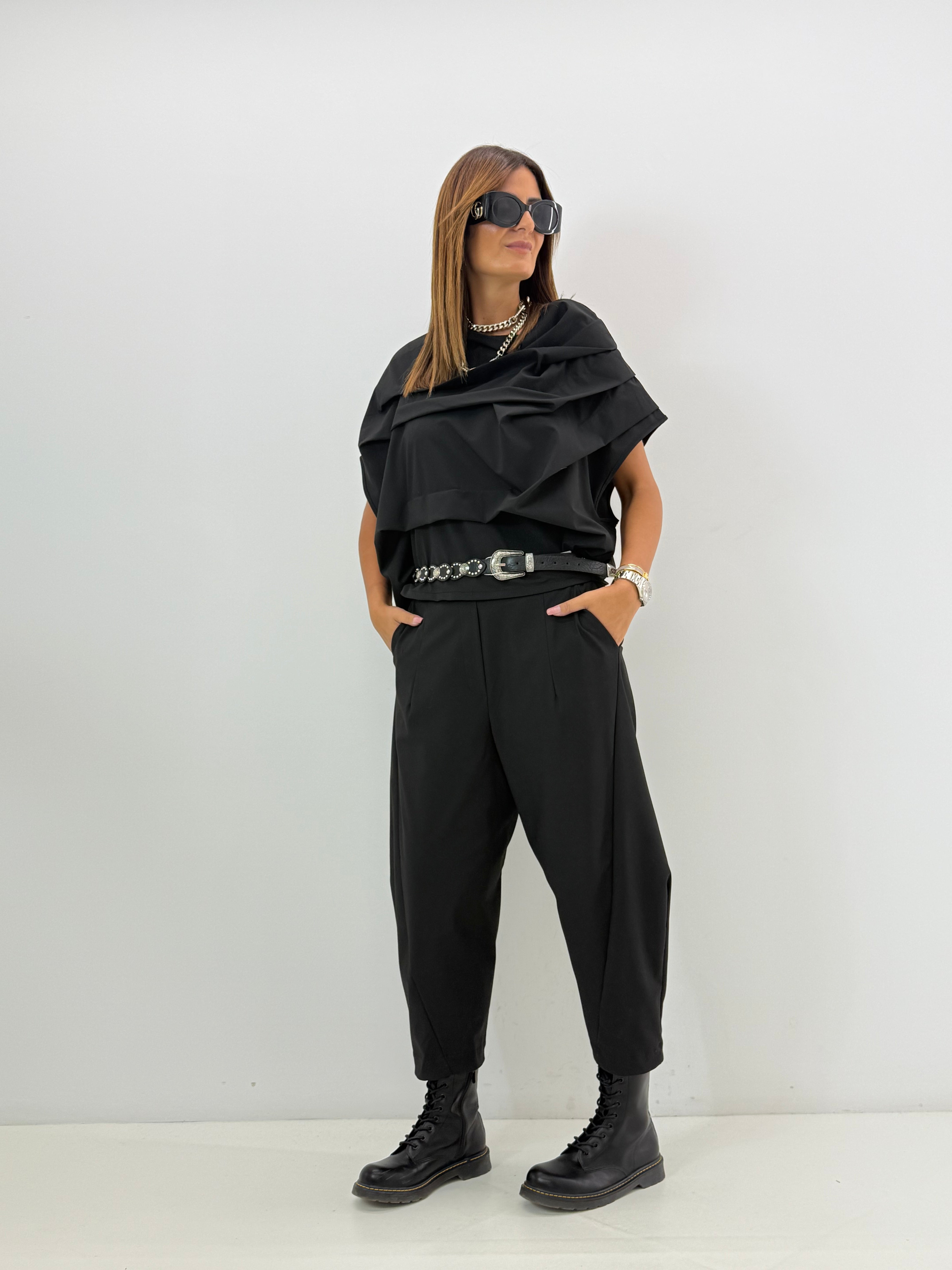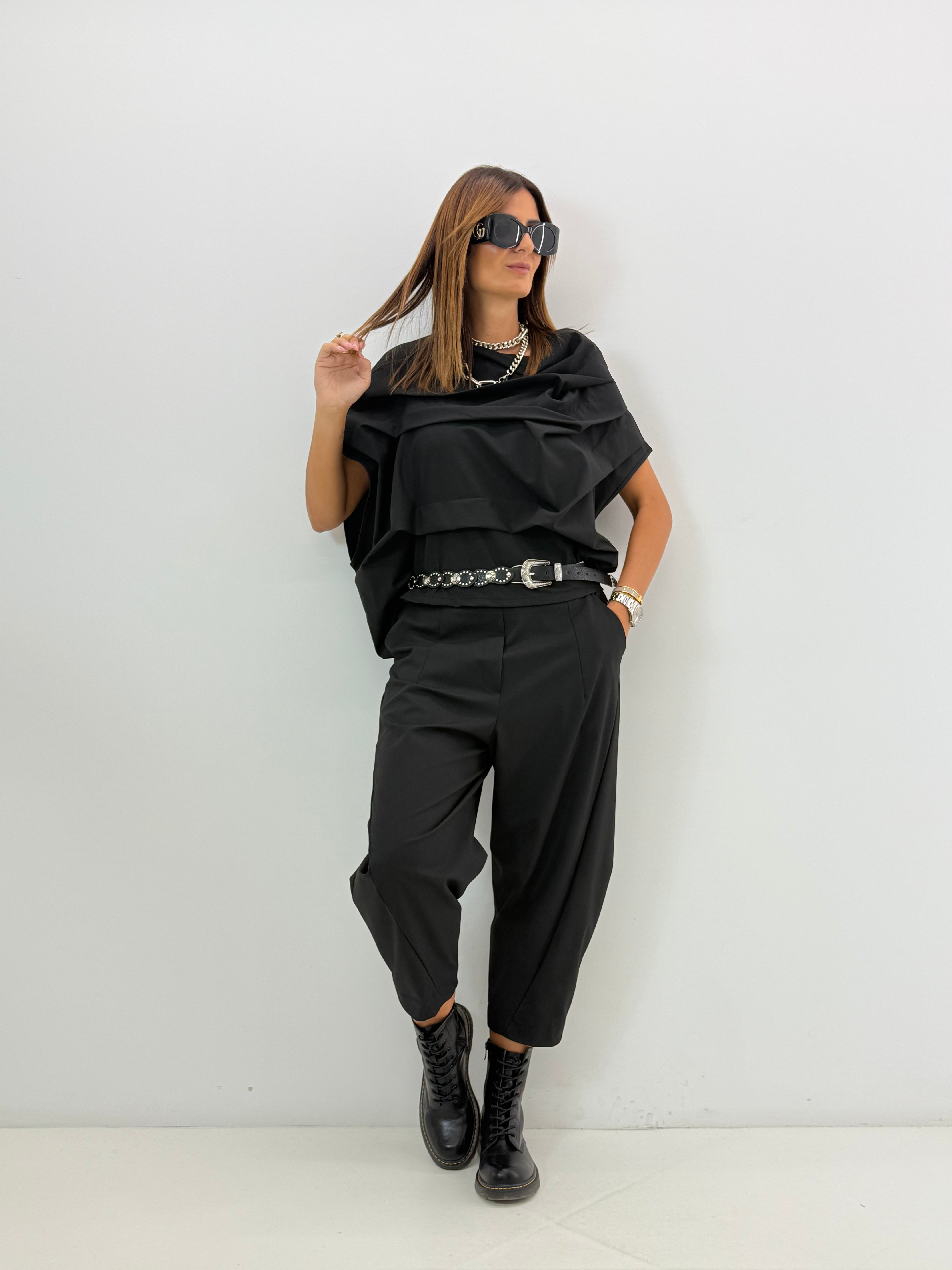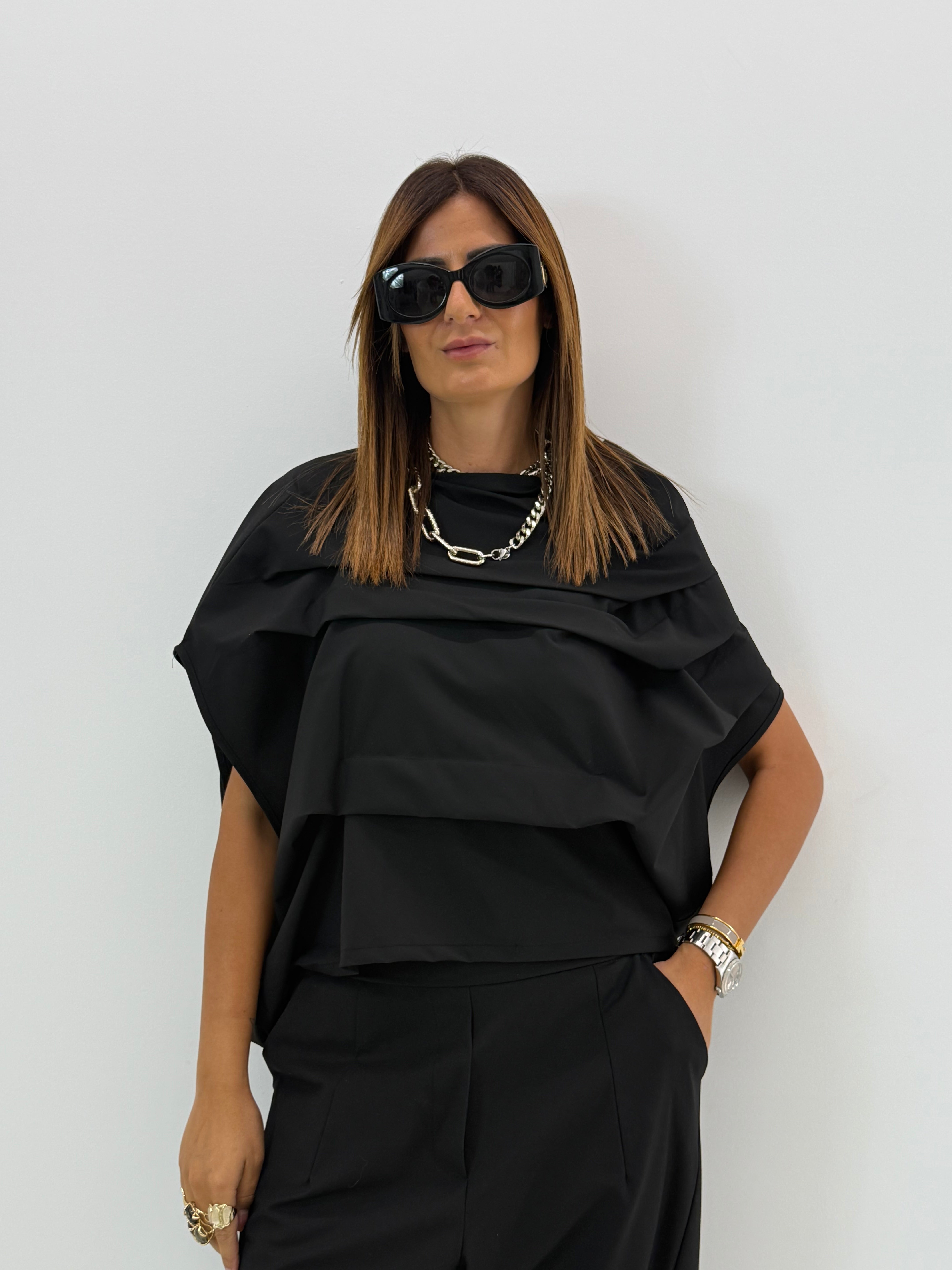 Blusa in misto viscosa, scollo asimmetrico, manica più lunga nella parte sinistra, arricciature sul davanti. Stondata sul davanti e più lunga dietro. Orlo finale più ristretto. Vestibilità comoda.
