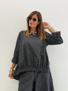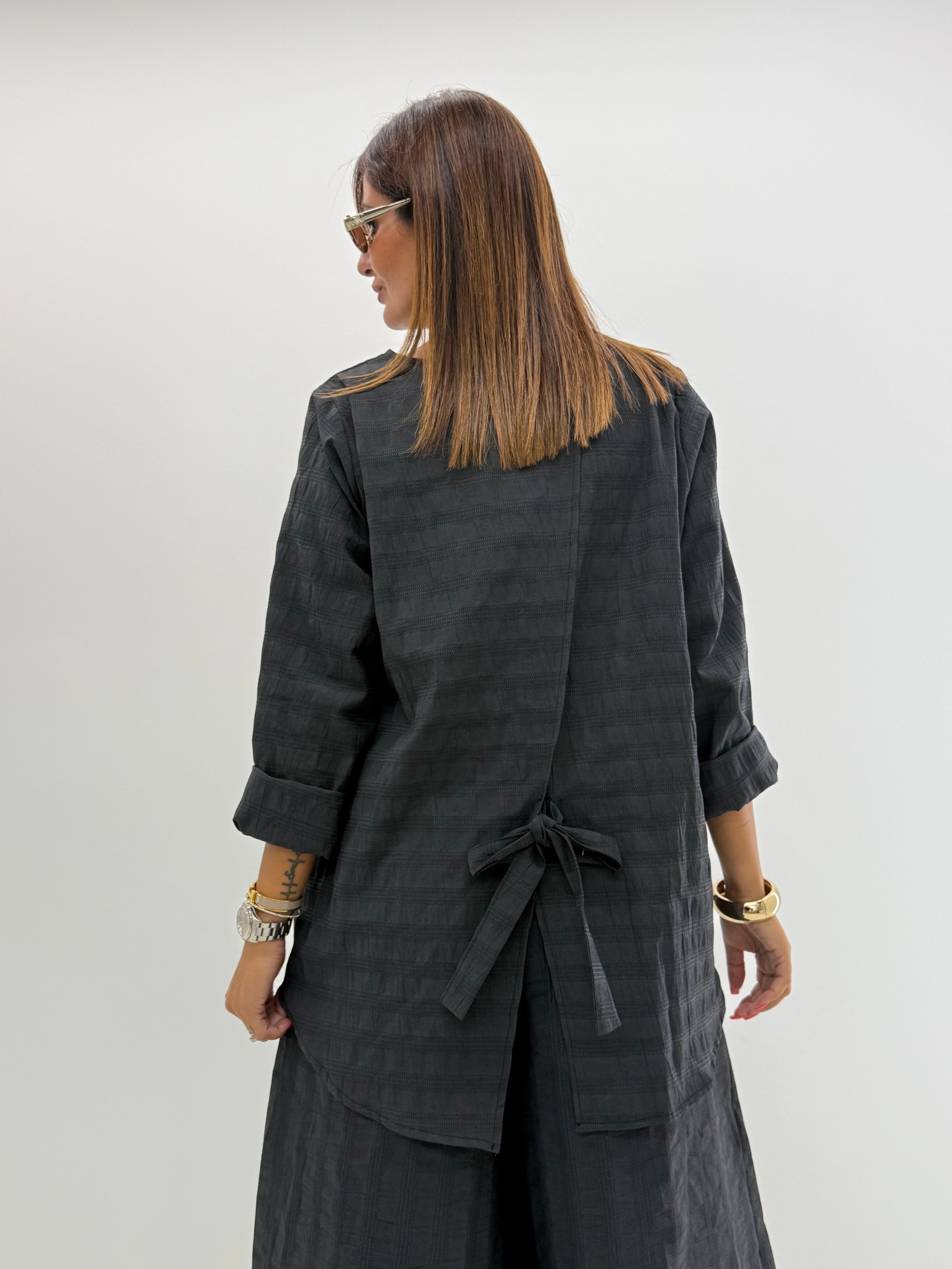 Blusa in misto cotone, fantasia a righe tono su tono. Scollo rotondo e maniche lunghe. Stondata sul davanti con arricciatura sull'orlo. Incrocio dietro con laccetto per chiusura e spacchetto. Retro più lungo. Vestibilità comoda.
