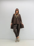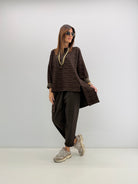 Blusa in misto viscosa, scollo rotondo e spalla morbida. Maniche lunghe. Taglio morbido e leggermente svasato, più corta sul davanti con spacchetti laterali, più lunga nella parte posteriore . Senza chiusure. Comoda vestibilità.