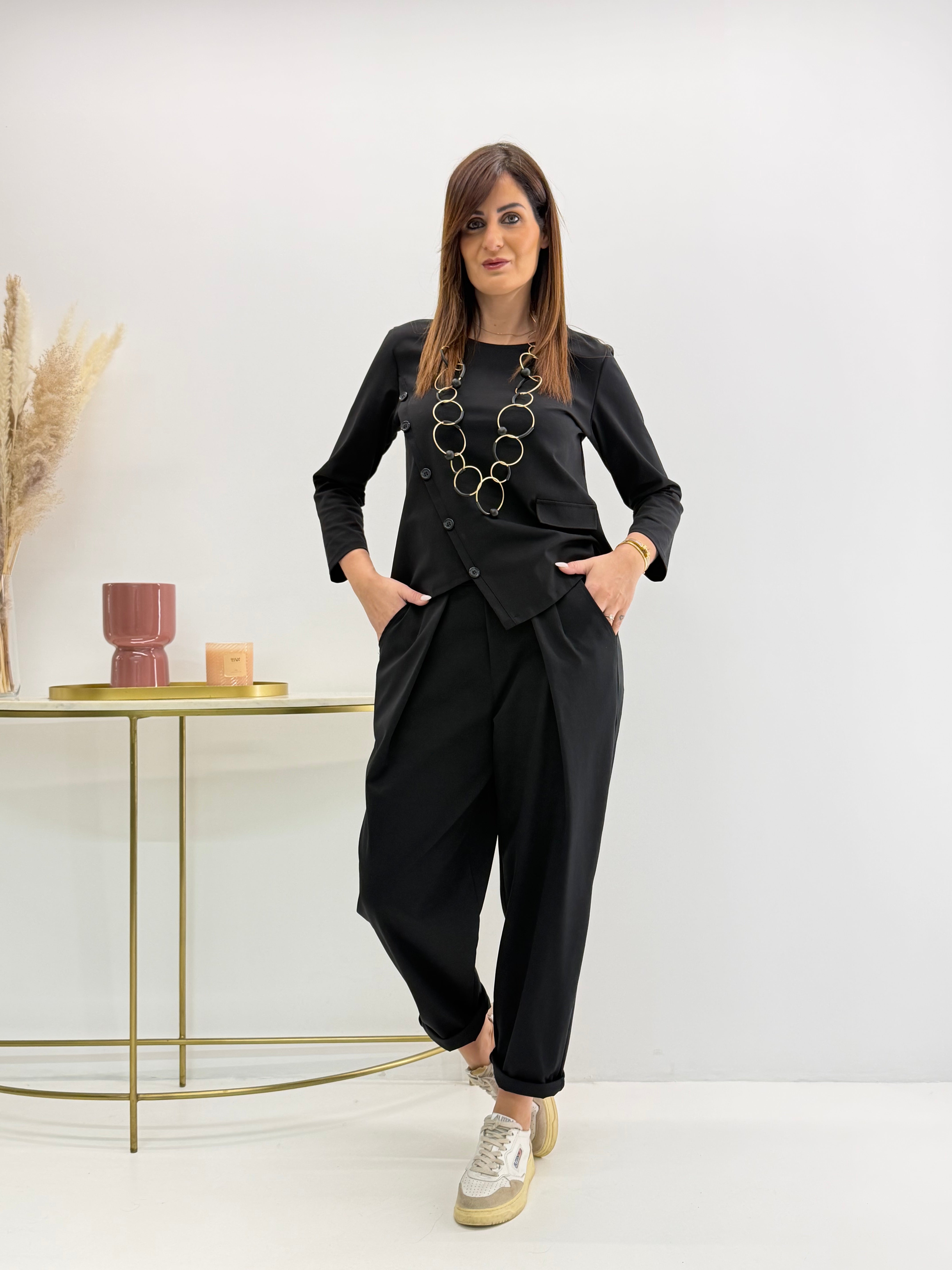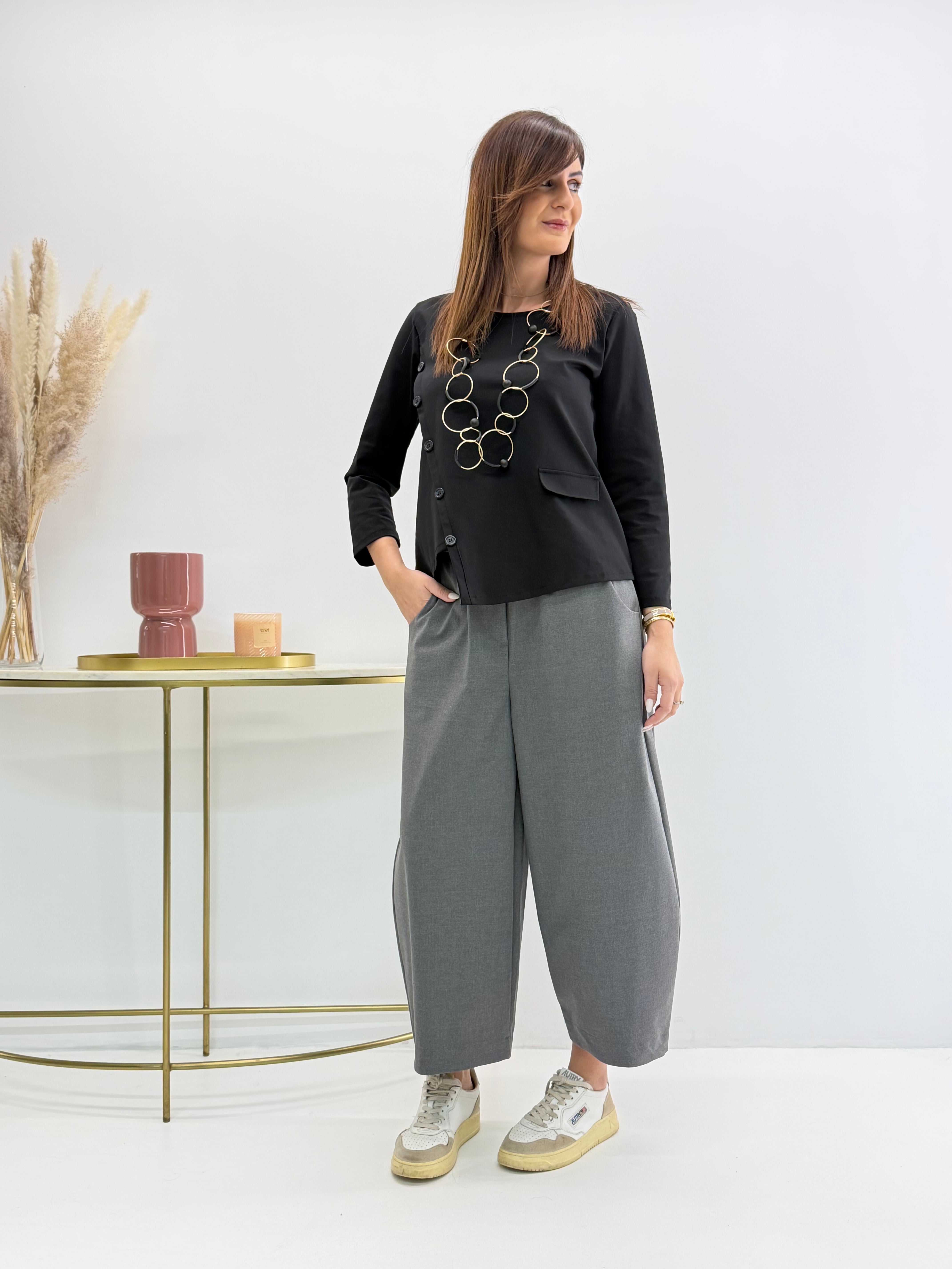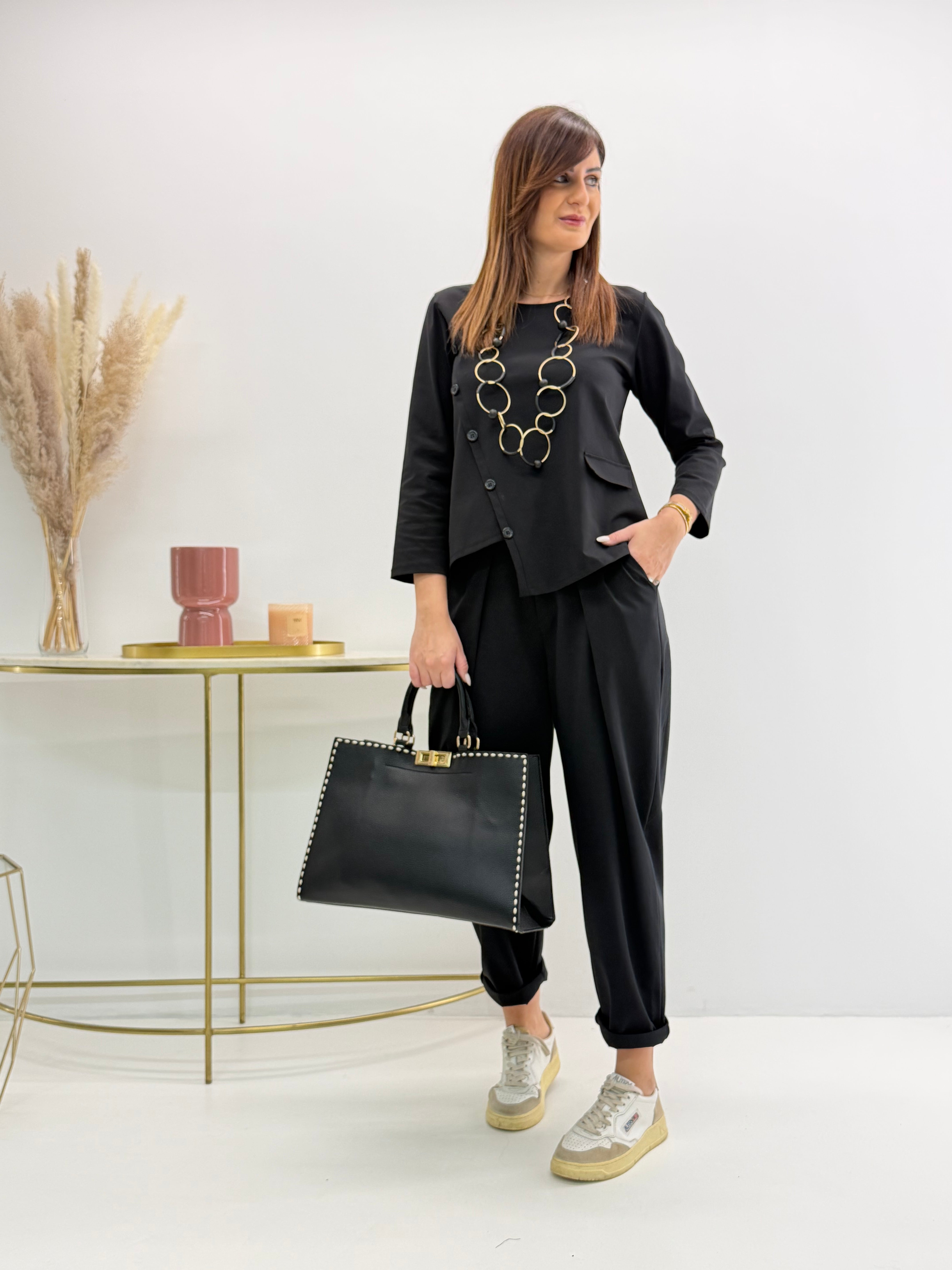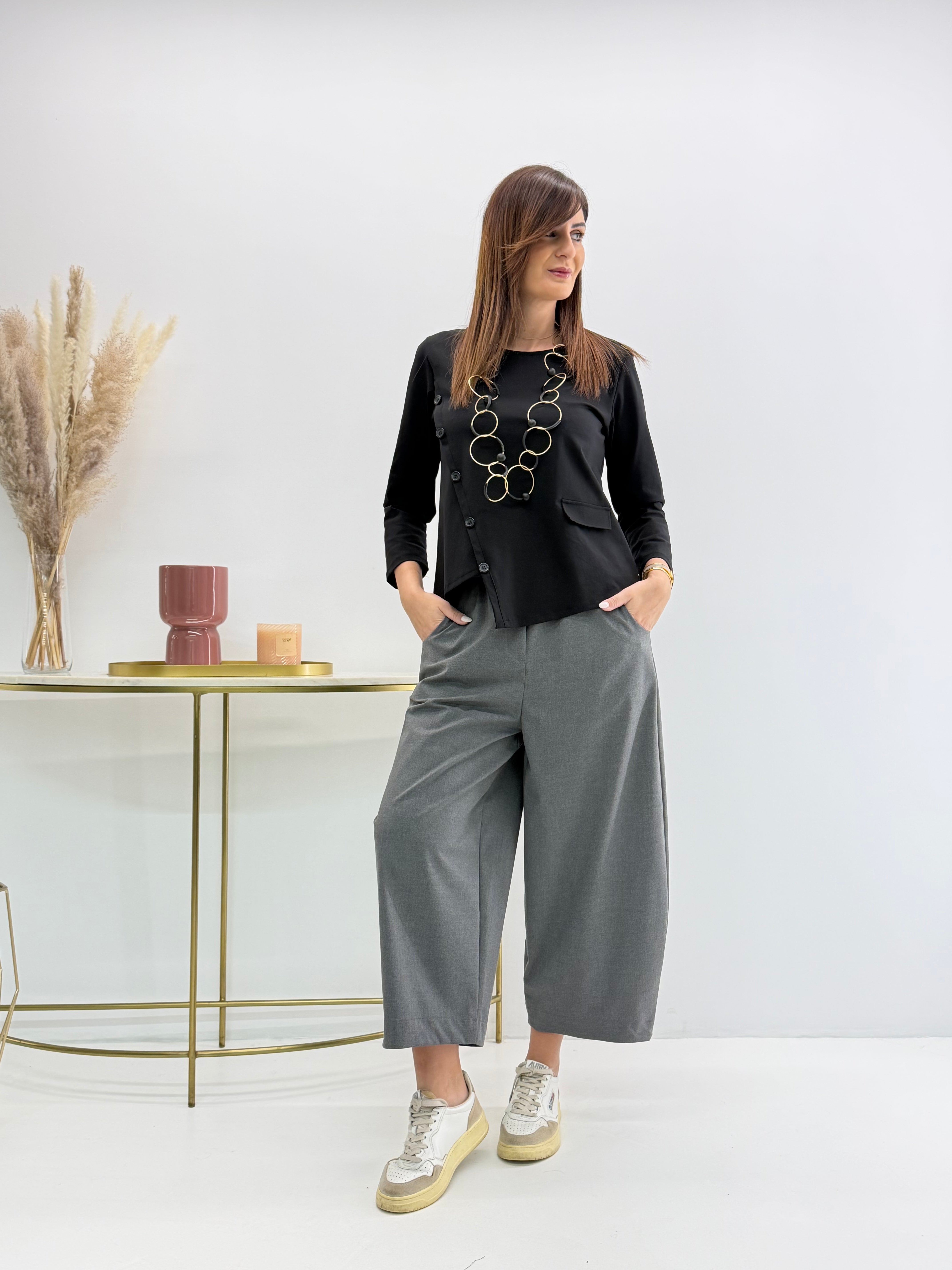 Blusa asimmetrica in punto Milano, applicazione di bottoncini in diagonale. Scollo rotondo. Spalla regolare e maniche lunghe, finta patta sul davanti.