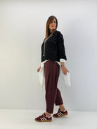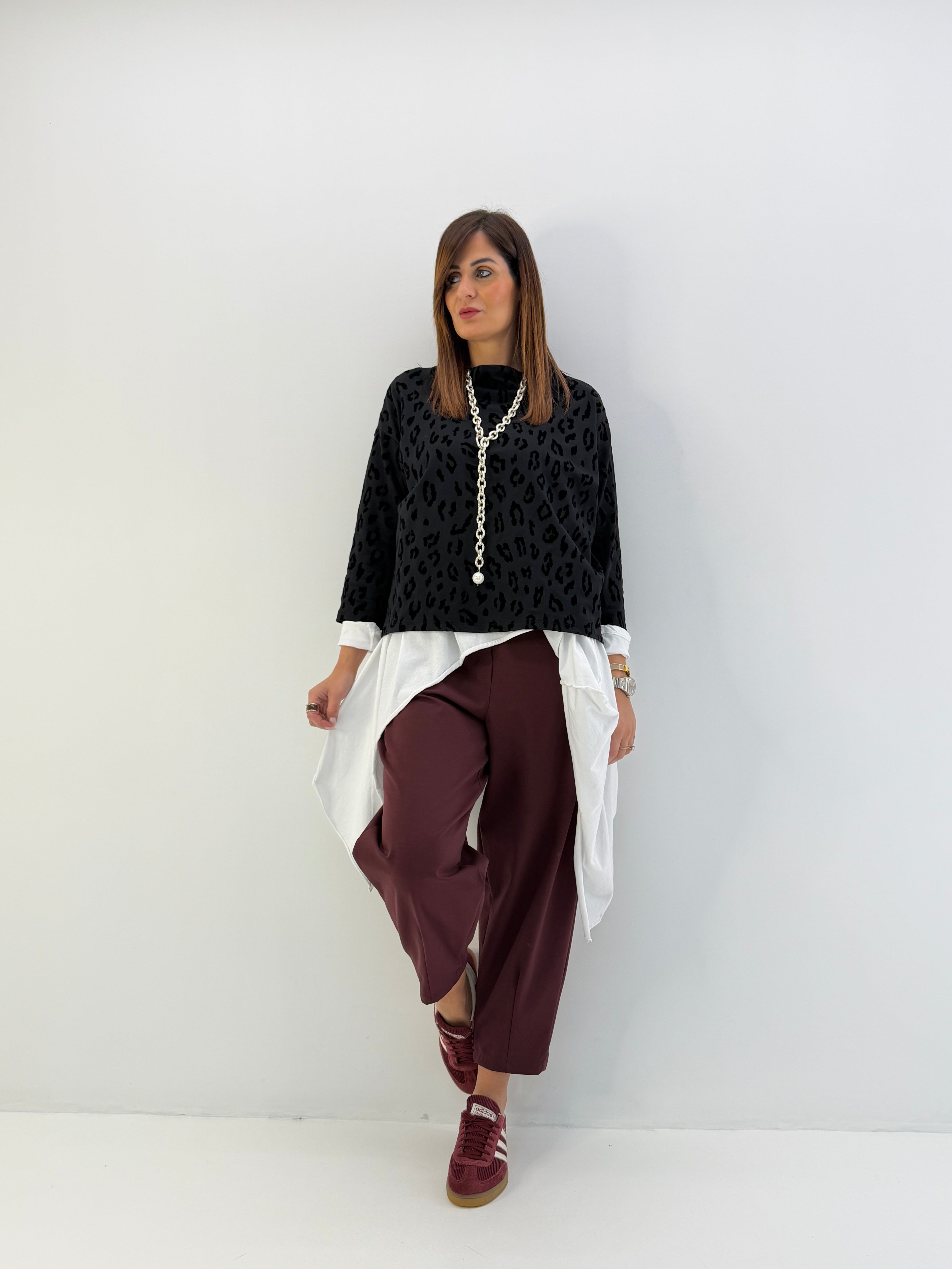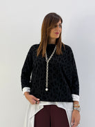 Maglietta in tessuto maculato in misto cotone. Scollo rotondo con colletto. Spalla calata e maniche lunghe. Taglio squadrato. Vestibilità ampia e comoda.