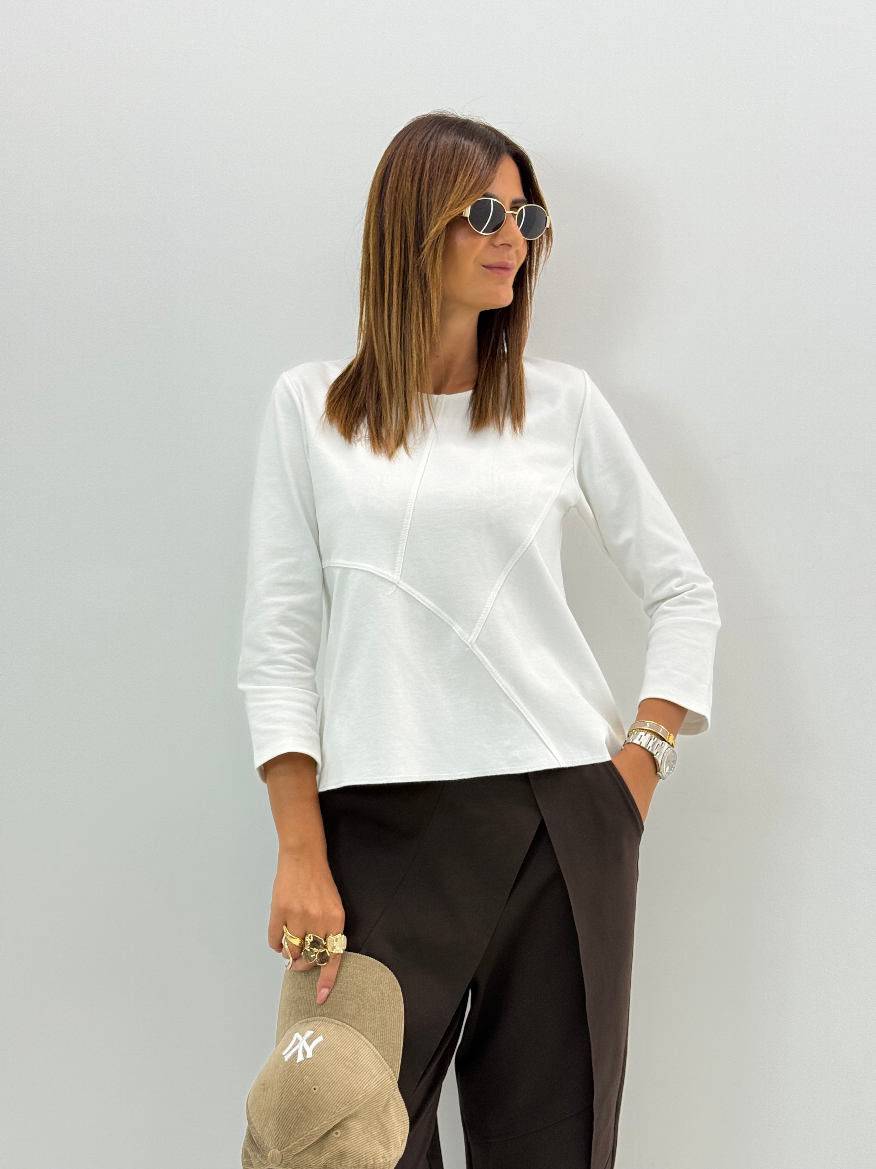 Blusa in punto Milano, cuciture a vista. Scollo rotondo, spacchetto dietro. Vestibilità comoda.