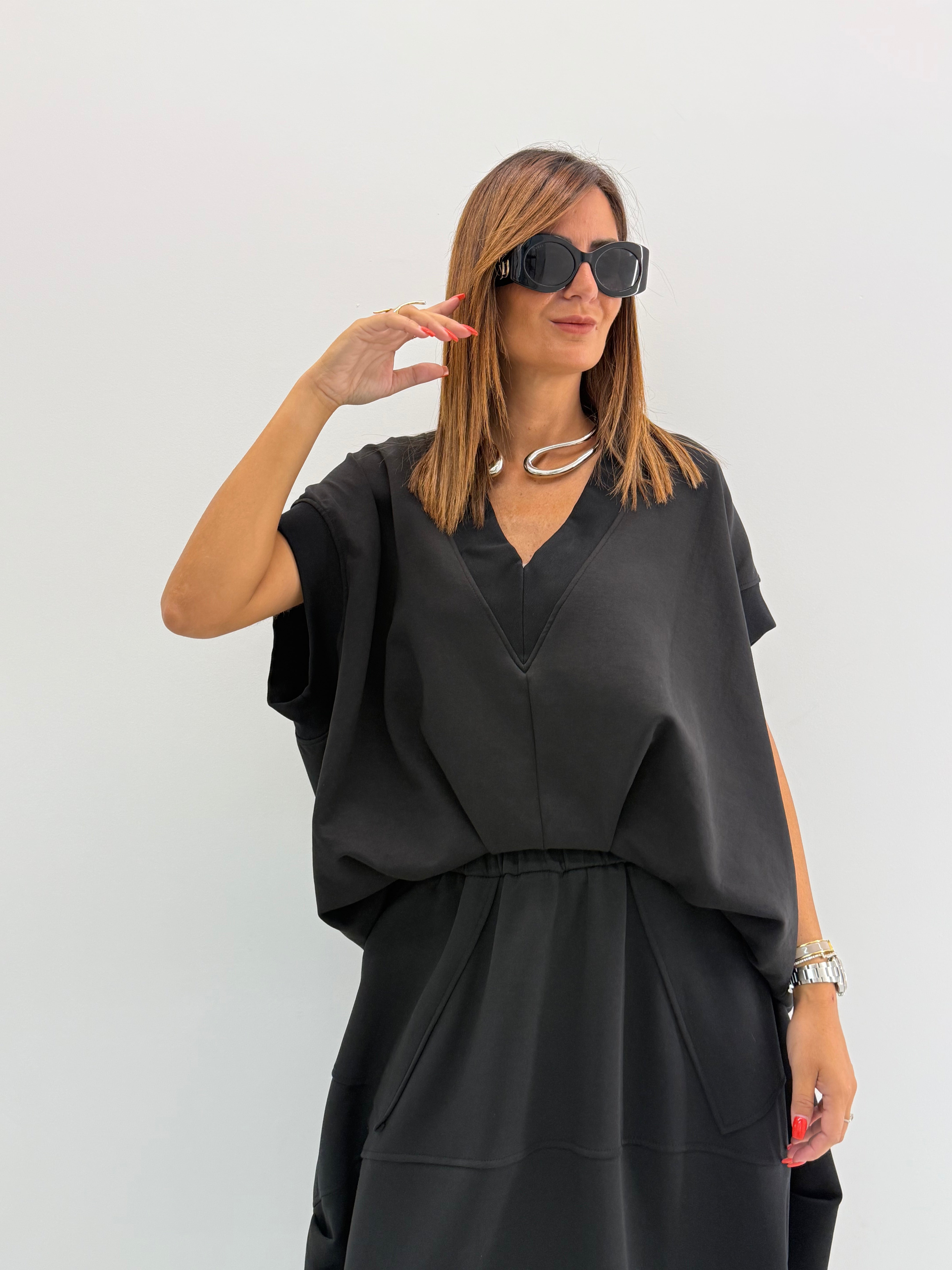 Blusa modello over con maniche corte a pipistrello, ampio scollo a V con bordo più chiaro, effetto drappeggiato sulla parte anteriore che crea volume. Fodera interna in modal. Vestibilità ampia e comoda.