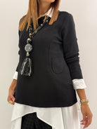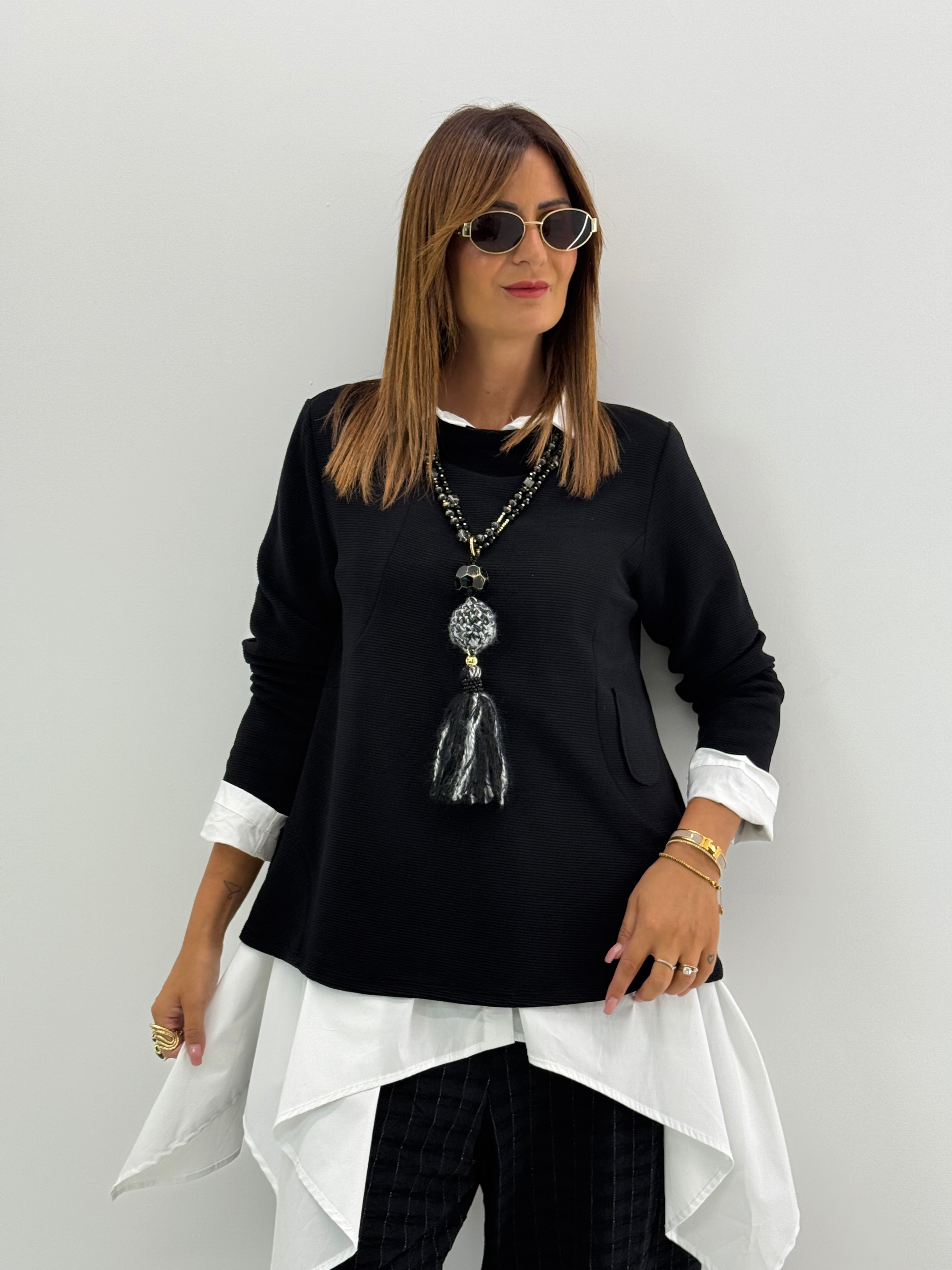 Blusa in tessuto a righe tono su tono, svasata sul fondo. Vestibilità comoda.