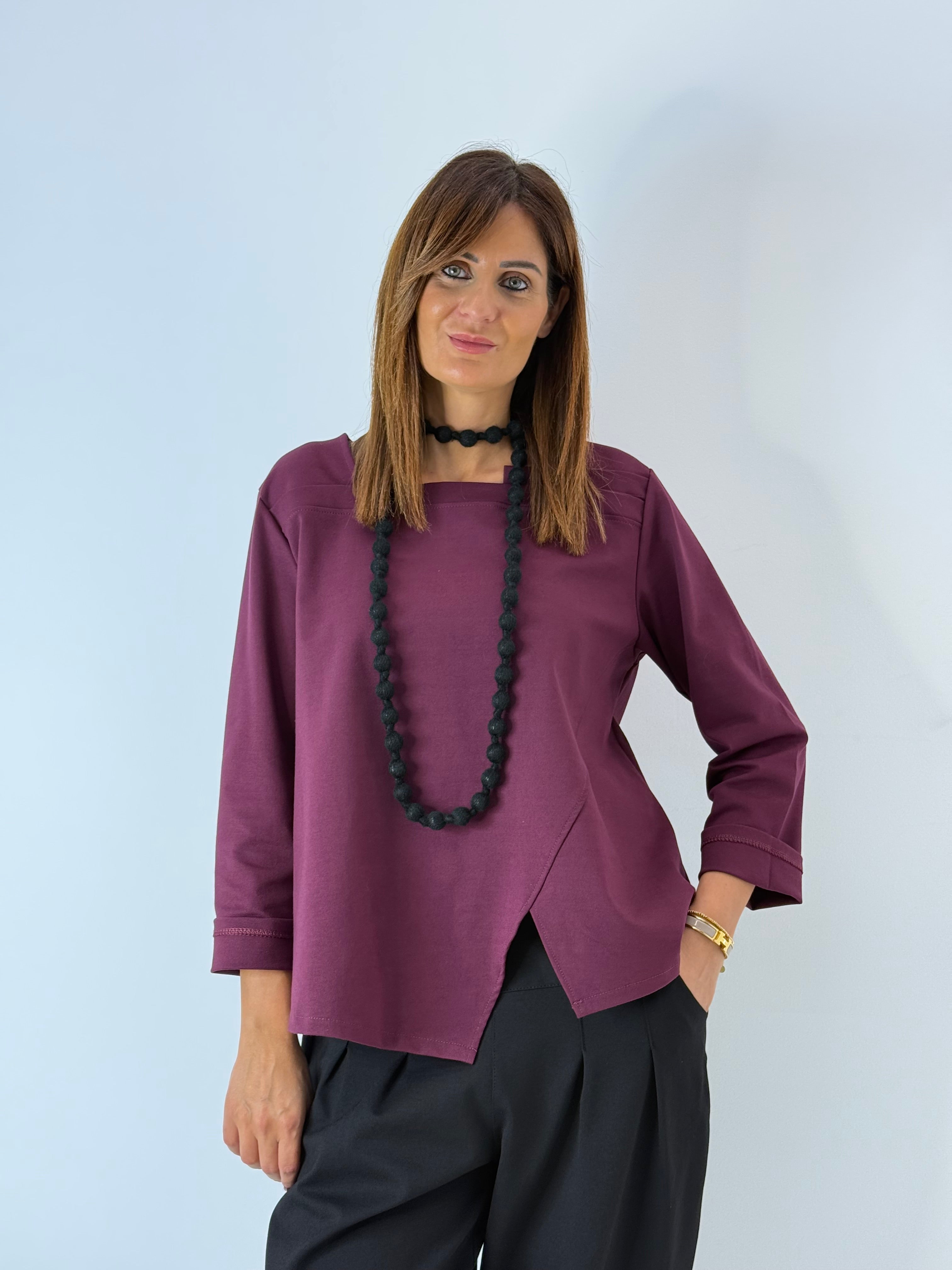 Blusa in punto Milano. Scollo asimmetrico. Spacchetto centrale. Vestibilità comoda.