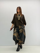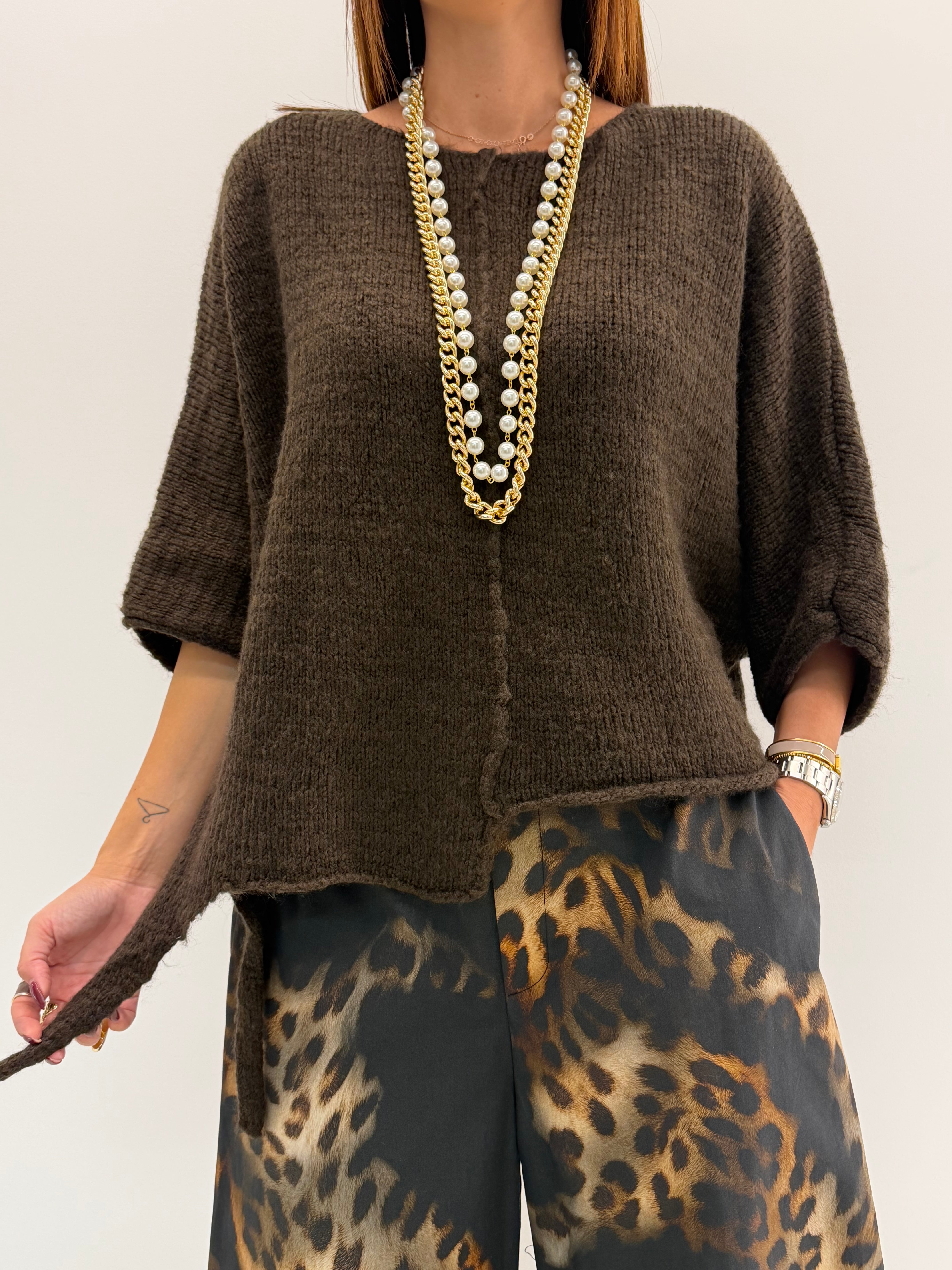 Mantella asimmetrica, cuciture a vista davanti e dietro, spacchetto laterale nella parte destra.