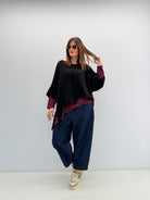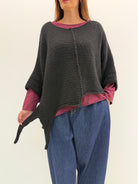 Mantella asimmetrica, cuciture a vista davanti e dietro, spacchetto laterale nella parte destra.