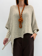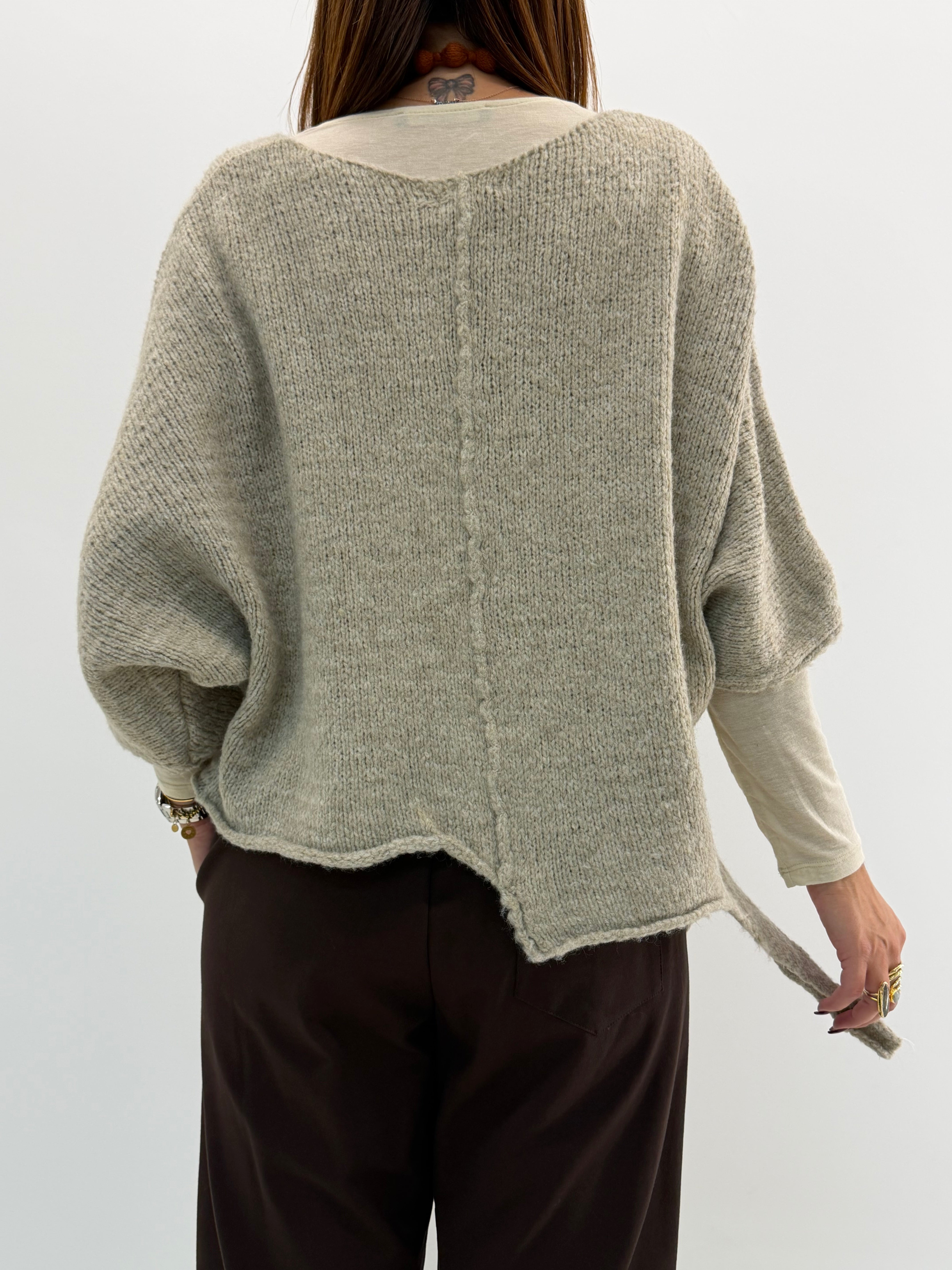 Mantella asimmetrica, cuciture a vista davanti e dietro, spacchetto laterale nella parte destra.
