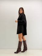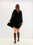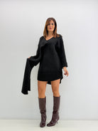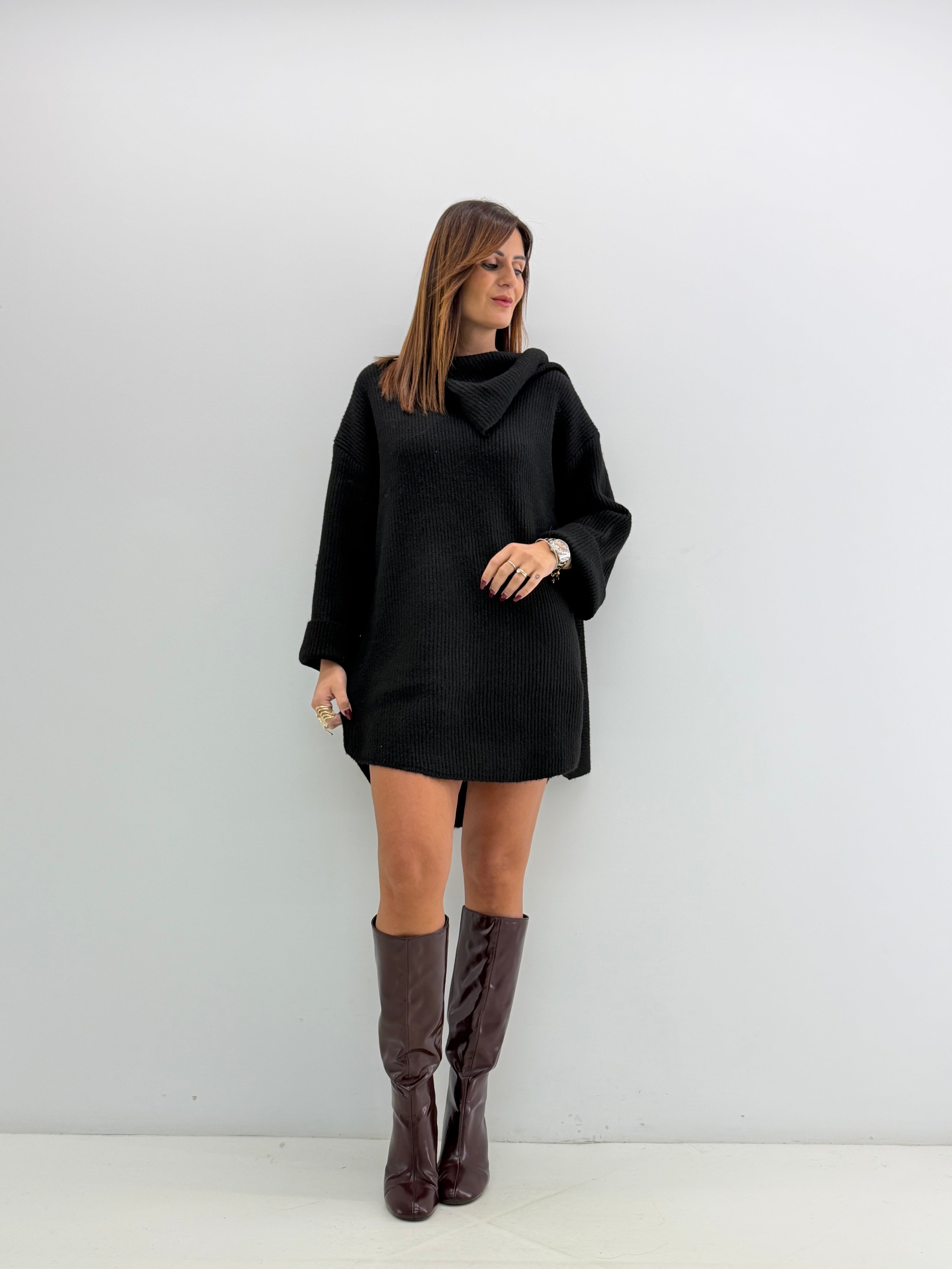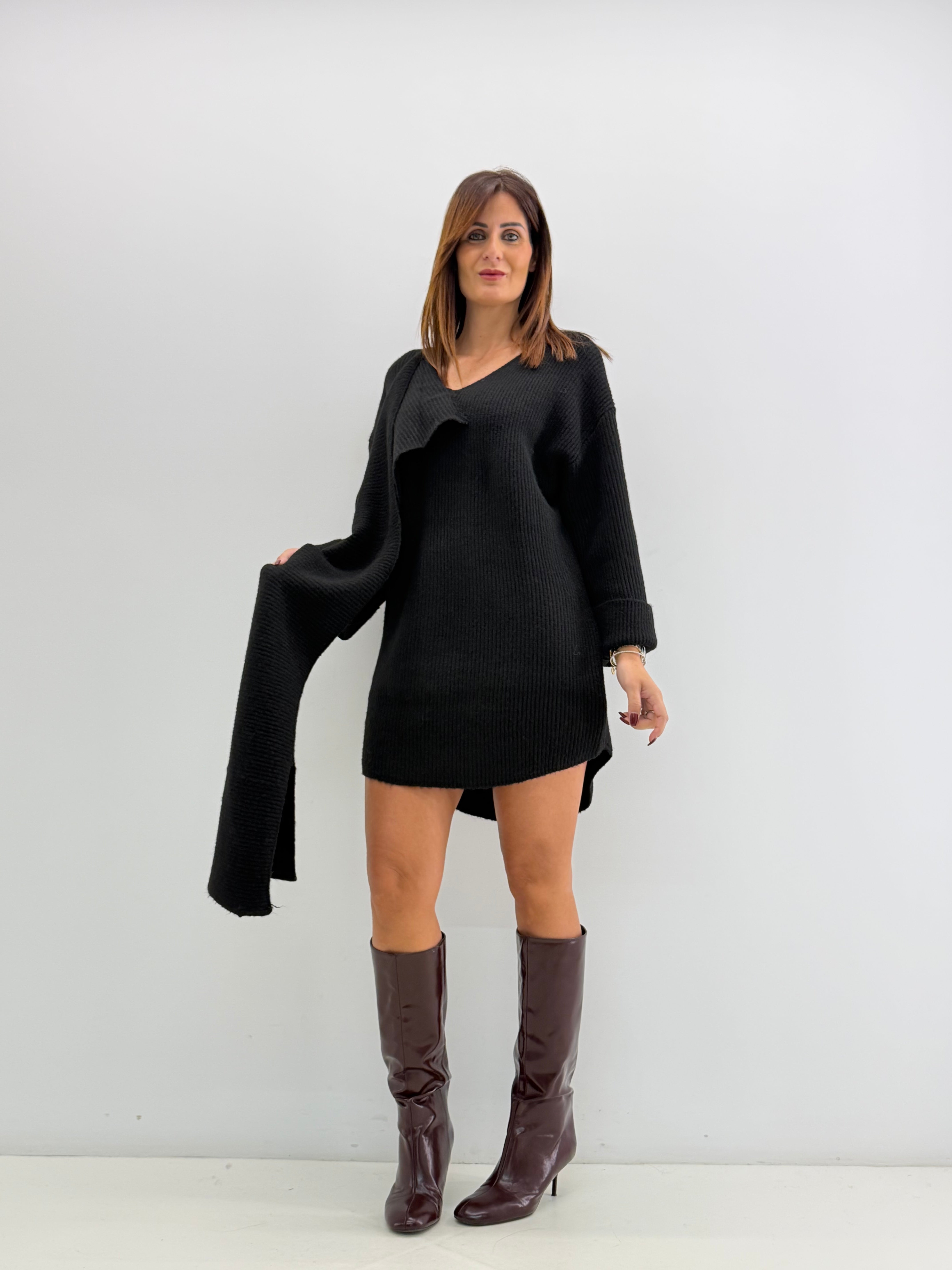 Pull in morbida maglia misto viscosa, scollo a V, dettaglio di tessuto applicato allo scollo, effetto sciarpa.