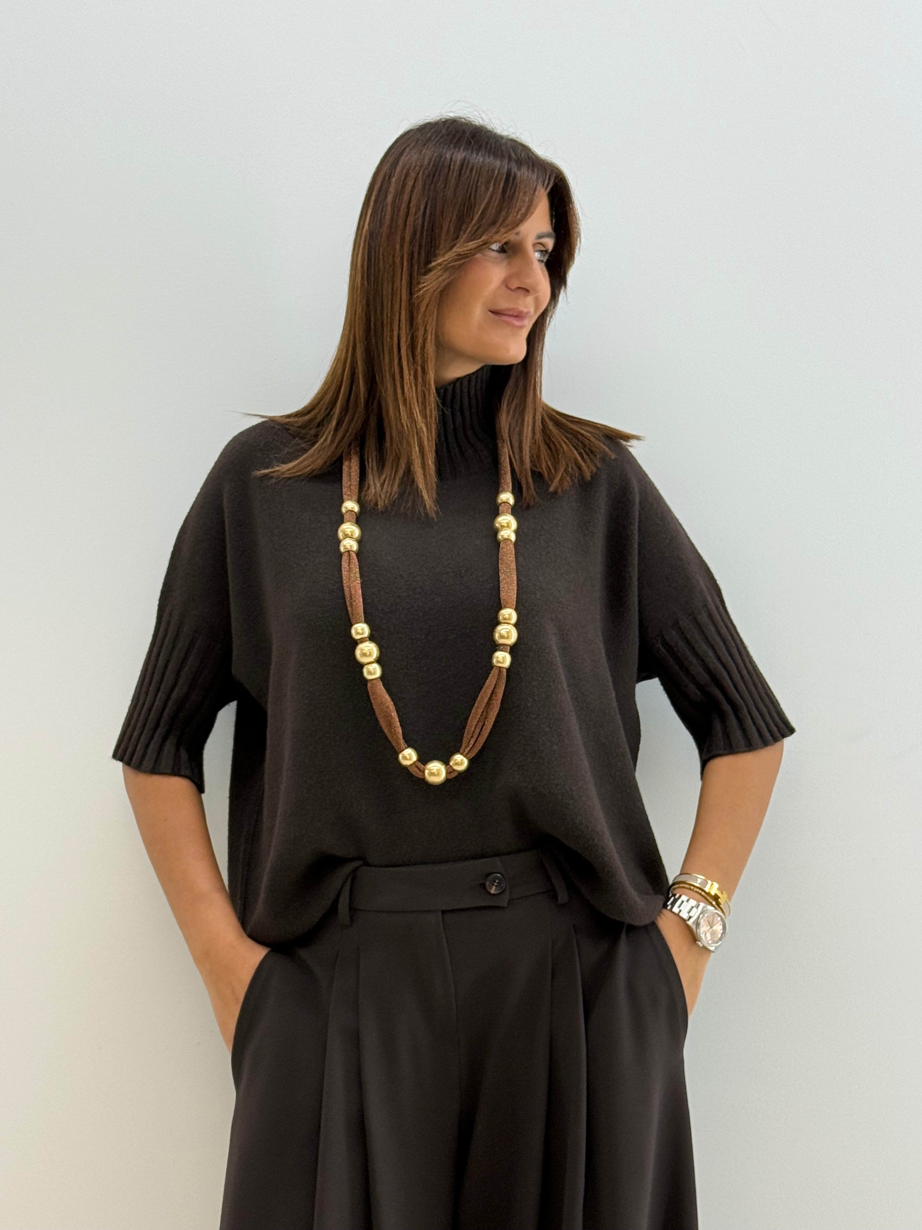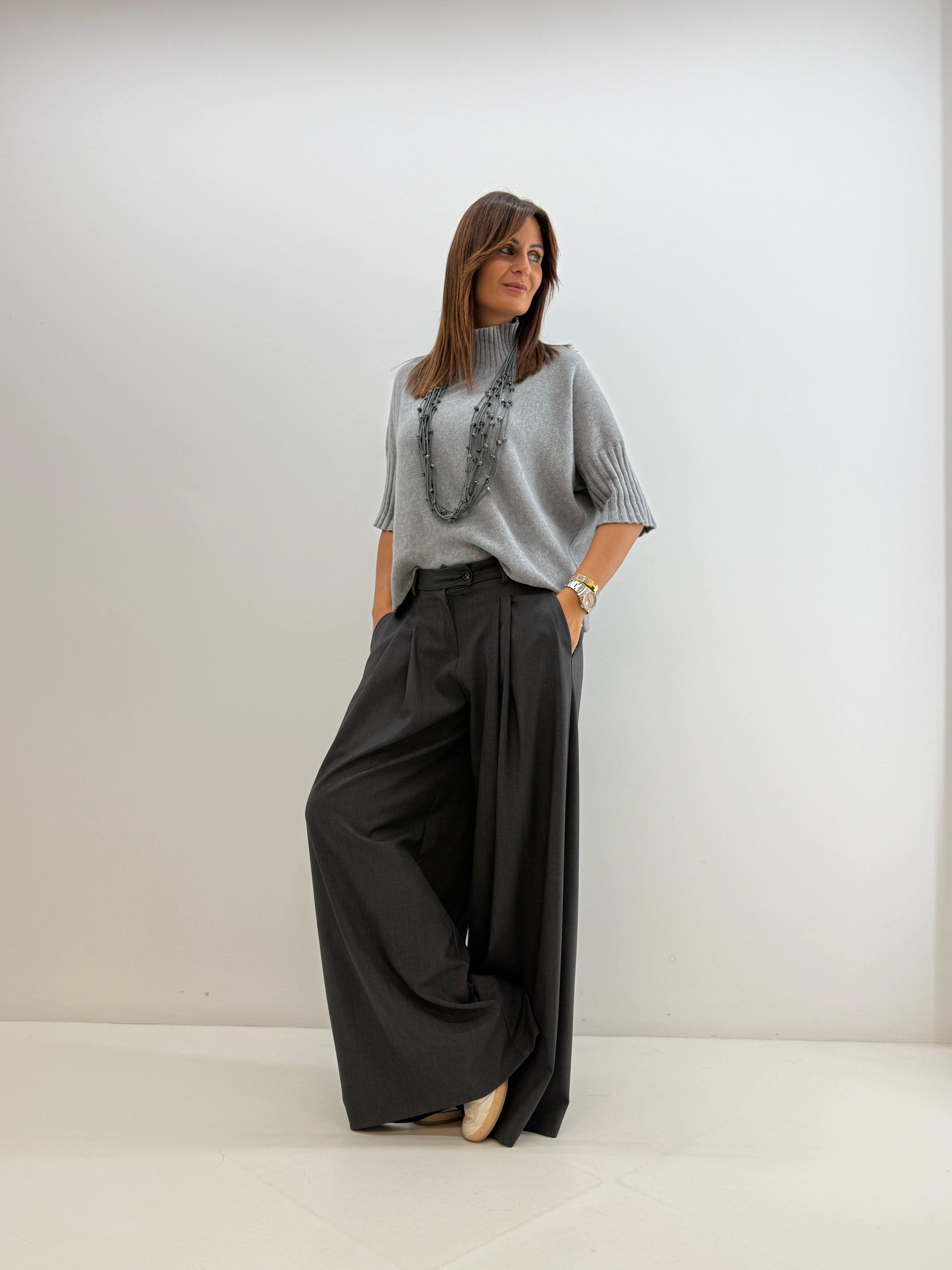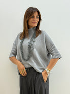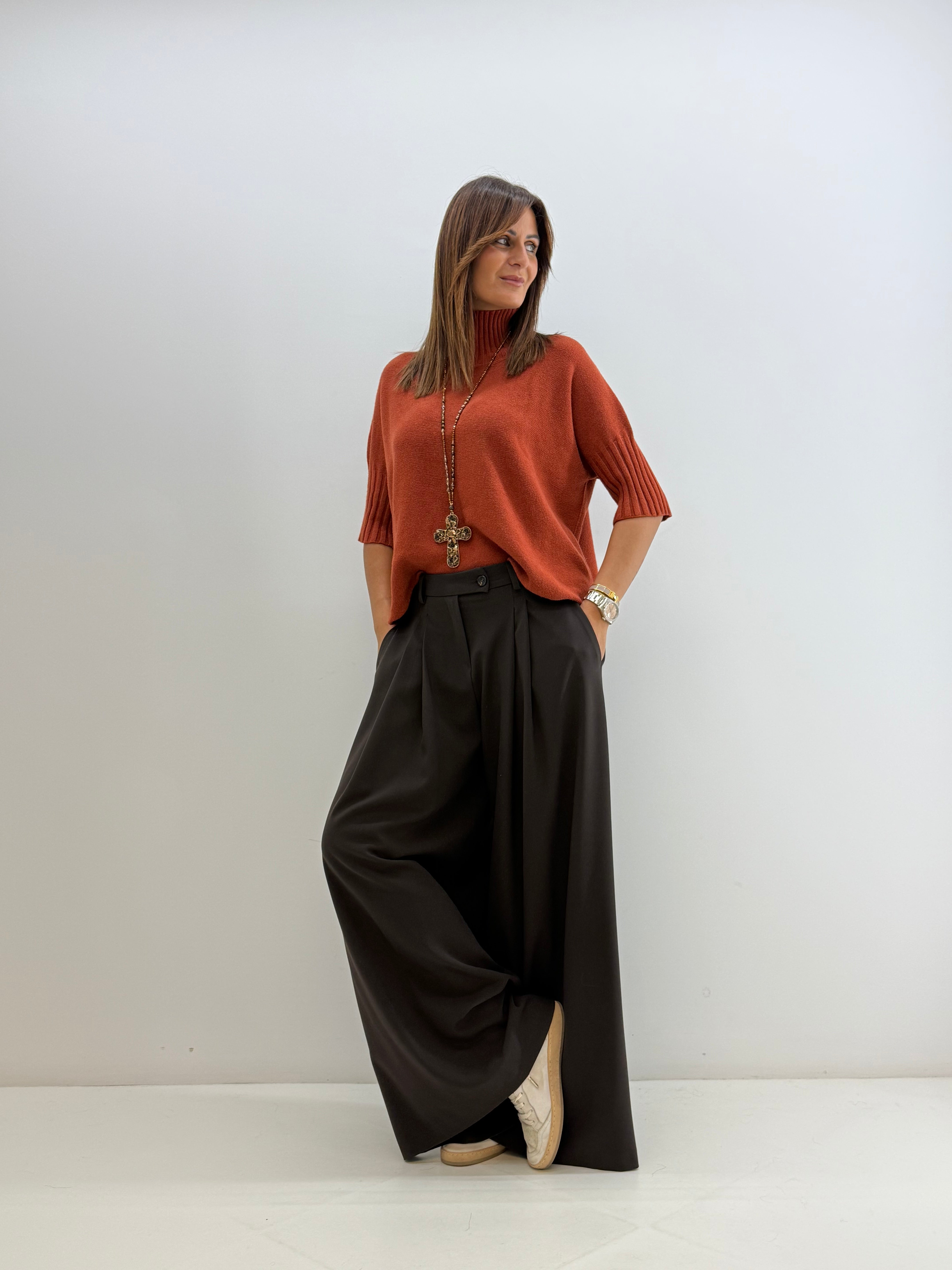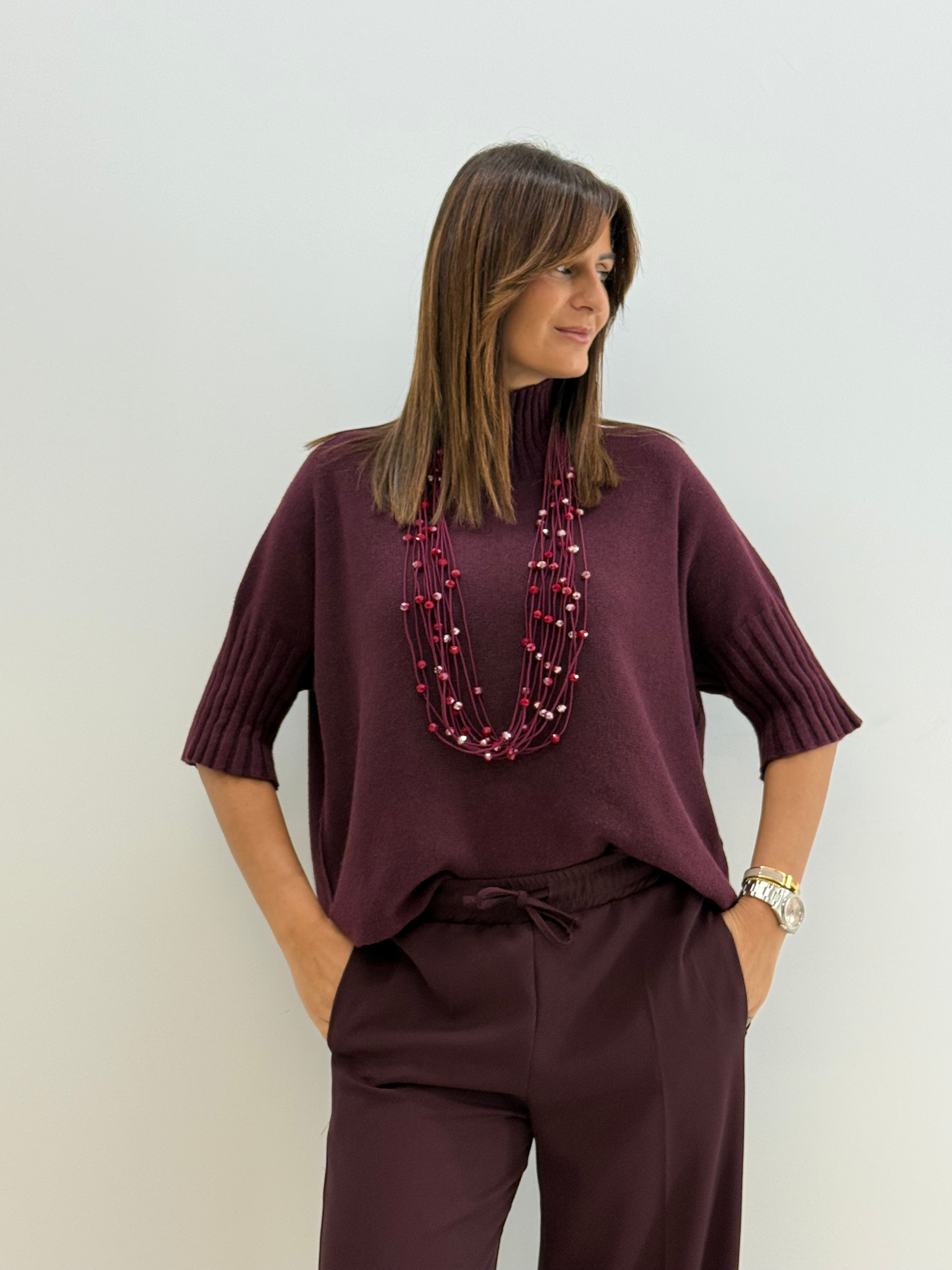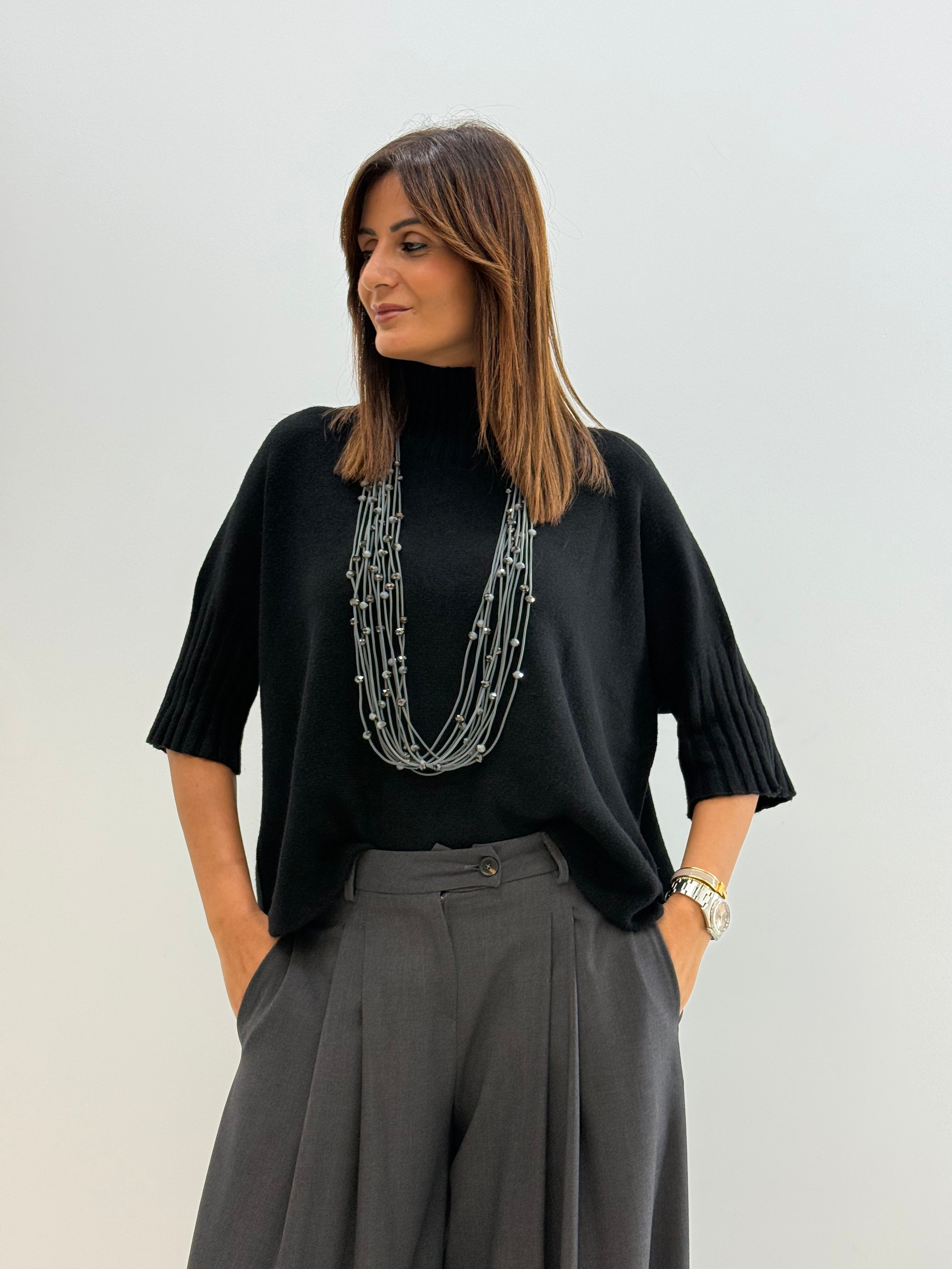 Pull in morbida maglia misto viscosa, maniche a 3/4, collo alto e morbido, vestibilità comoda.