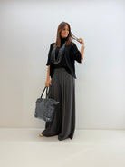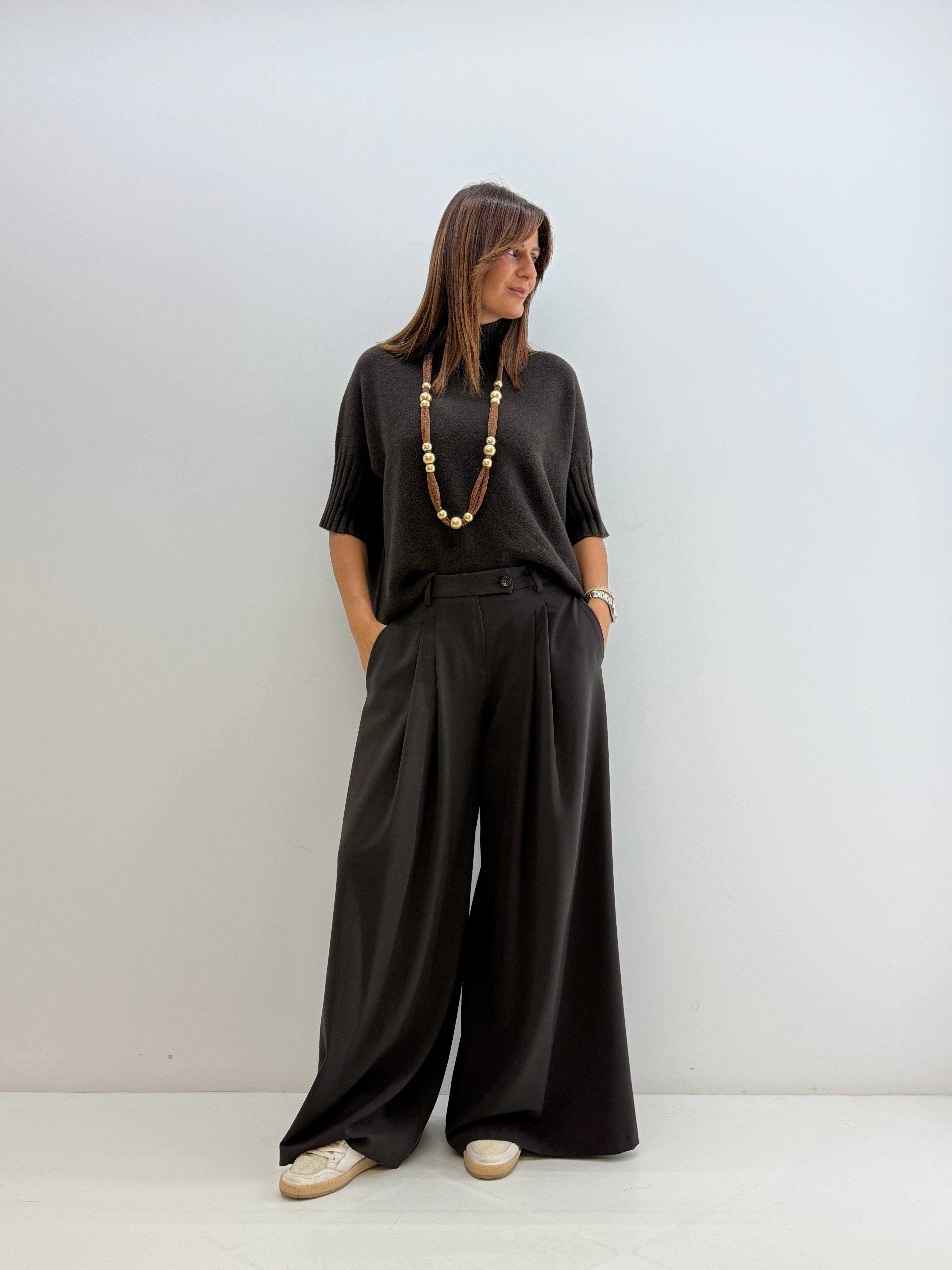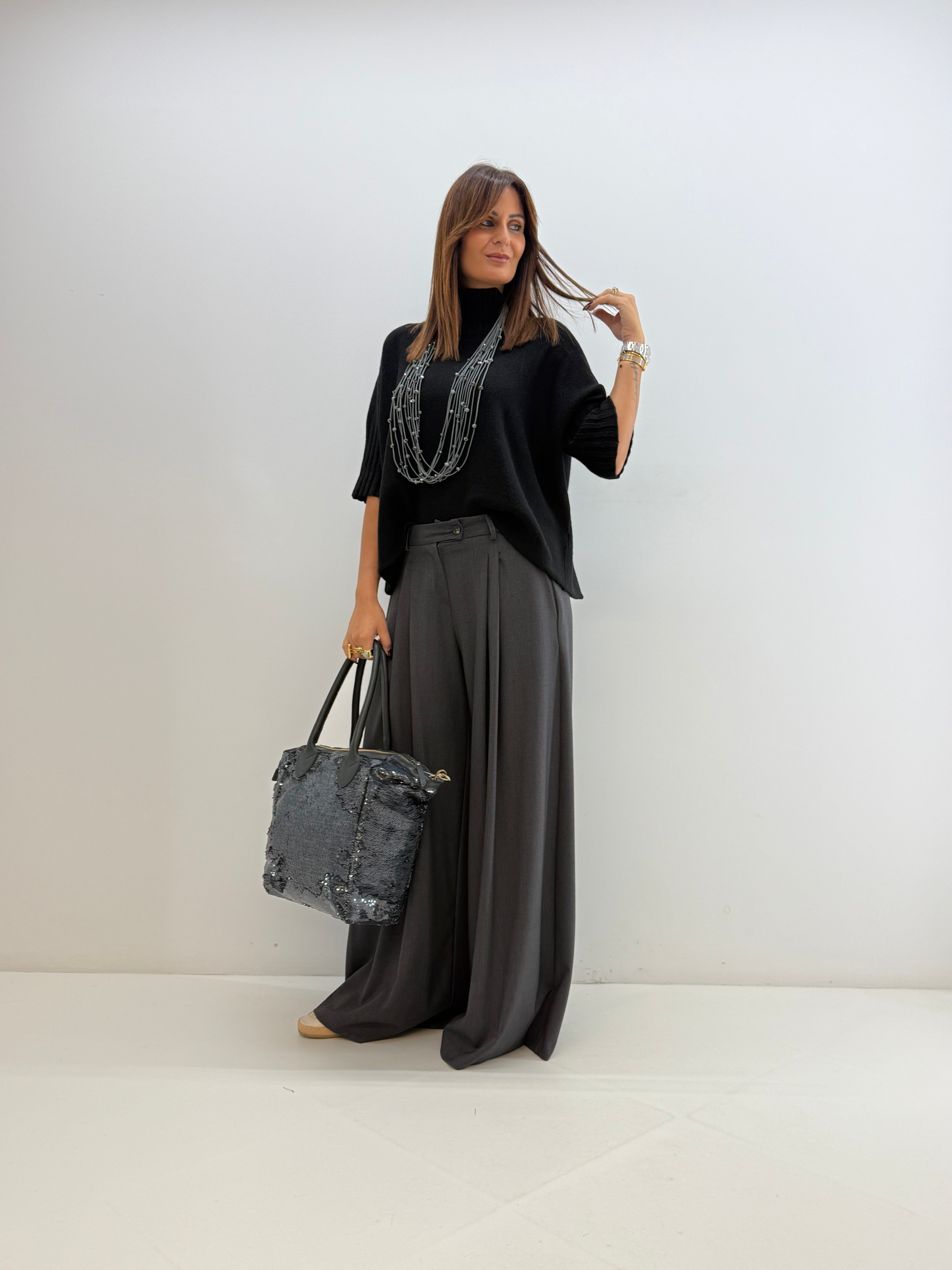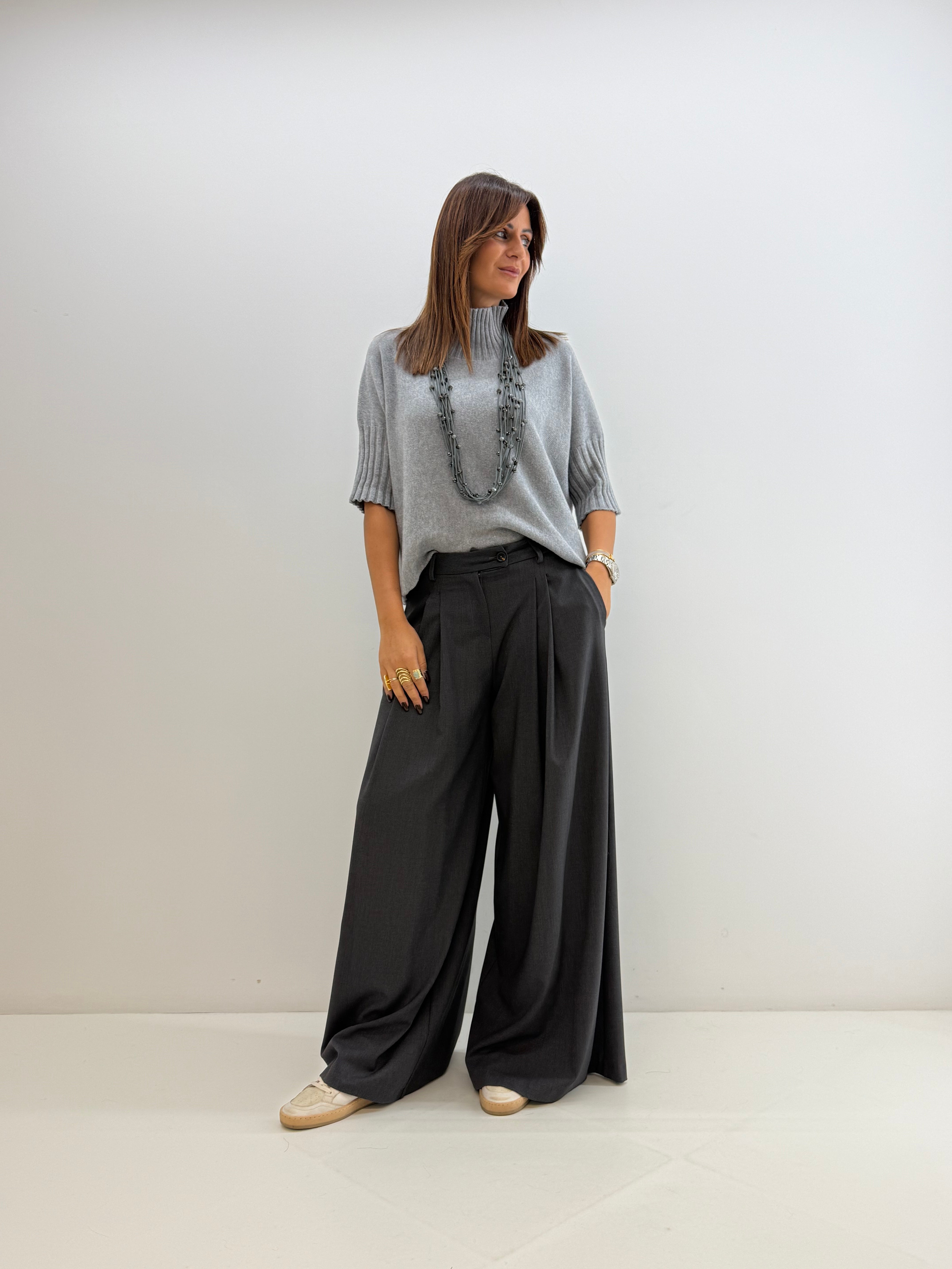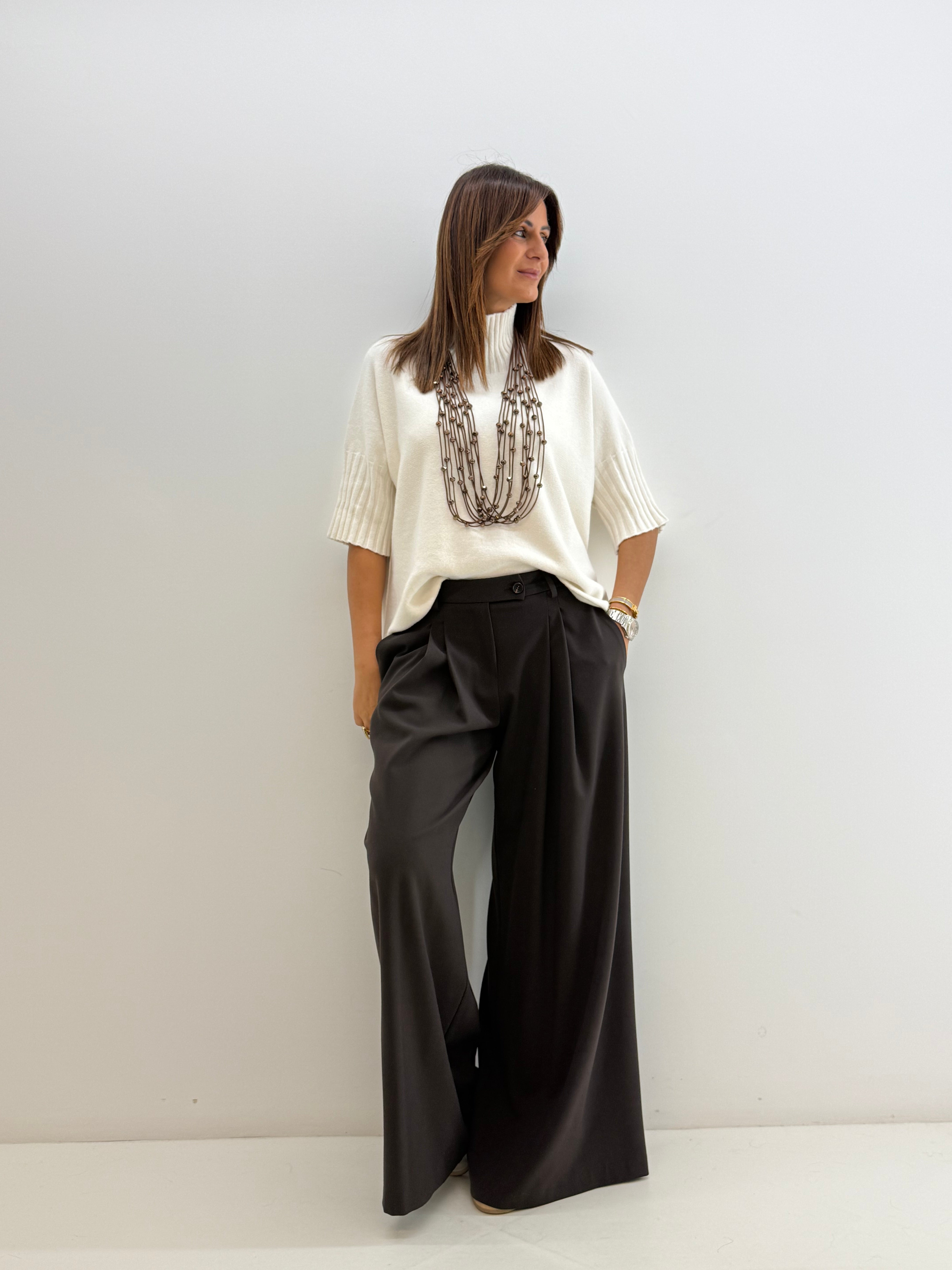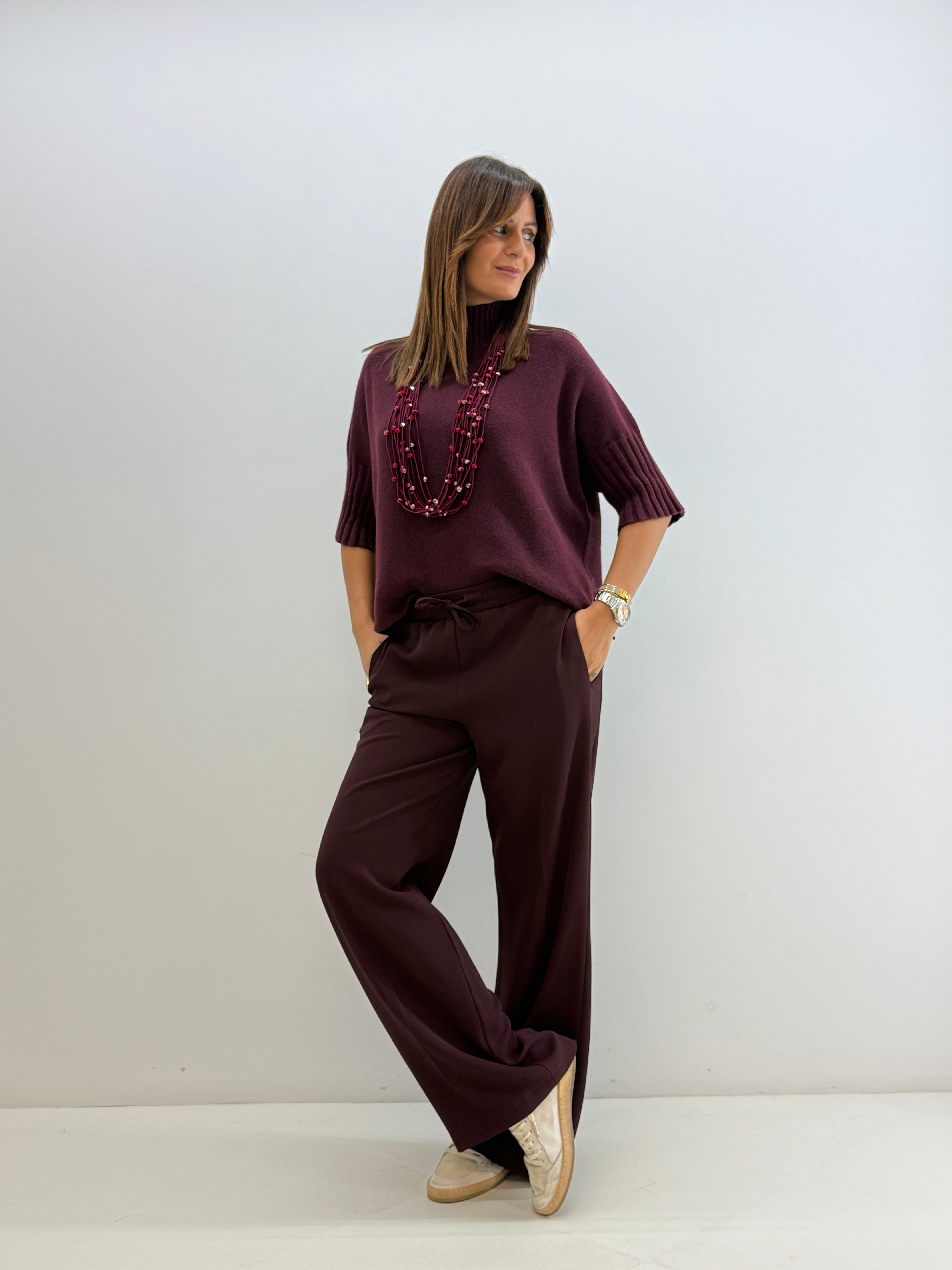 Pull in morbida maglia misto viscosa, maniche a 3/4, collo alto e morbido, vestibilità comoda.