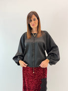 Blusa in satin, con maniche lunghe a palloncino con elastico sul polsino.