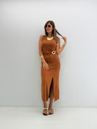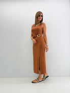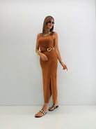 Abito elasticizzato, scollo rotondo, applicazione in metallo gold, drappeggio laterale in vita, spacco sul davanti. Senza chiusure.