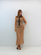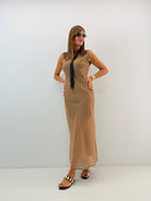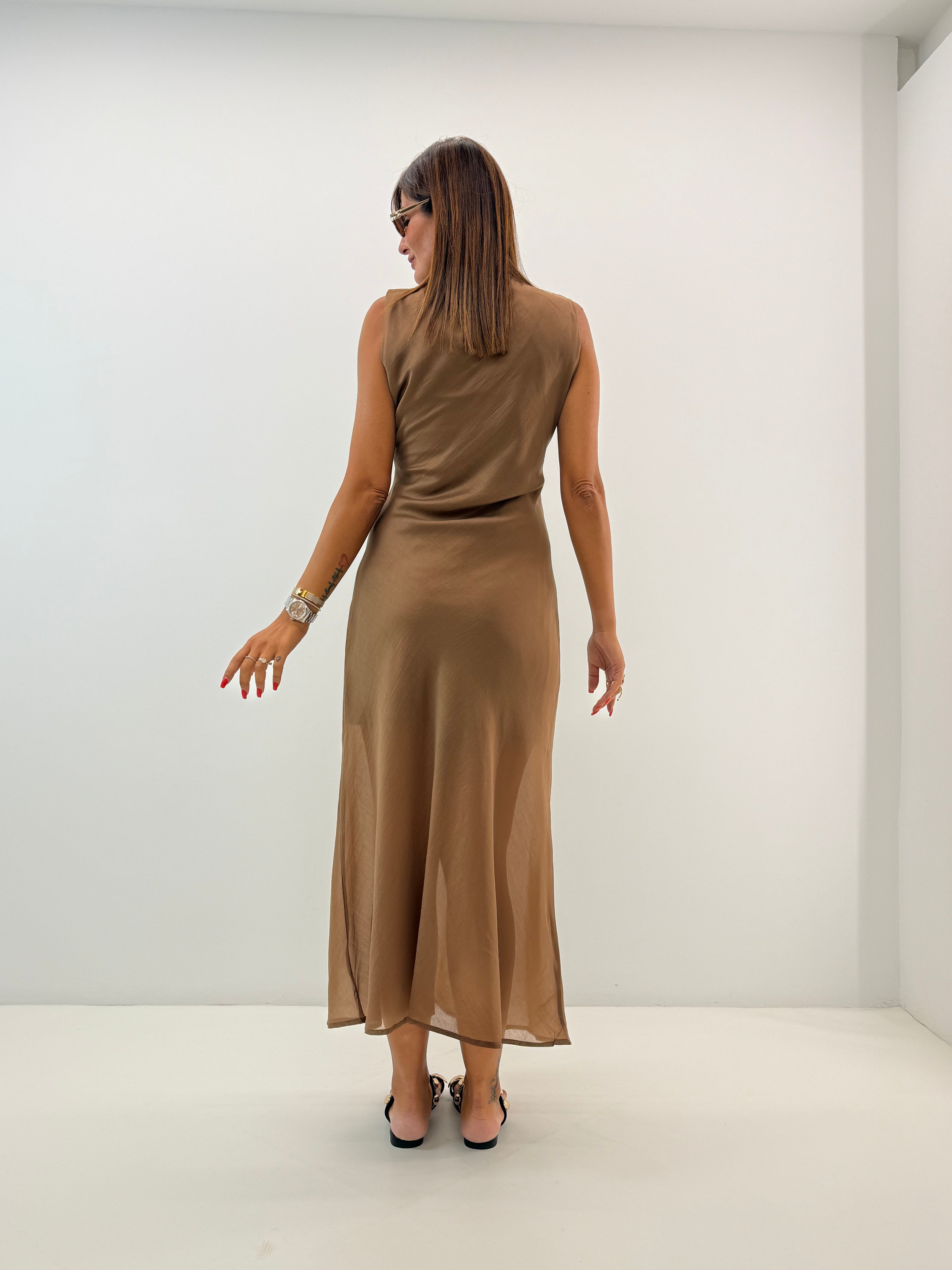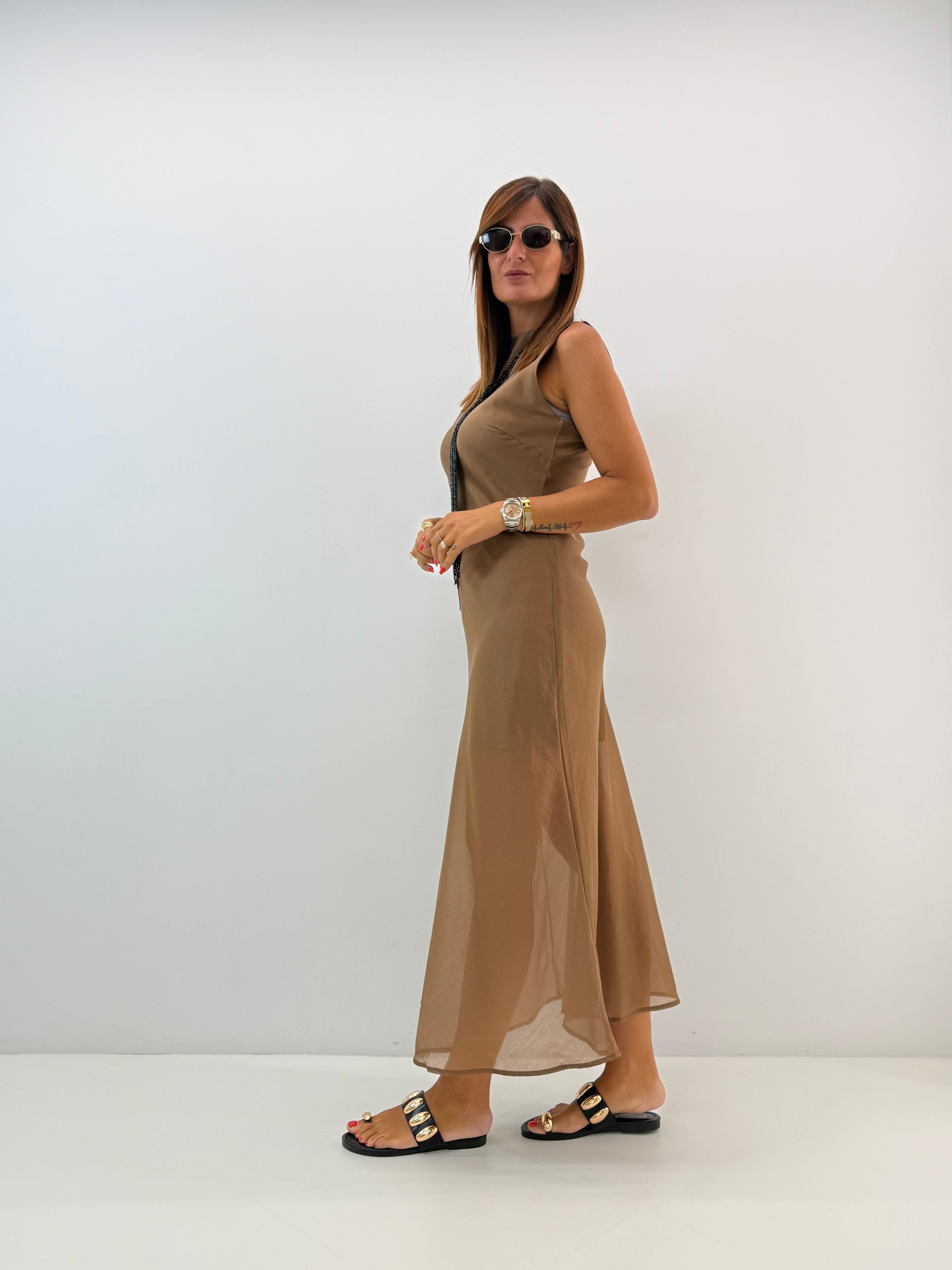 Abito lungo, modello asciutto, in misto tencel, scollo rotondo, senza maniche, chiusura dietro con bottoncini, sottoveste interna. Vestibilità a taglie.