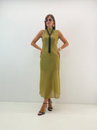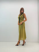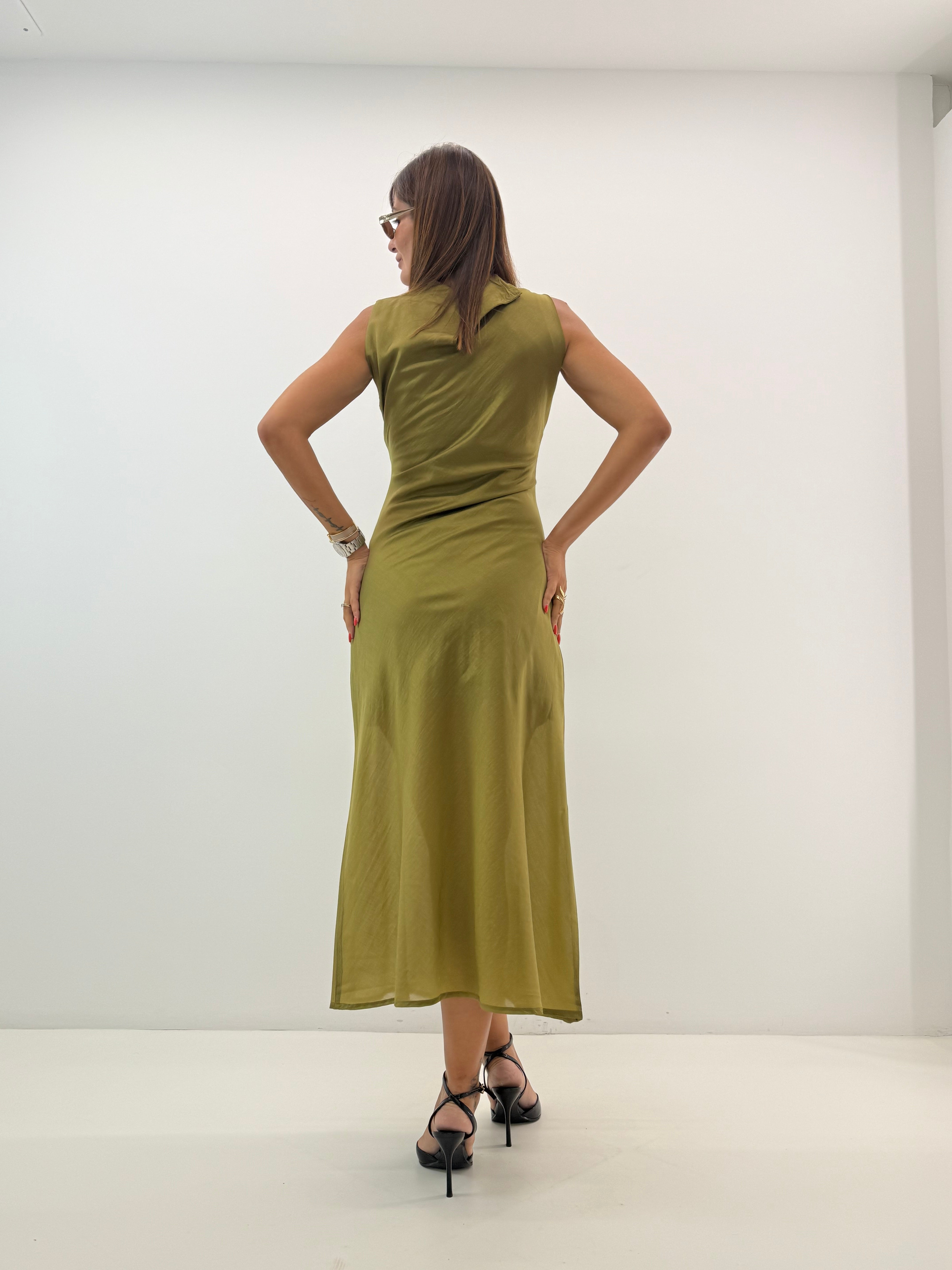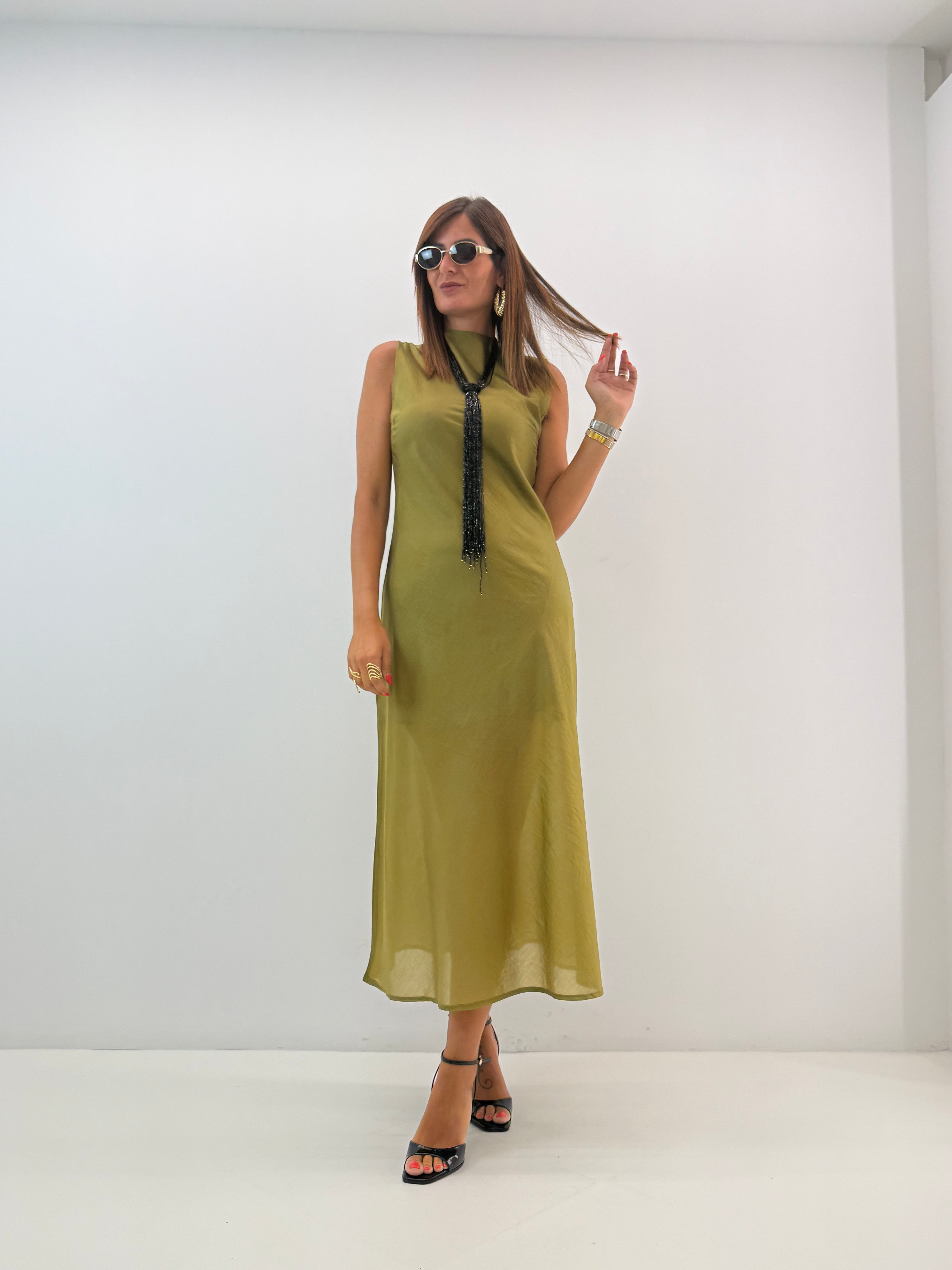 Abito lungo, modello asciutto, in misto tencel, scollo rotondo, senza maniche, chiusura dietro con bottoncini, sottoveste interna. Vestibilità a taglie.