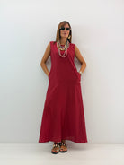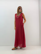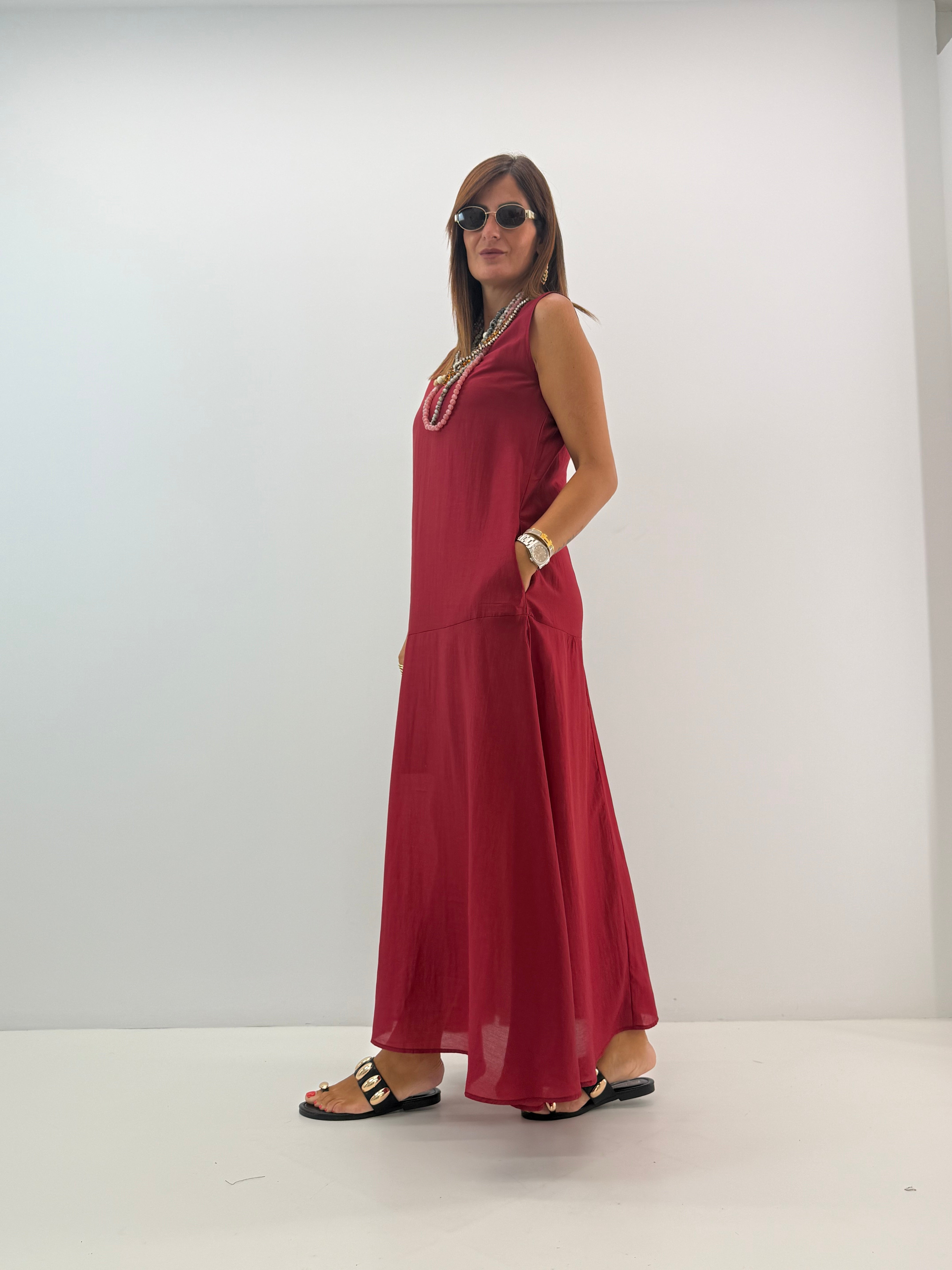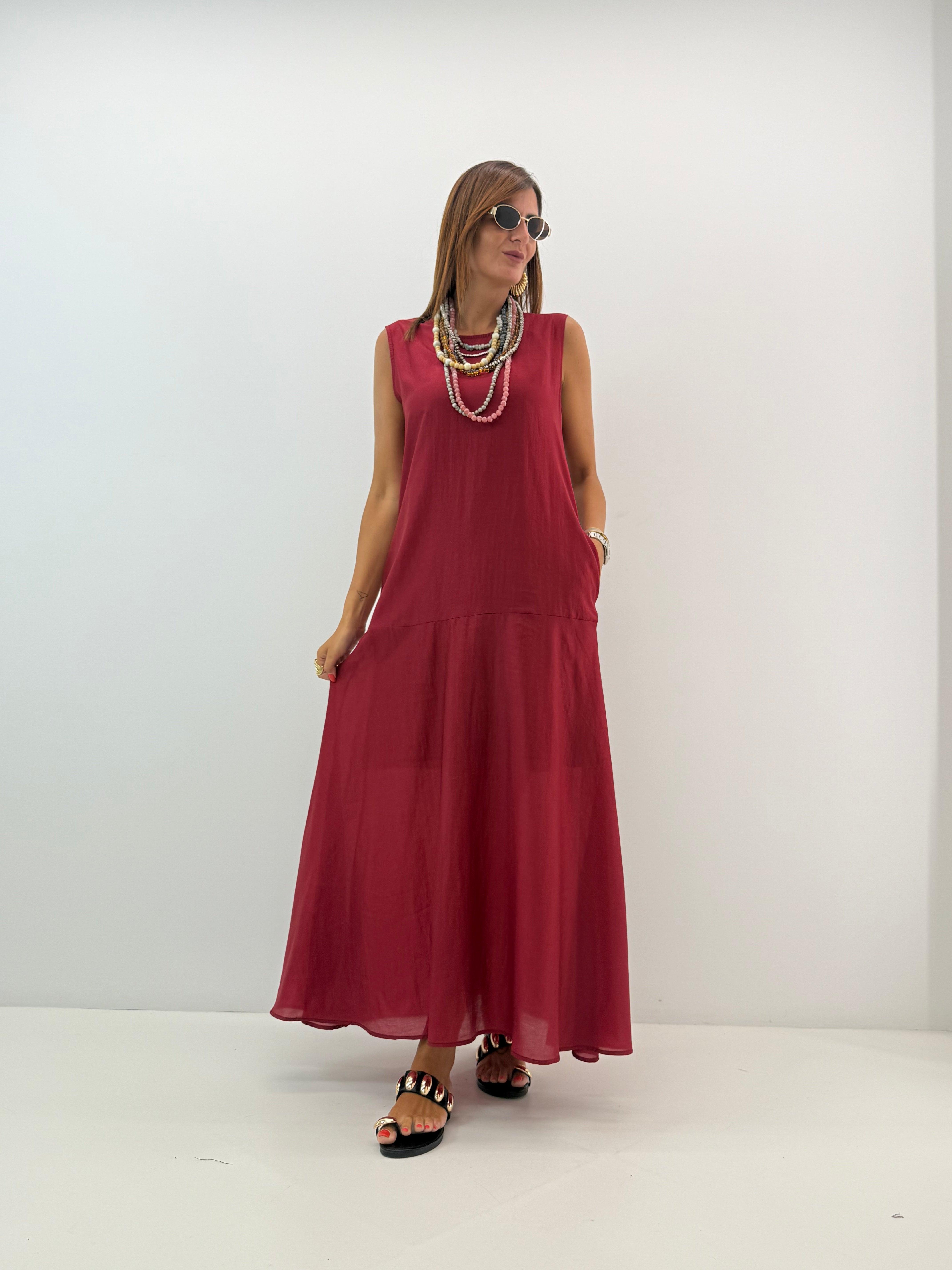 Abito lungo, modello morbido svasato sul fondo, in misto tencel, scollo rotondo, senza maniche con bretellina larga, chiusura dietro con bottoncino, sottoveste interna removibile e tasche laterali a scomparsa. Vestibilità a taglie.