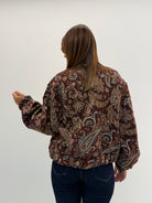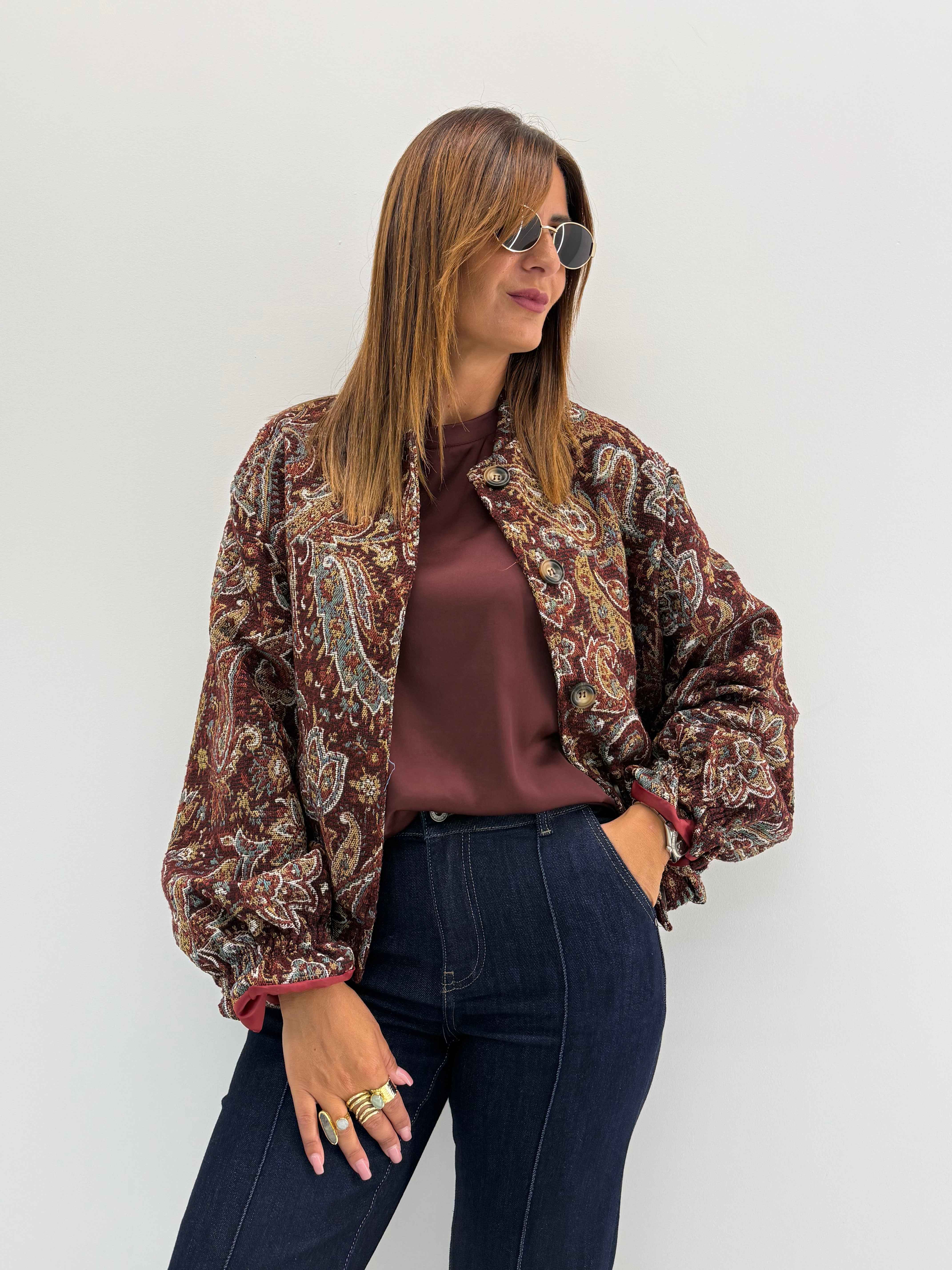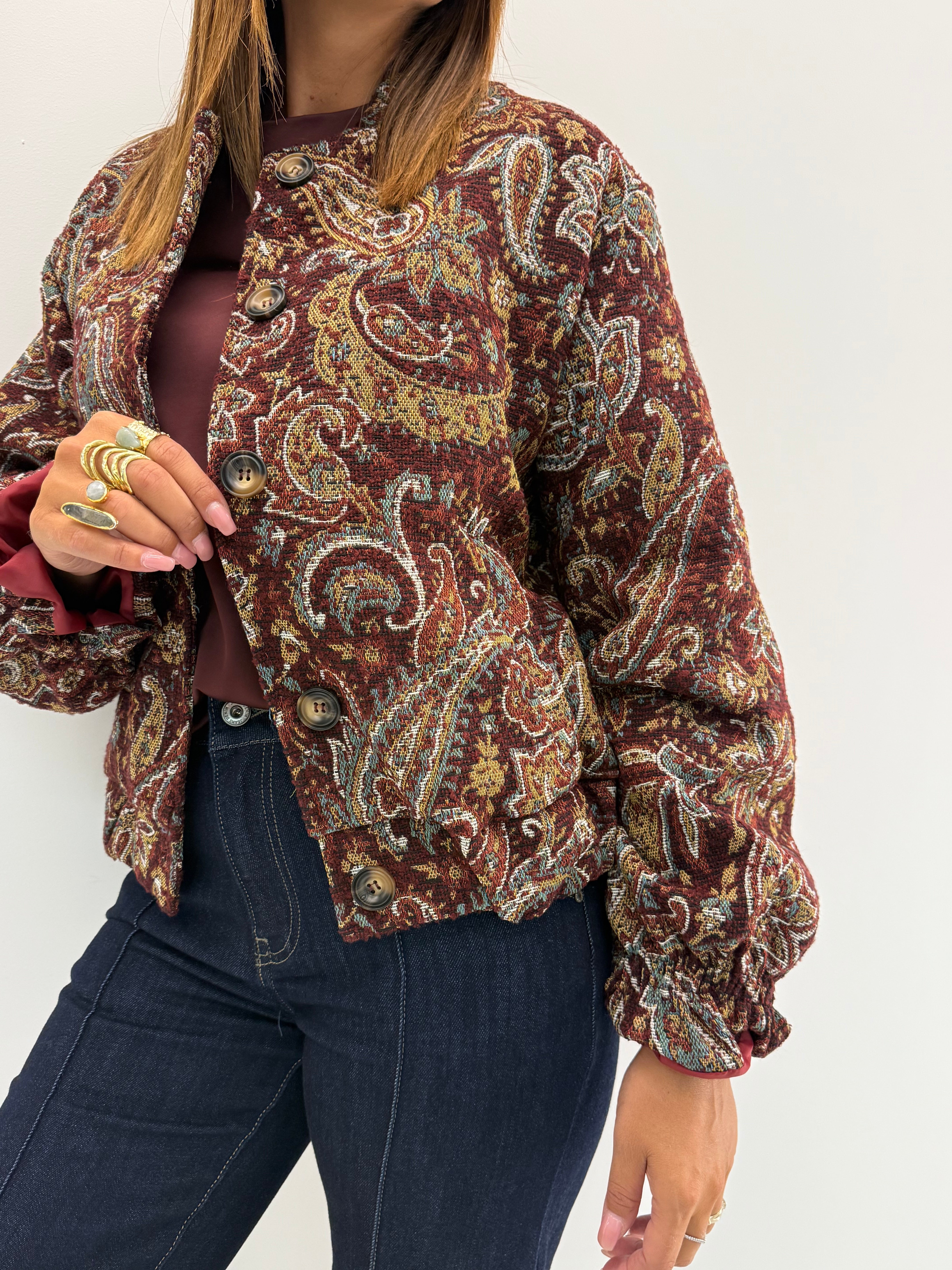 Bomber foderato, fantasia damascata, chiusura con bottoni.