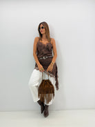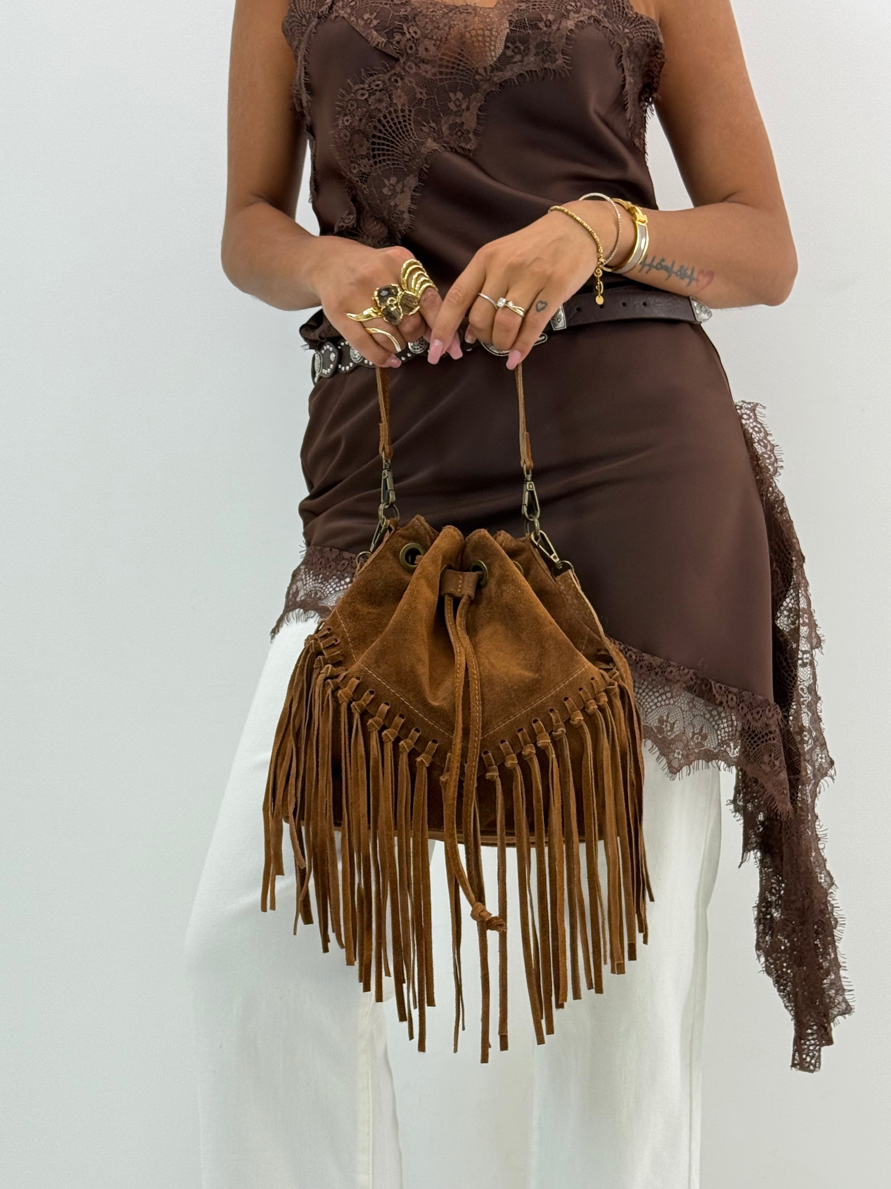 Borsa scamosciata in vera pelle, modello a sacca, tracolla removibile e regolabile, dettaglio di frange davanti.