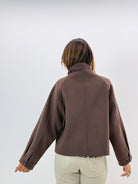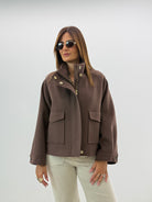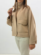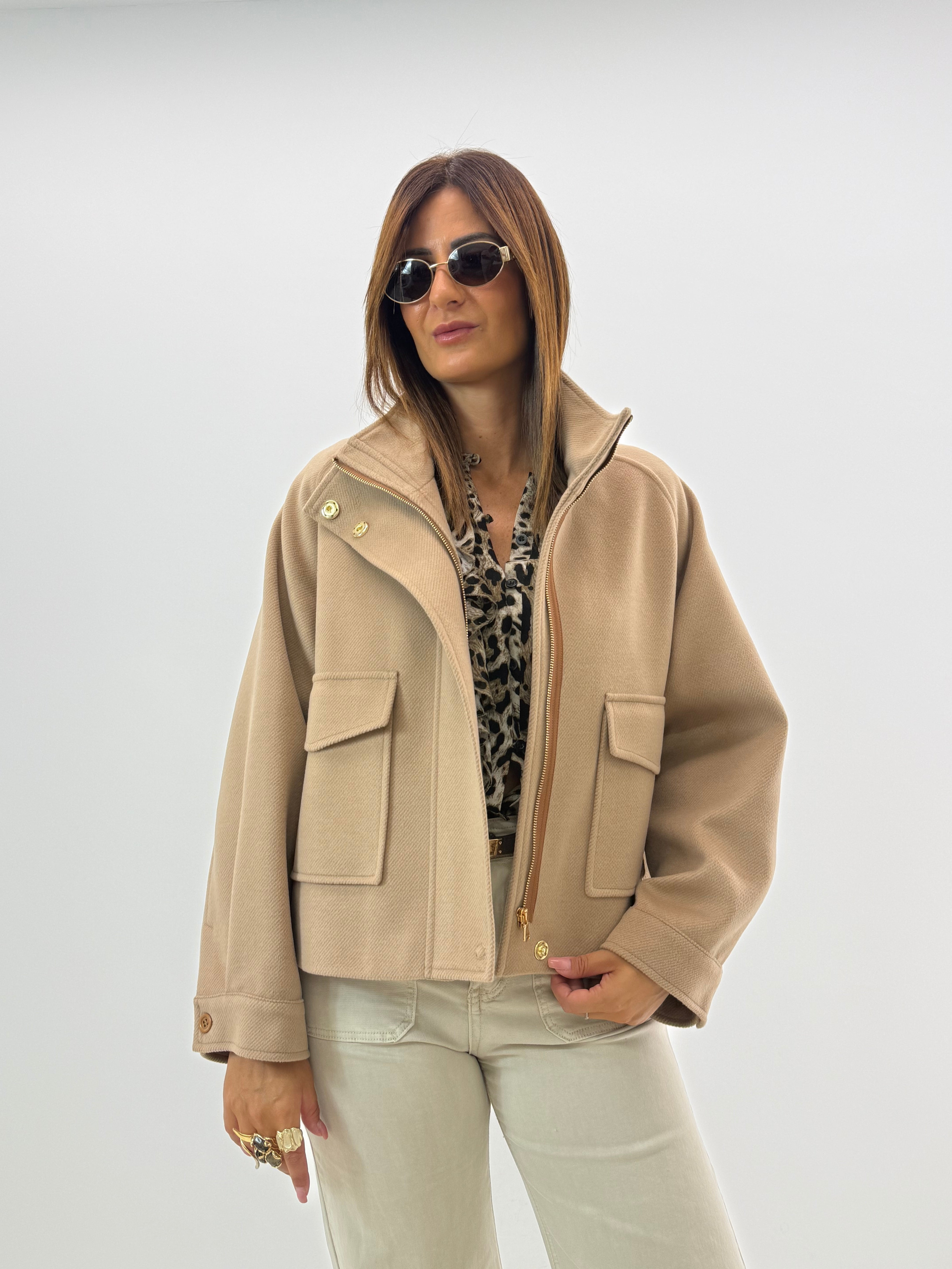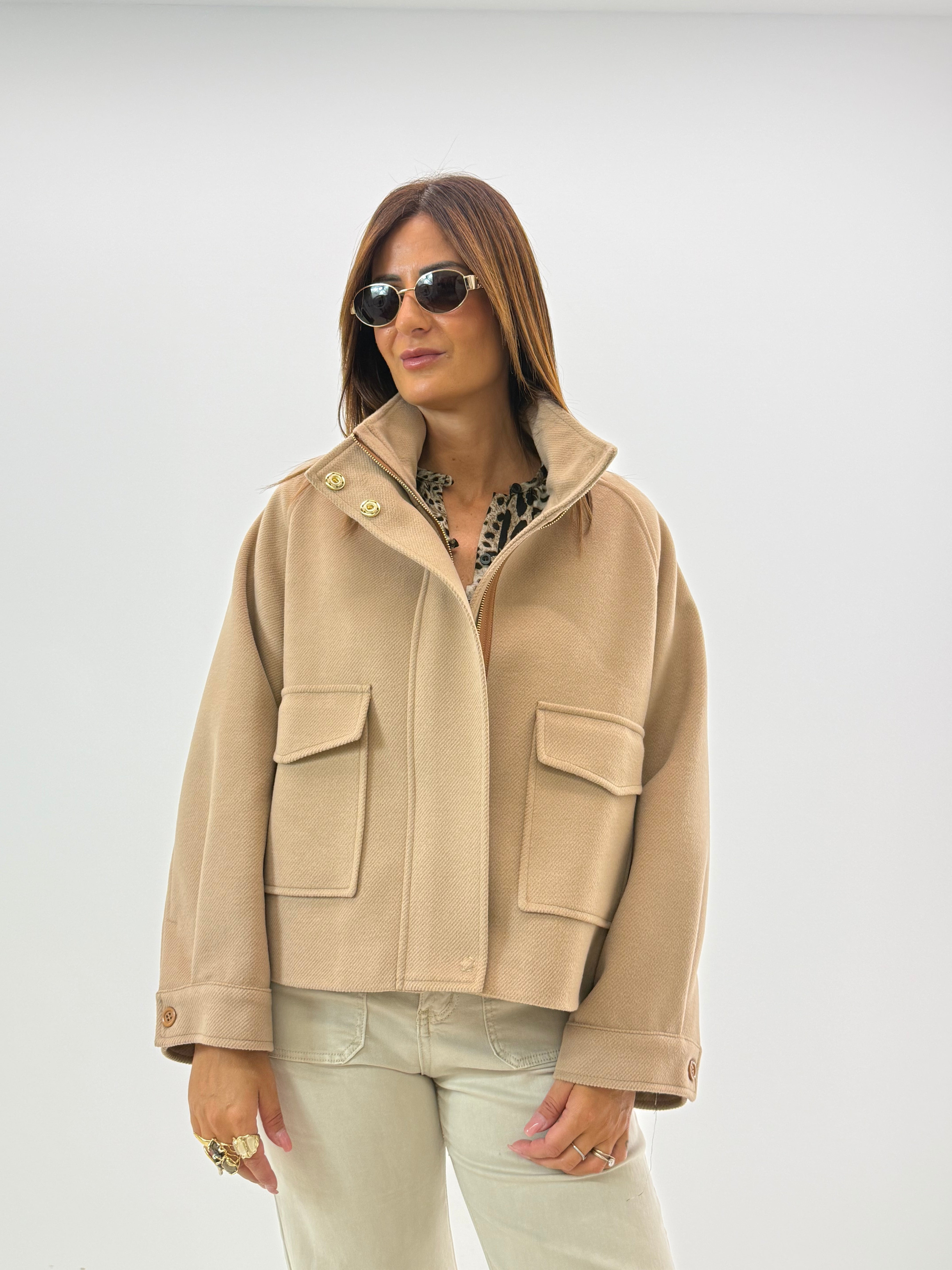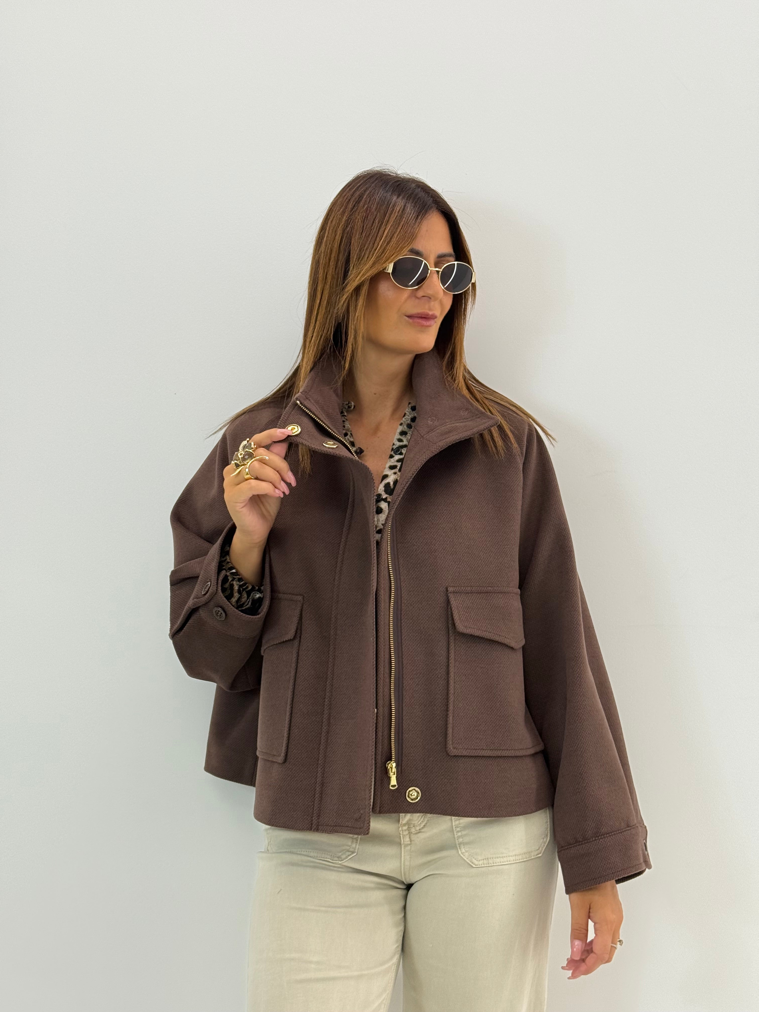 Cappotto corto in panno. Tasche davanti con patta. Chiusura con bottoni e zip davanti. Foderata all'interno.