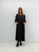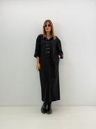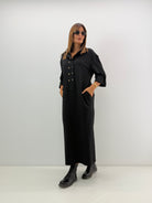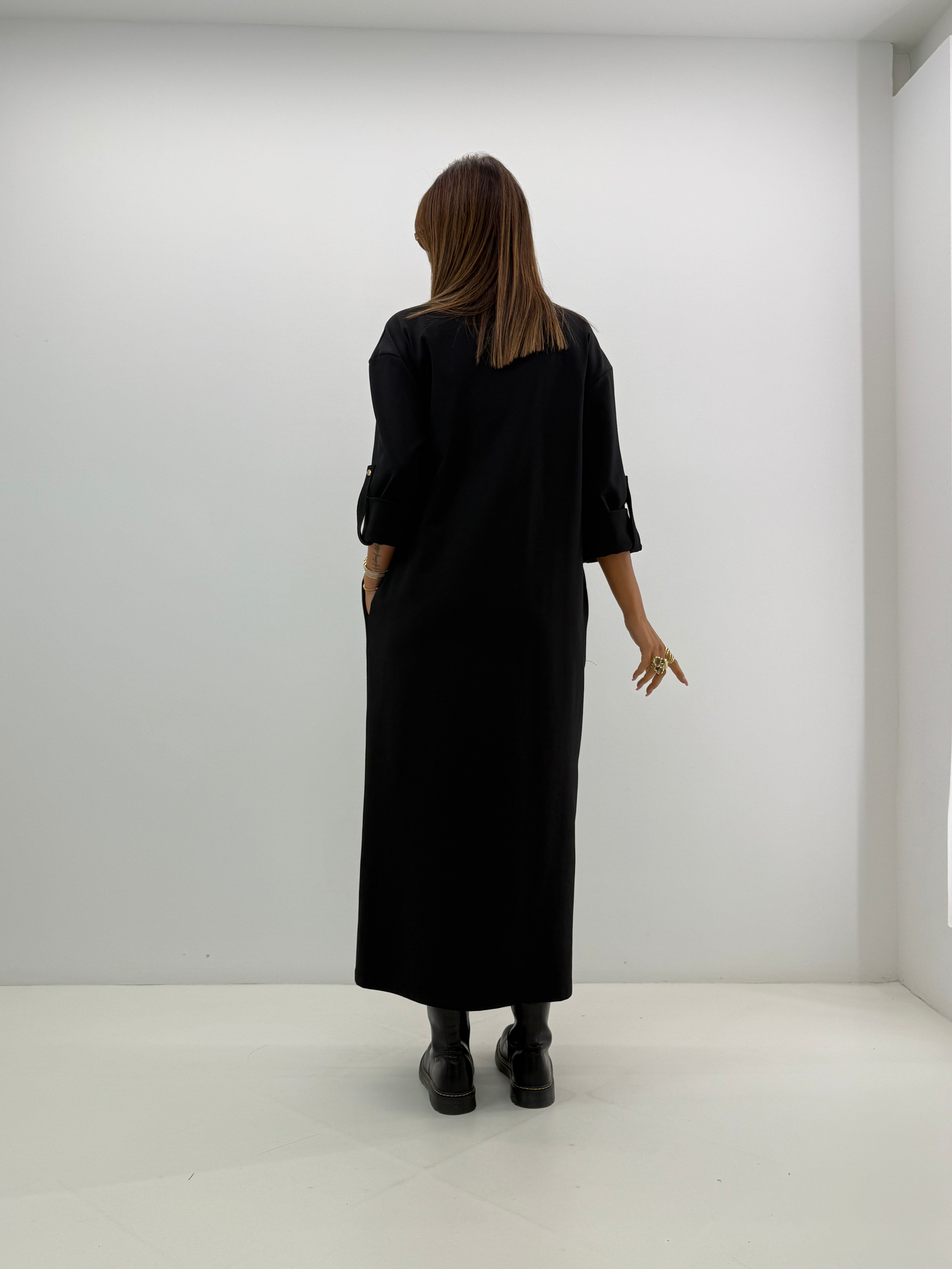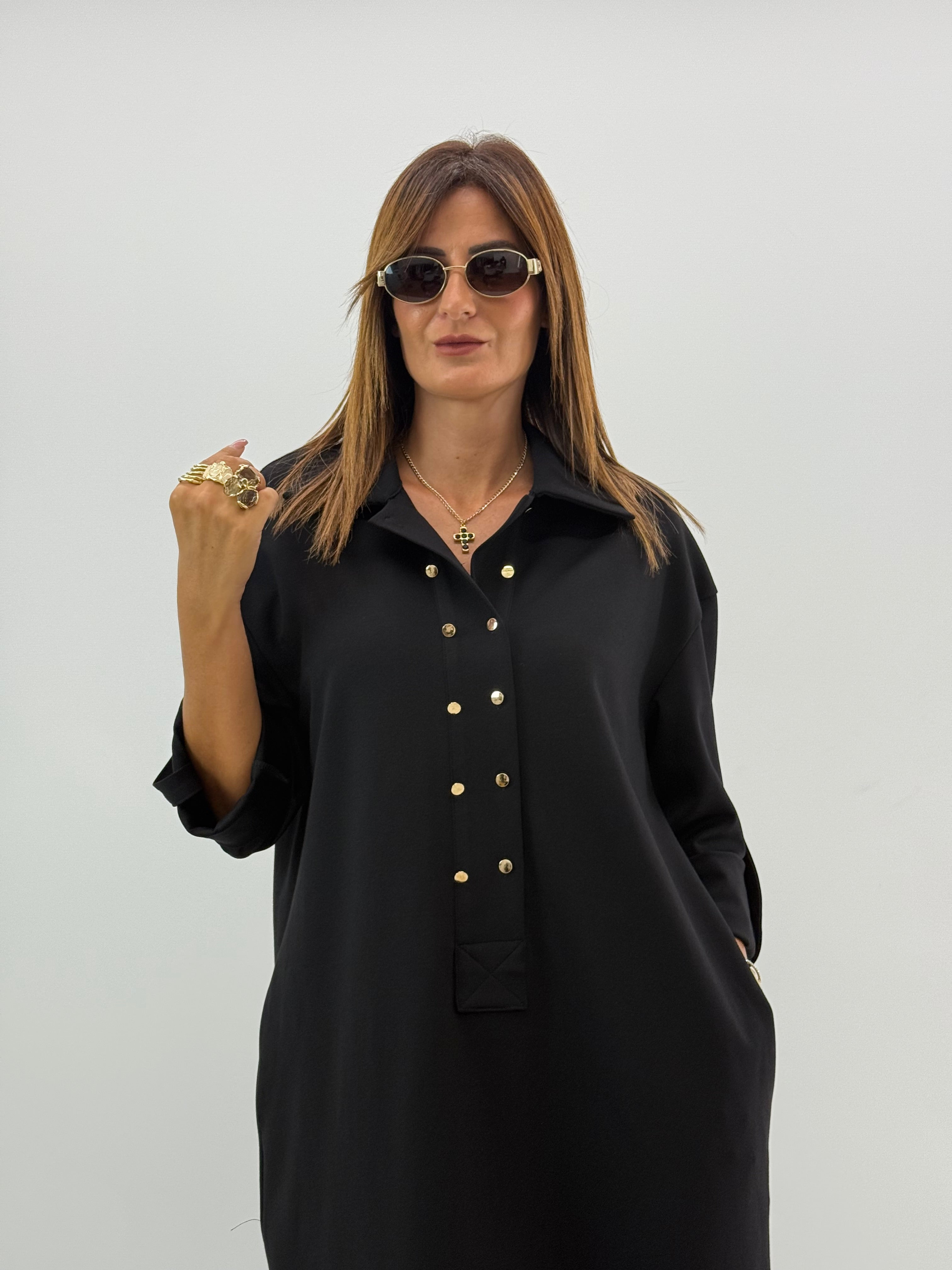 Maxi abito con colletto e bottoncini davanti, tasche laterali a scomparsa. Vestibilità over.