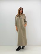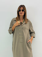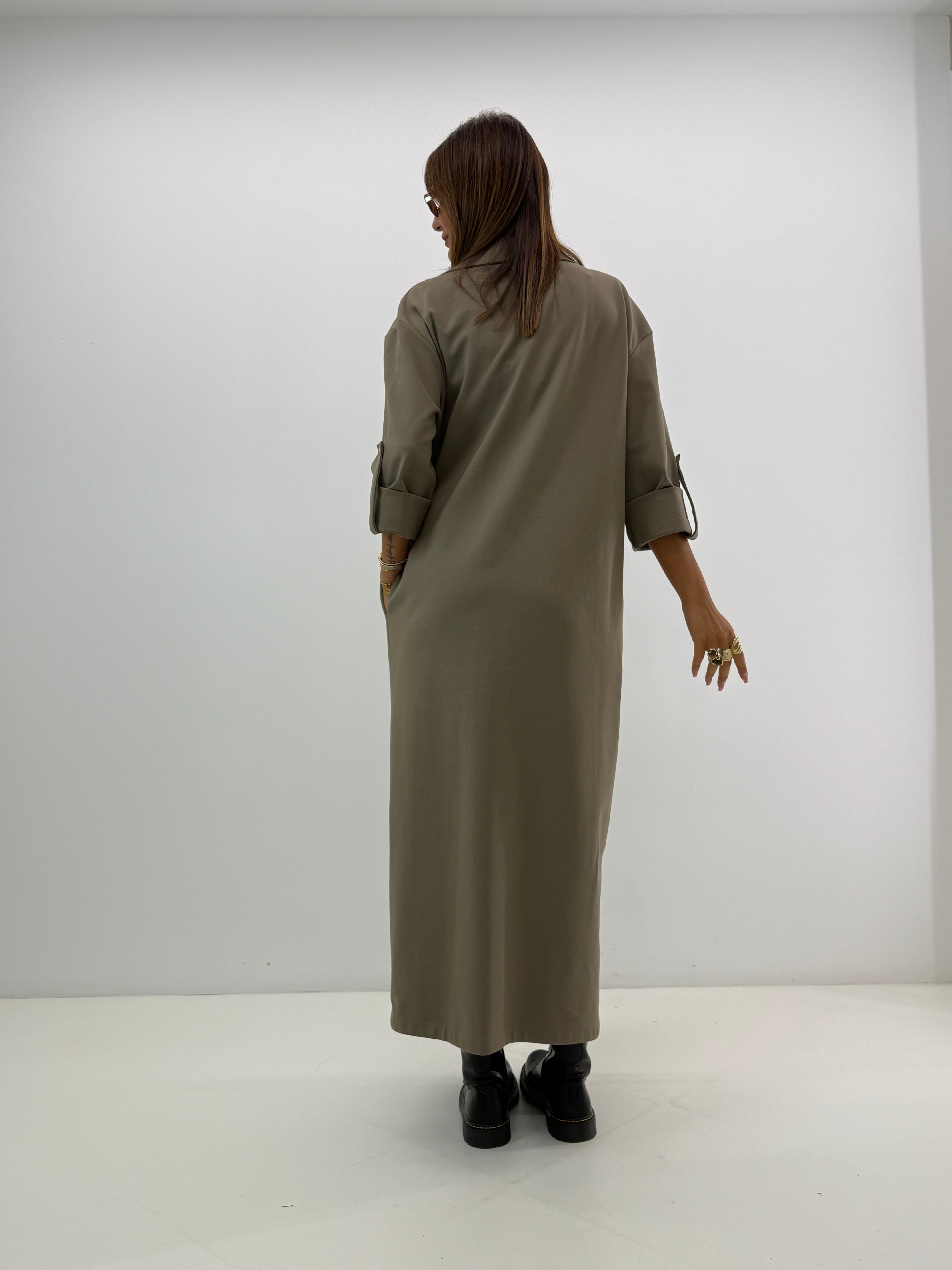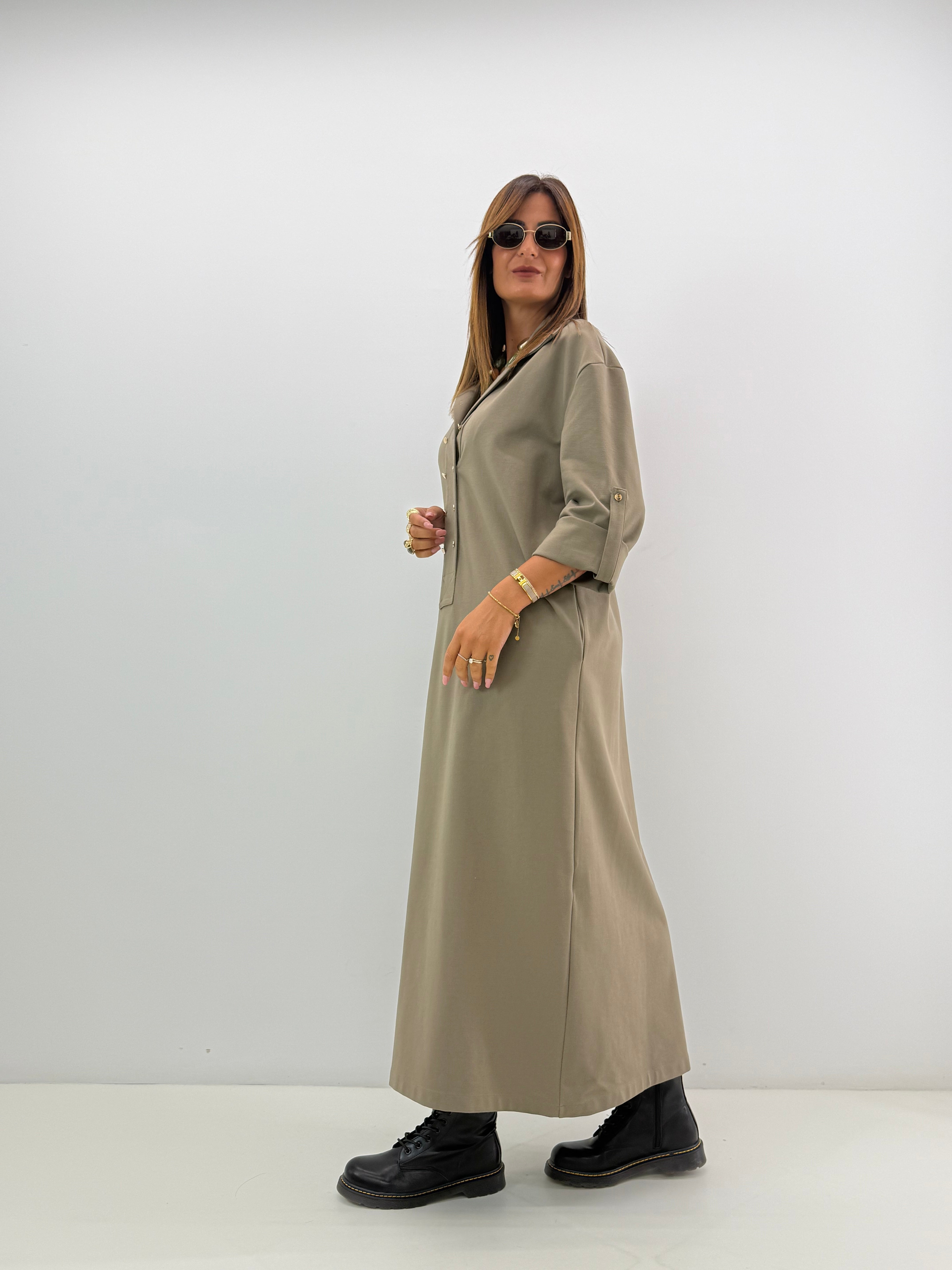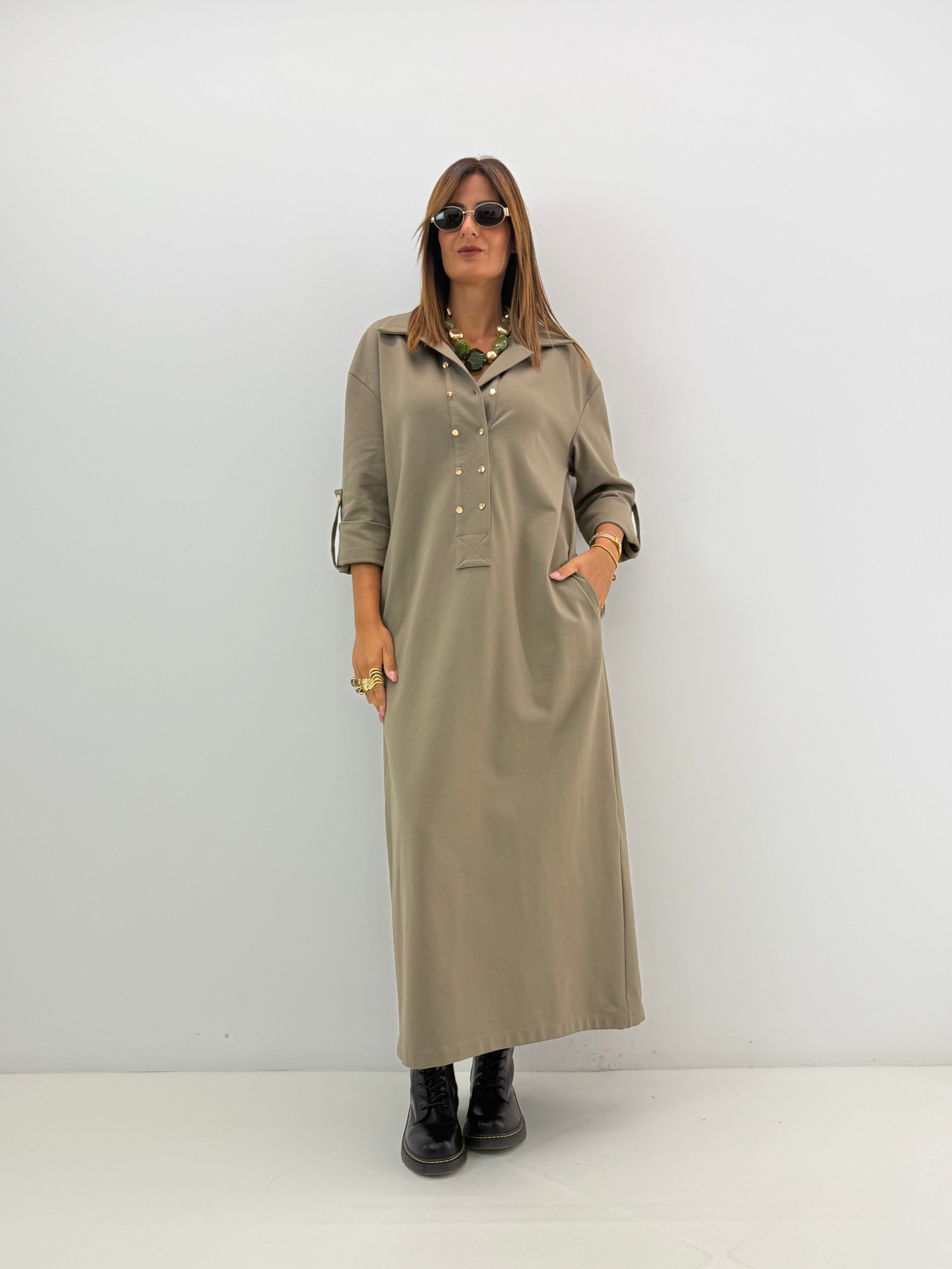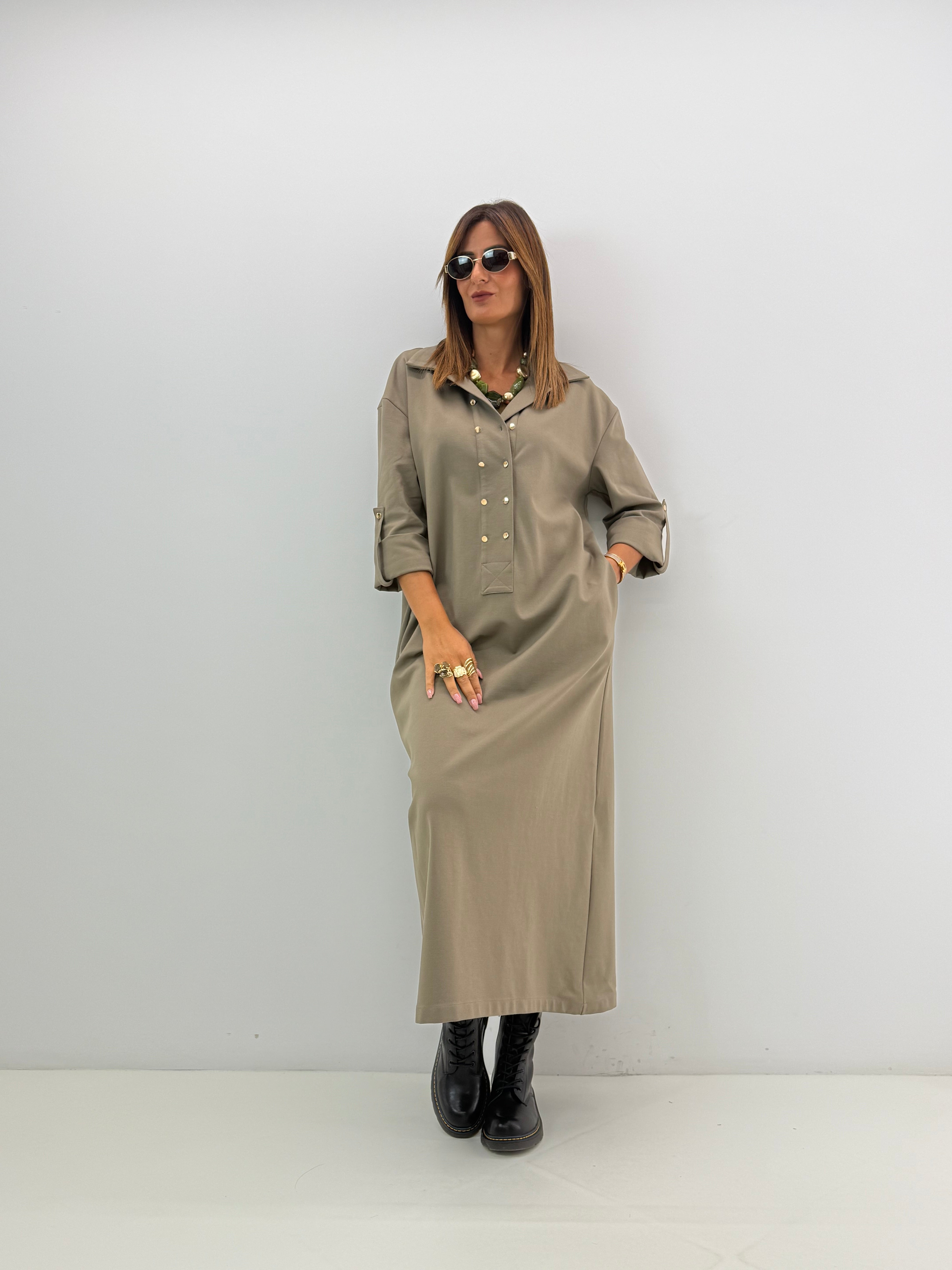 Maxi abito con colletto e bottoncini davanti, tasche laterali a scomparsa. Vestibilità over.