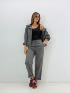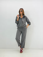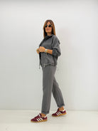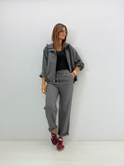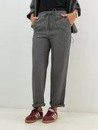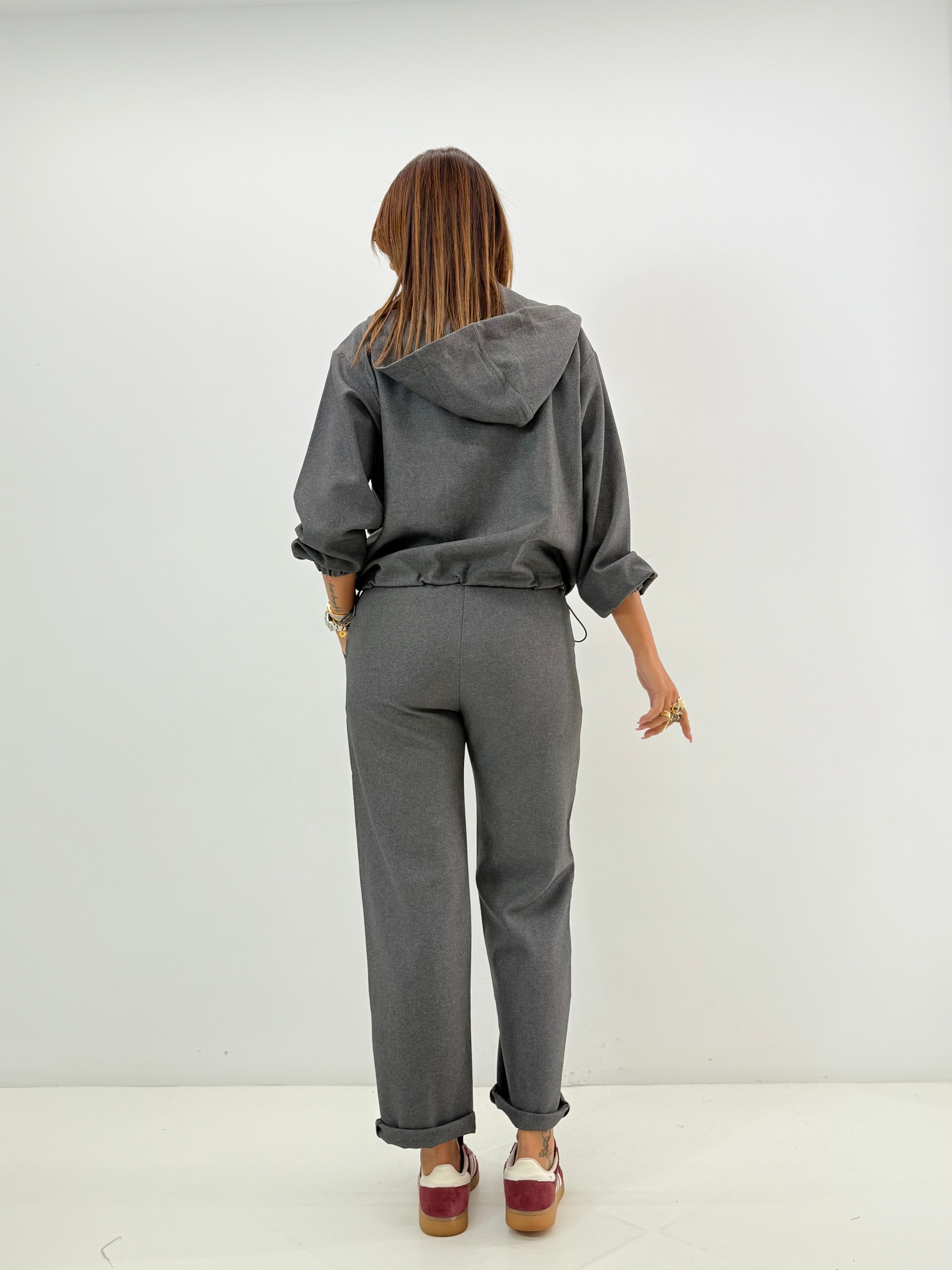 Pantalone con elastico in vita e coulisse regolabile, tasche laterali a lunetta.