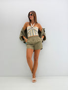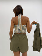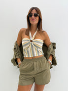 Top crop a fascia, in misto cotone, fantasia a righe, buco centrale, laccetti per chiusura al collo, fascia elastica nella parte posteriore.