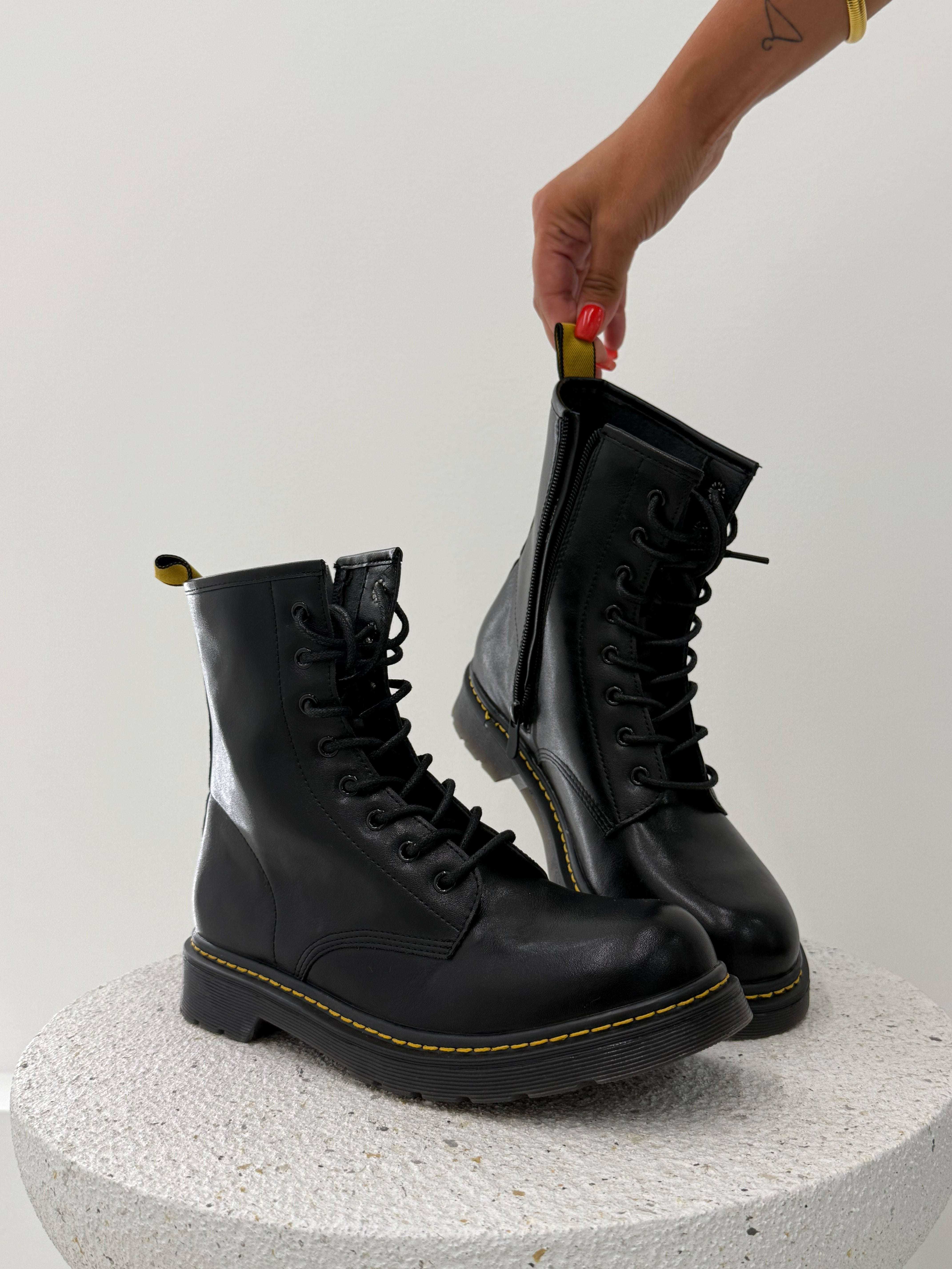 Anfibio in eco-pelle, punta arrotondata, chiusura con lacci e zip, con suola scanalata e cuciture gialle. Sarà il protagonista di questa stagione. Moderno, versatile e comodo