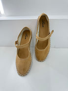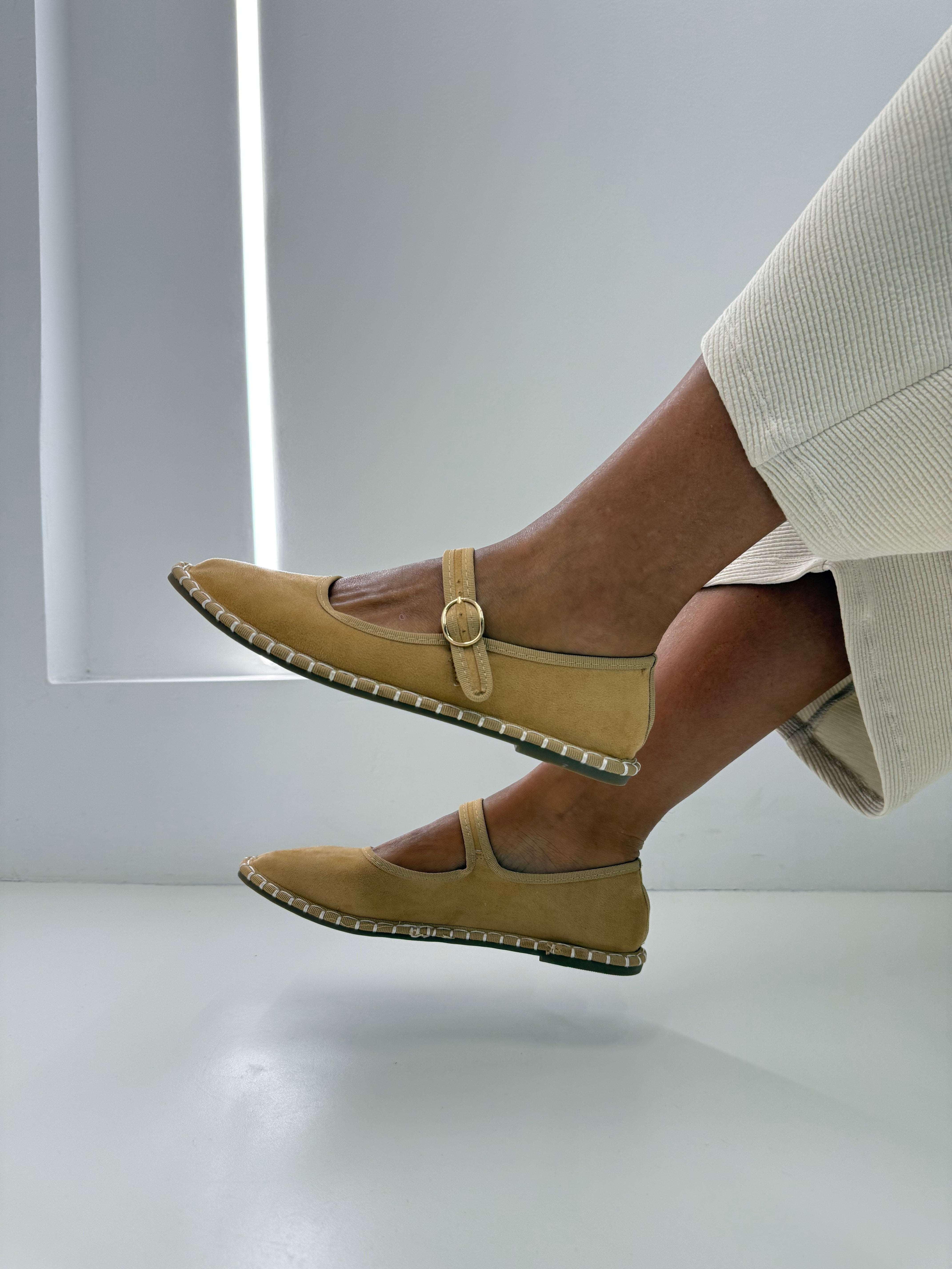 Ballerine in tessuto scamosciato. Punta arrotondata e cinturino sottile e regolabile con , gomma anti scivolo e altezza tacchetto 1 cm,