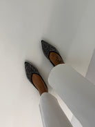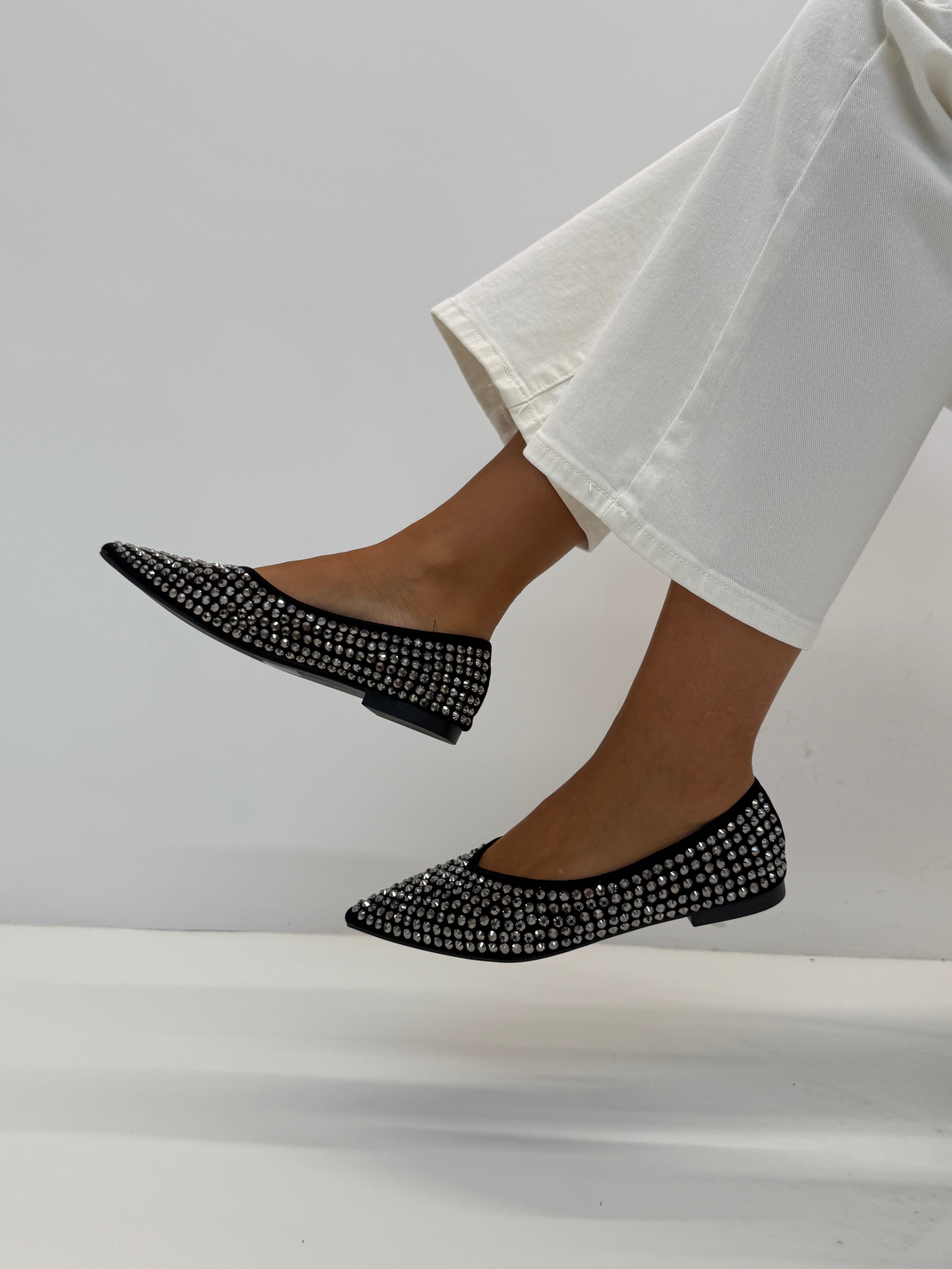 Ballerine a punta in tessuto scamosciato con applicazione di strass, gomma anti scivolo e altezza tacchetto 1 cm,
