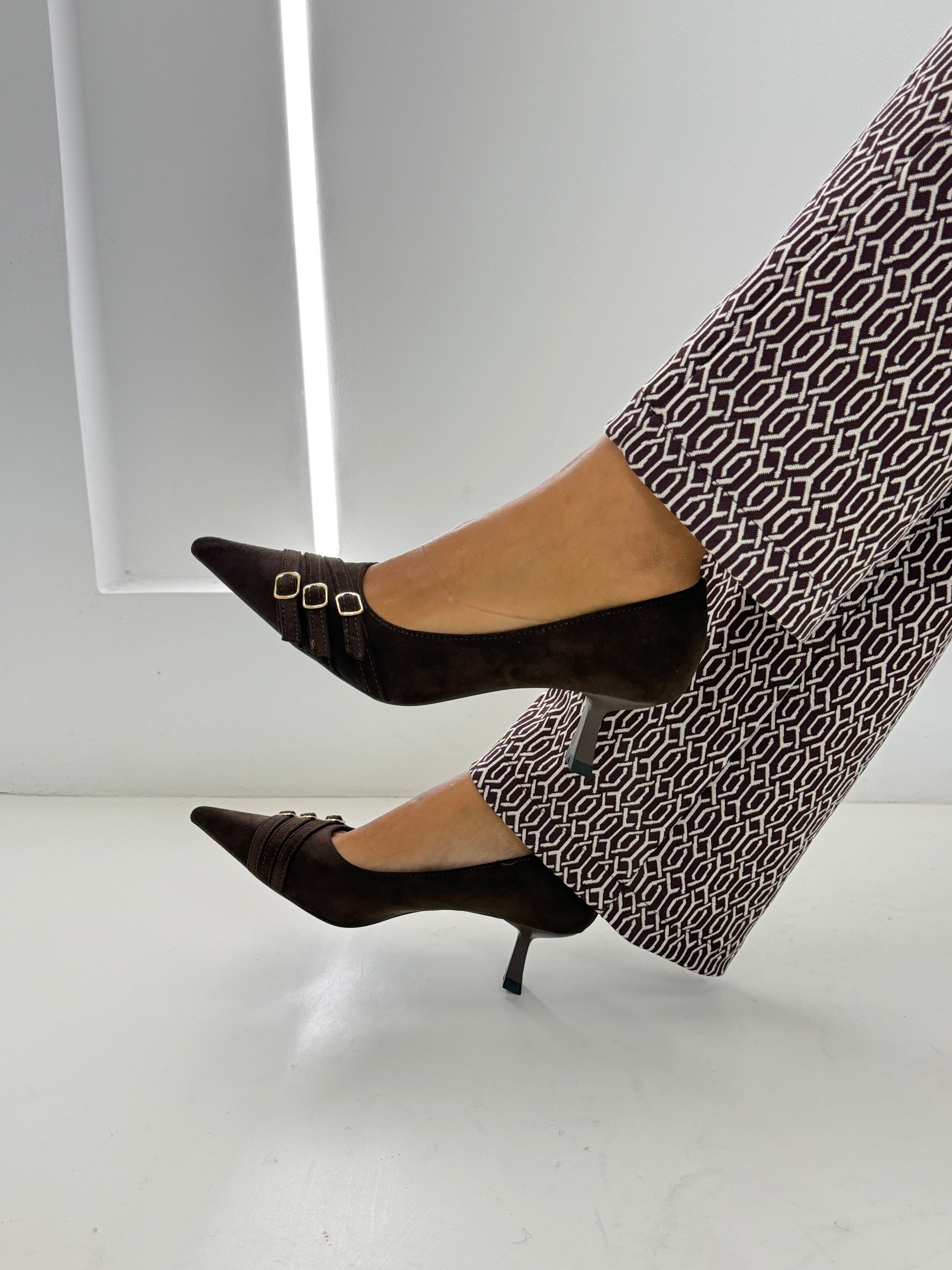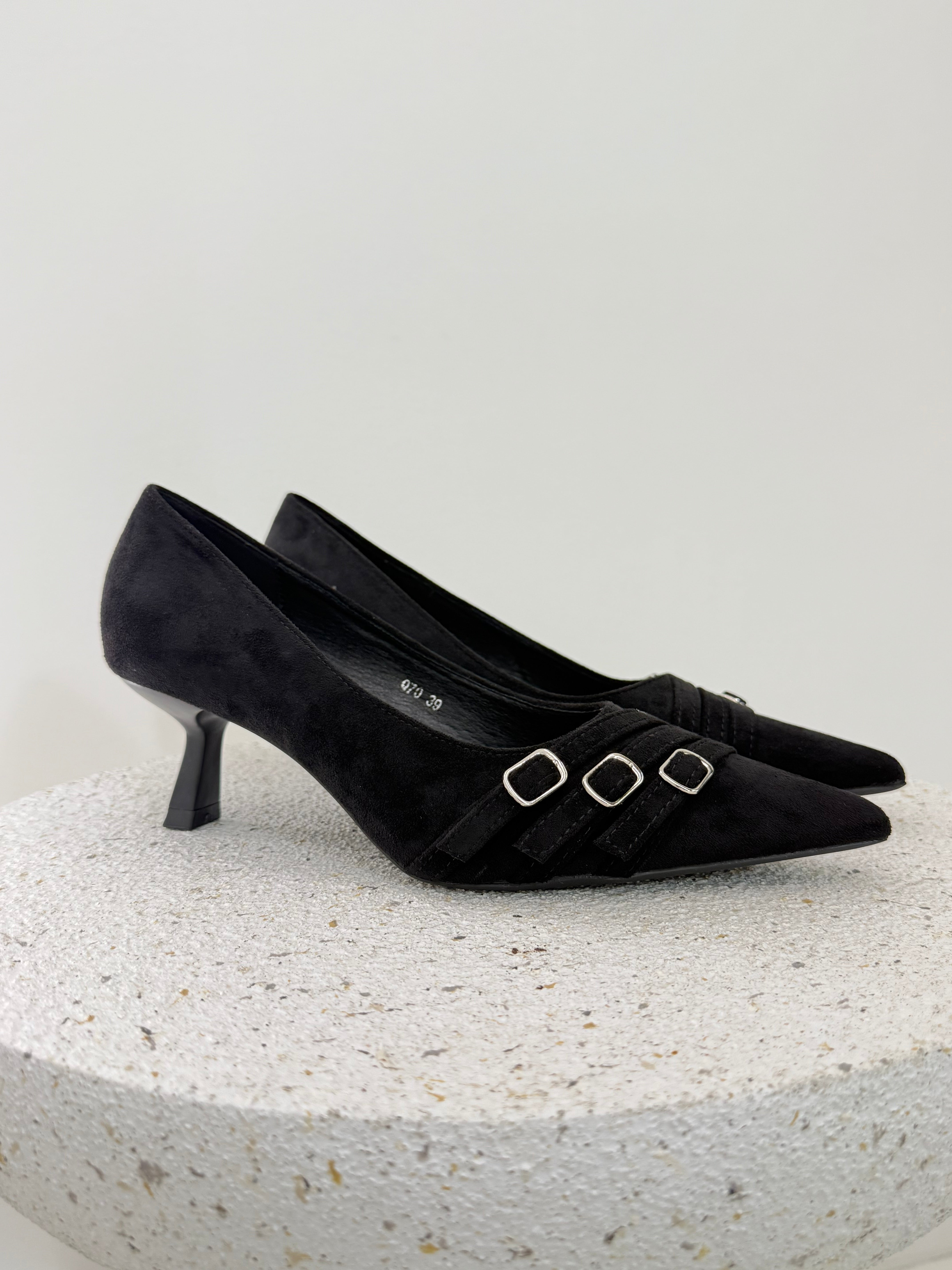 Dècolletè effetto scamosciato. Moderno, versatile e comodo. A punta con fibbie davanti, permettendo una calzata e una camminata perfetta.