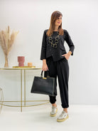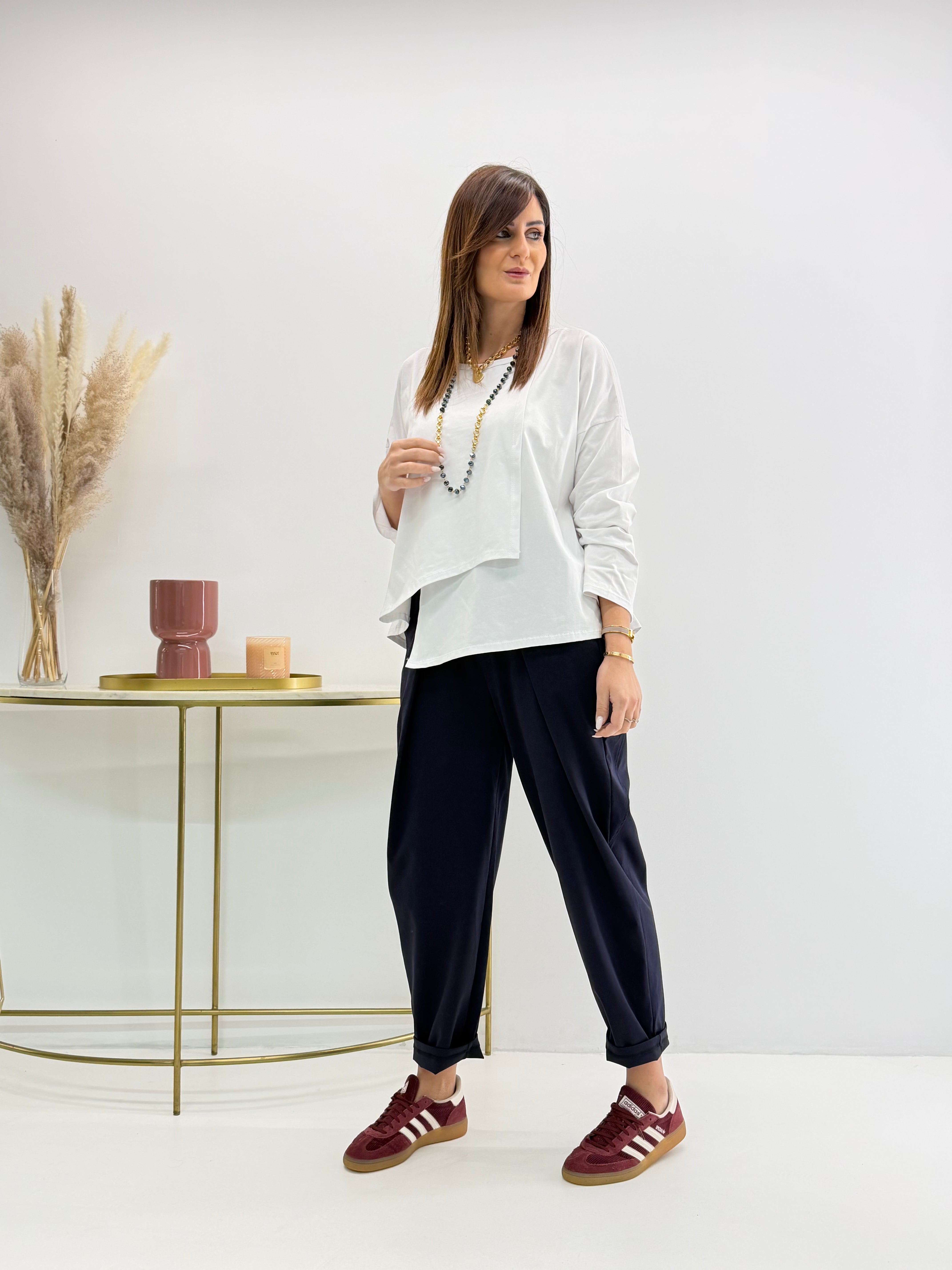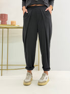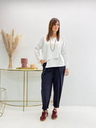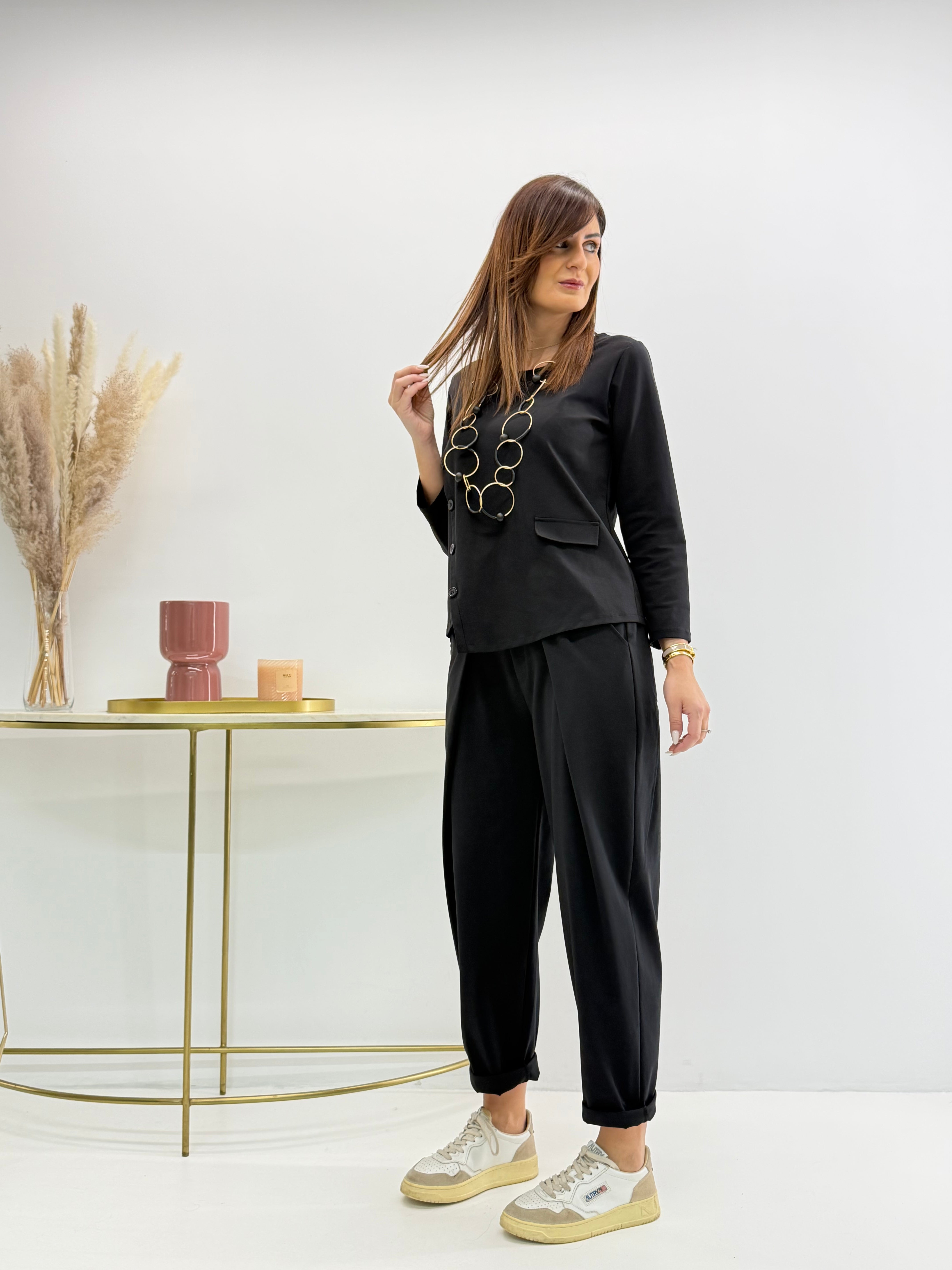 Pantalone in punto Milano, con fascia elasticizzata in vita dietro, senza chiusure ,tasche laterali a lunetta e tasche dietro. Pinces davanti. Vestibilità comoda