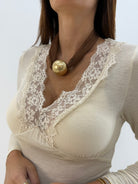 Body con scollo a V, applicazione di pizzo sullo scollo, chiusura con bottoncini nella parte finale.