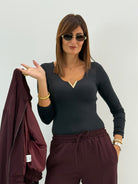 Body in lycra, con scollo a V, elasticizzato, chiusura con bottoncini nella parte finale.