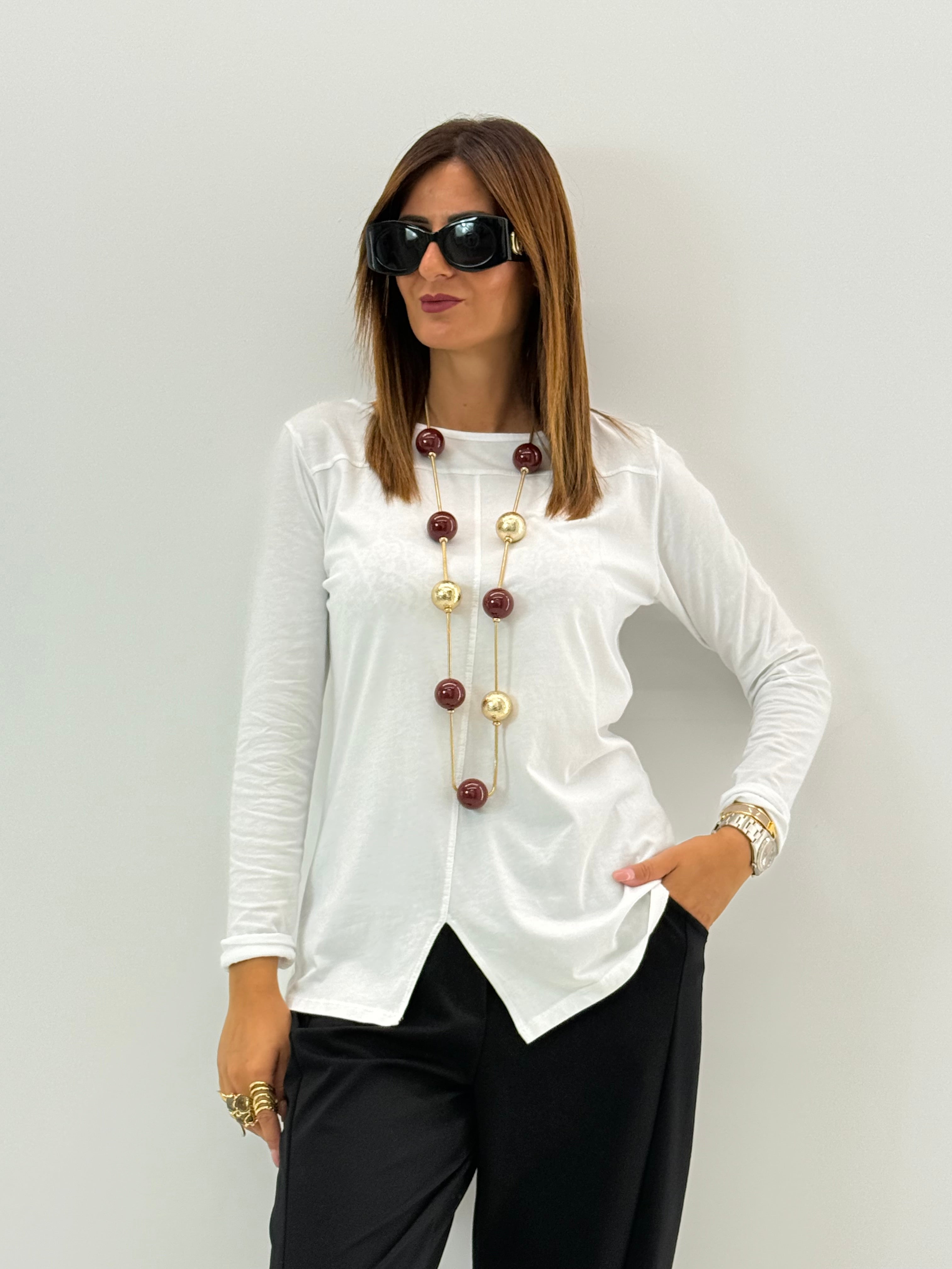 Maglia in cotone, scollo rotondo e spalla morbida. Maniche lunghe. Dettaglio spacco finale. Taglio morbido e leggermente svasato. Senza chiusure. Comoda vestibilità.