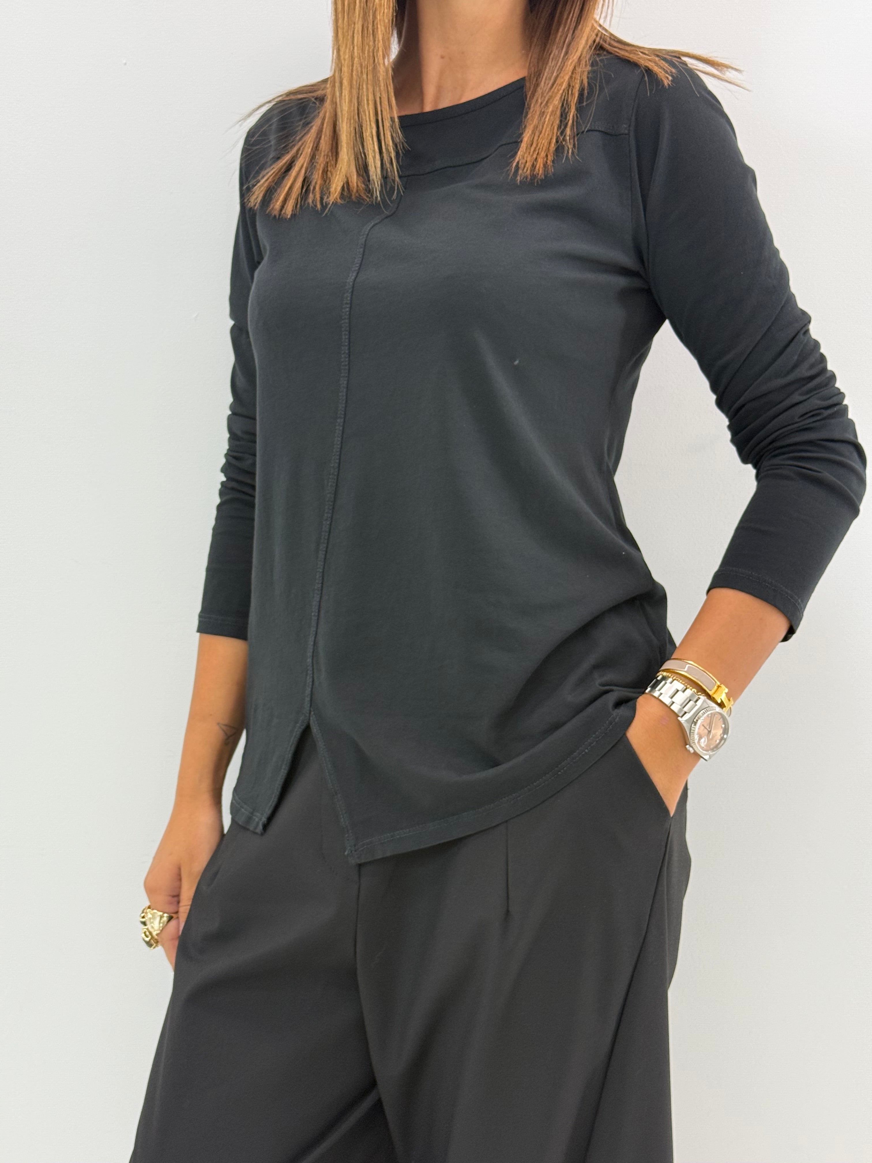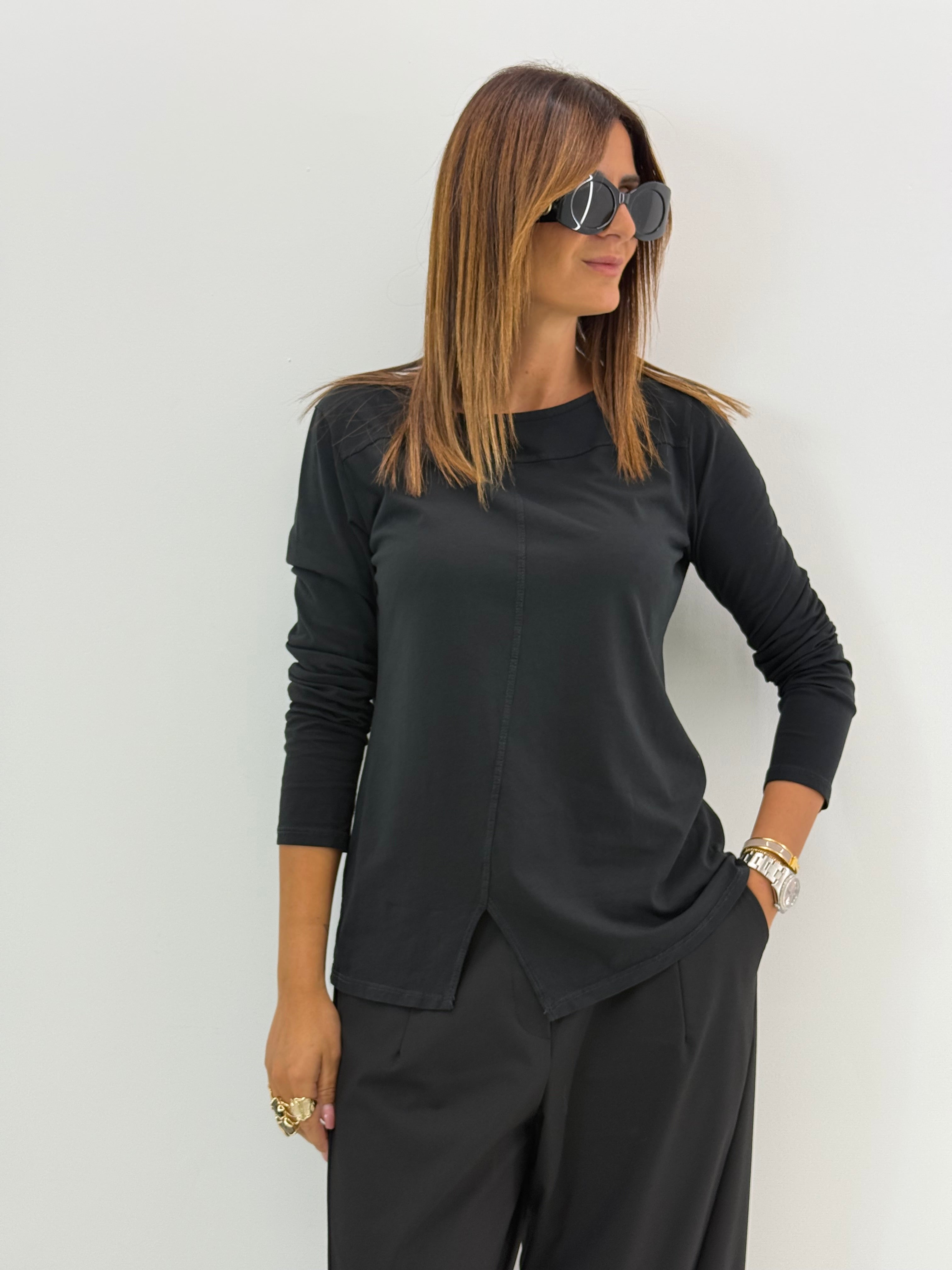 Maglia in cotone, scollo rotondo e spalla morbida. Maniche lunghe. Dettaglio spacco finale. Taglio morbido e leggermente svasato. Senza chiusure. Comoda vestibilità.