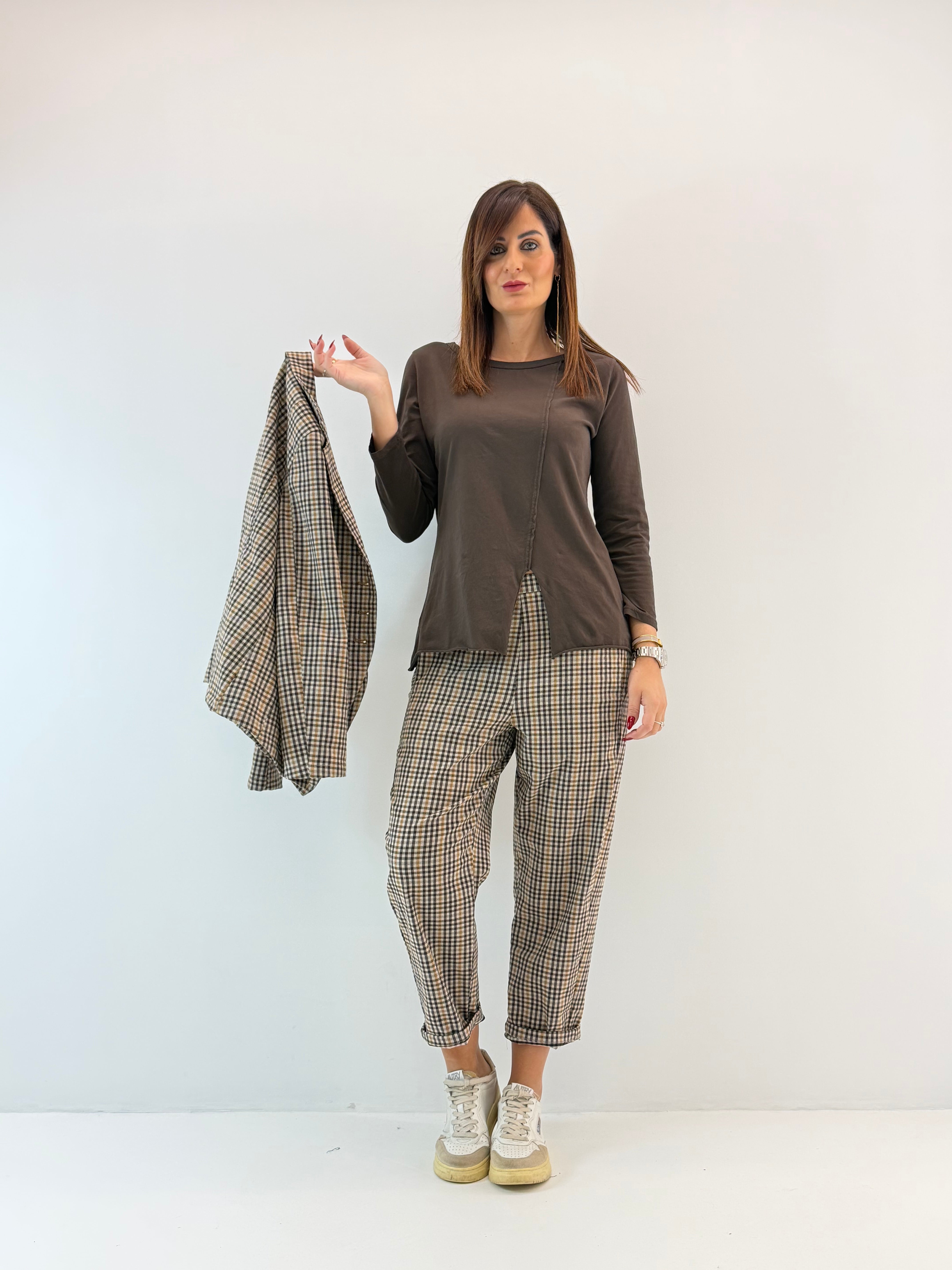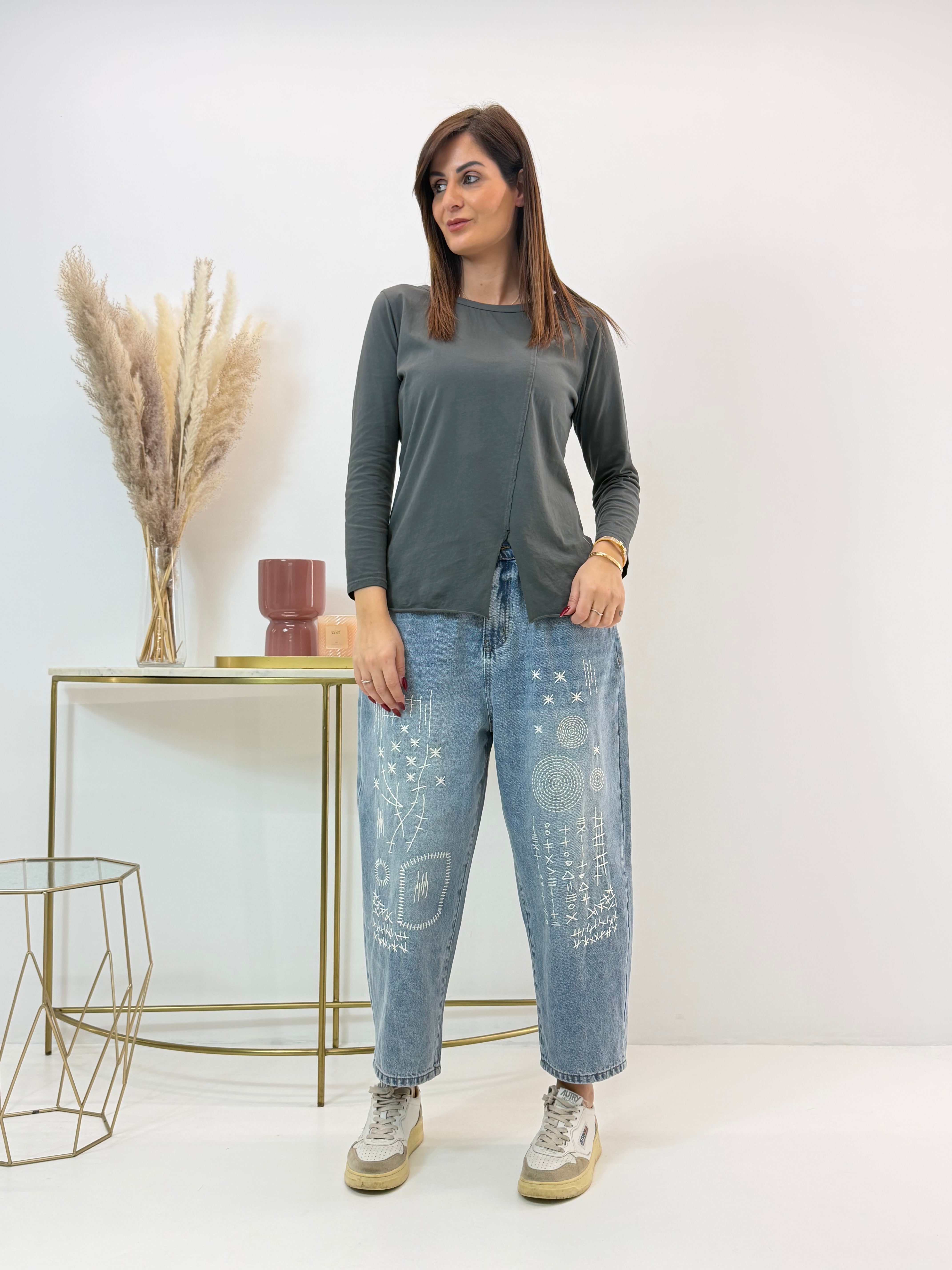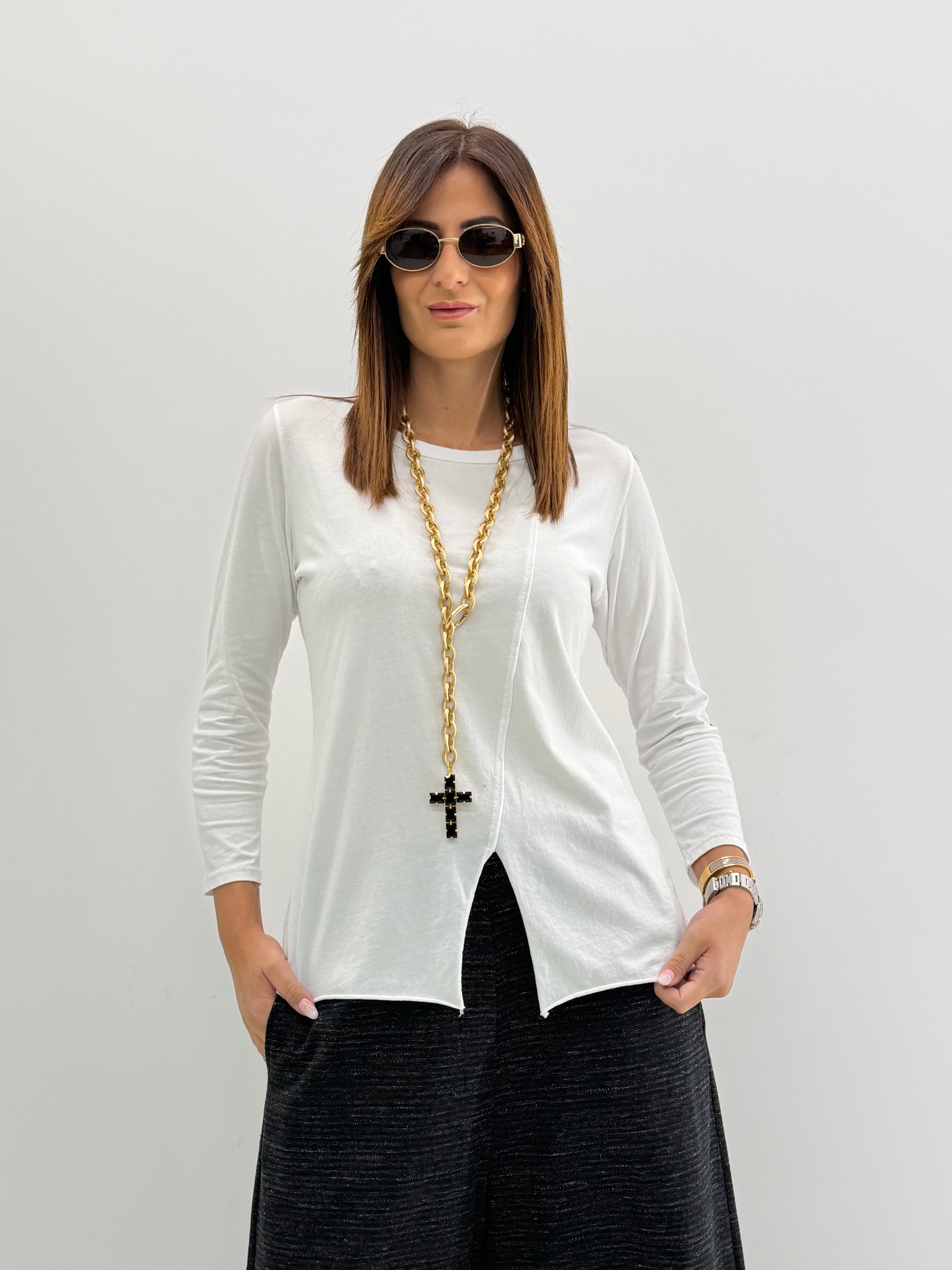 Maglietta in Jersey di cotone con scollo tondo e maniche lunghe. Dettaglio cucitura in diagonale frontale con spacchetto finale. Orli a taglio vivo. Vestibilità comoda.