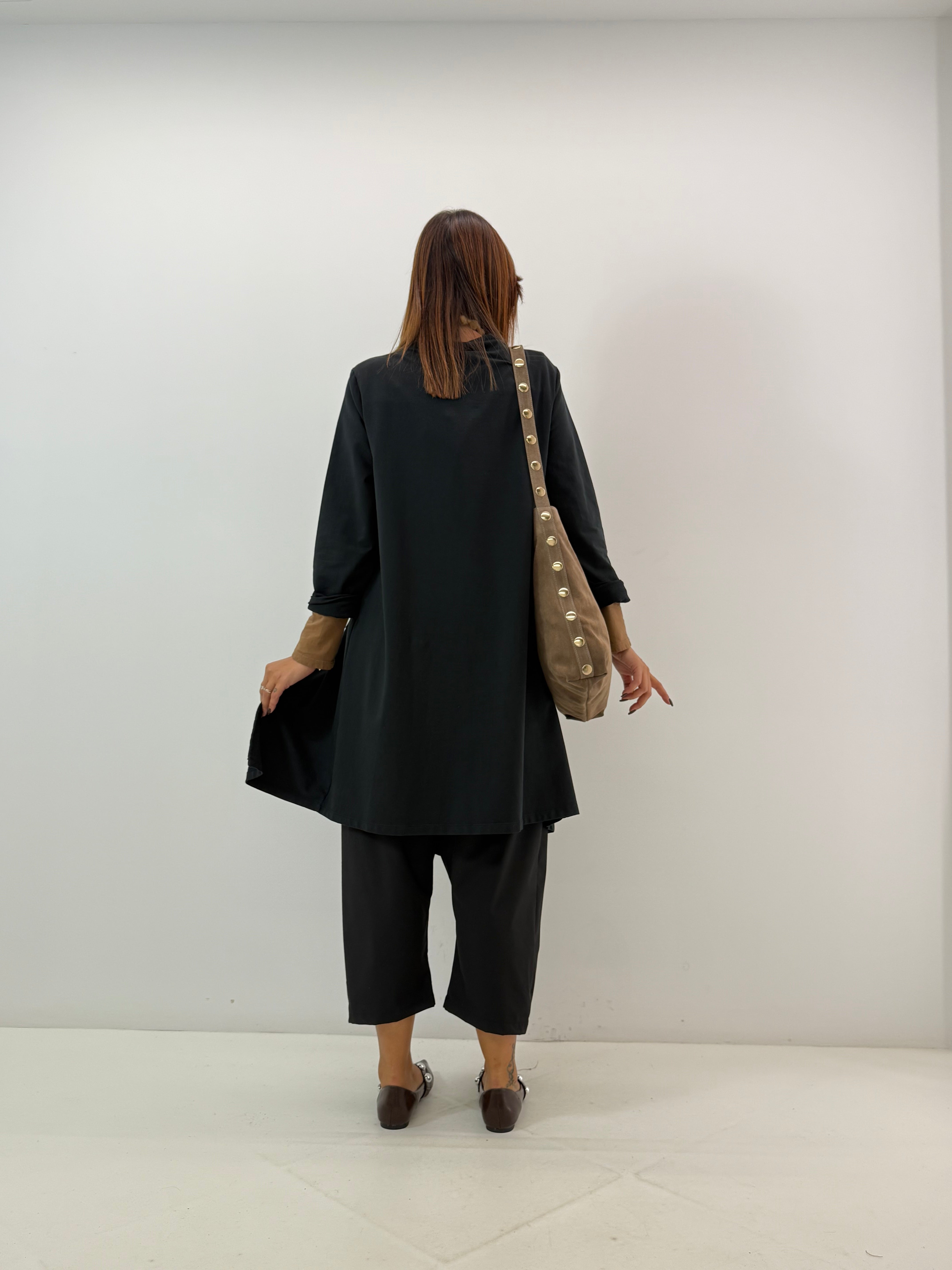 Maglia in cotone, scollo rotondo e spalla morbida. Maniche lunghe. Taglio morbido e leggermente svasato, più lunga dietro e orlo stondato sul davanti. Senza chiusure. Comoda vestibilità.