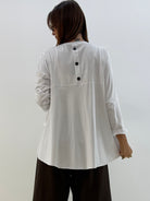 Maglia con spacchetto centrale davanti, più lunga dietro. Applicazione di bottoncini dietro.