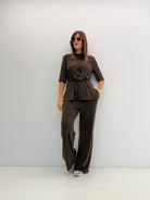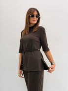 Maglia con maniche a 3/4, scollo rotondo, spacchetti laterali, passanti per cintura e cinturino in tessuto.