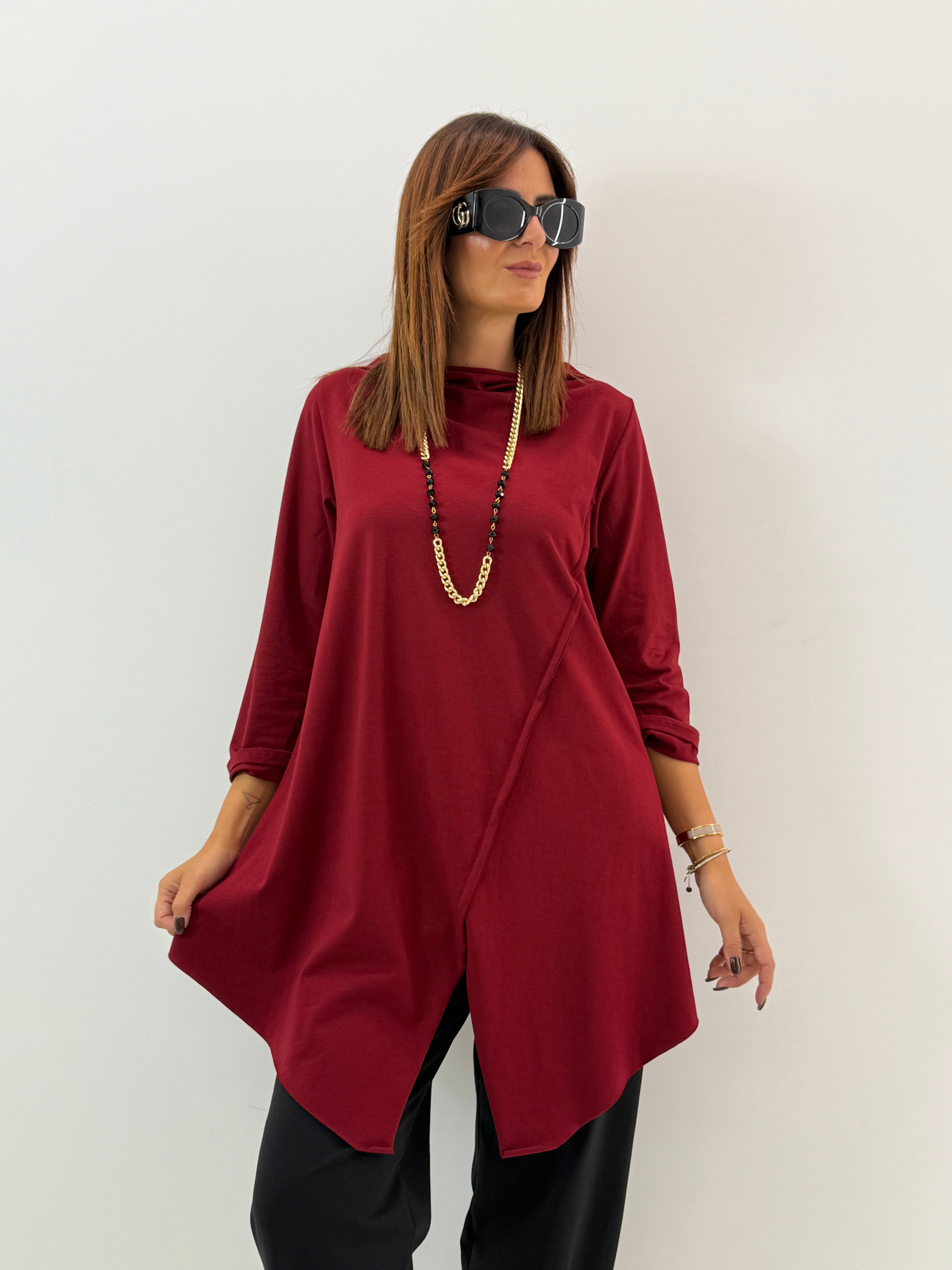 Maglia asimmetrica in cotone, taglio asimmetrico e cuciture a vista.