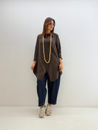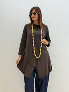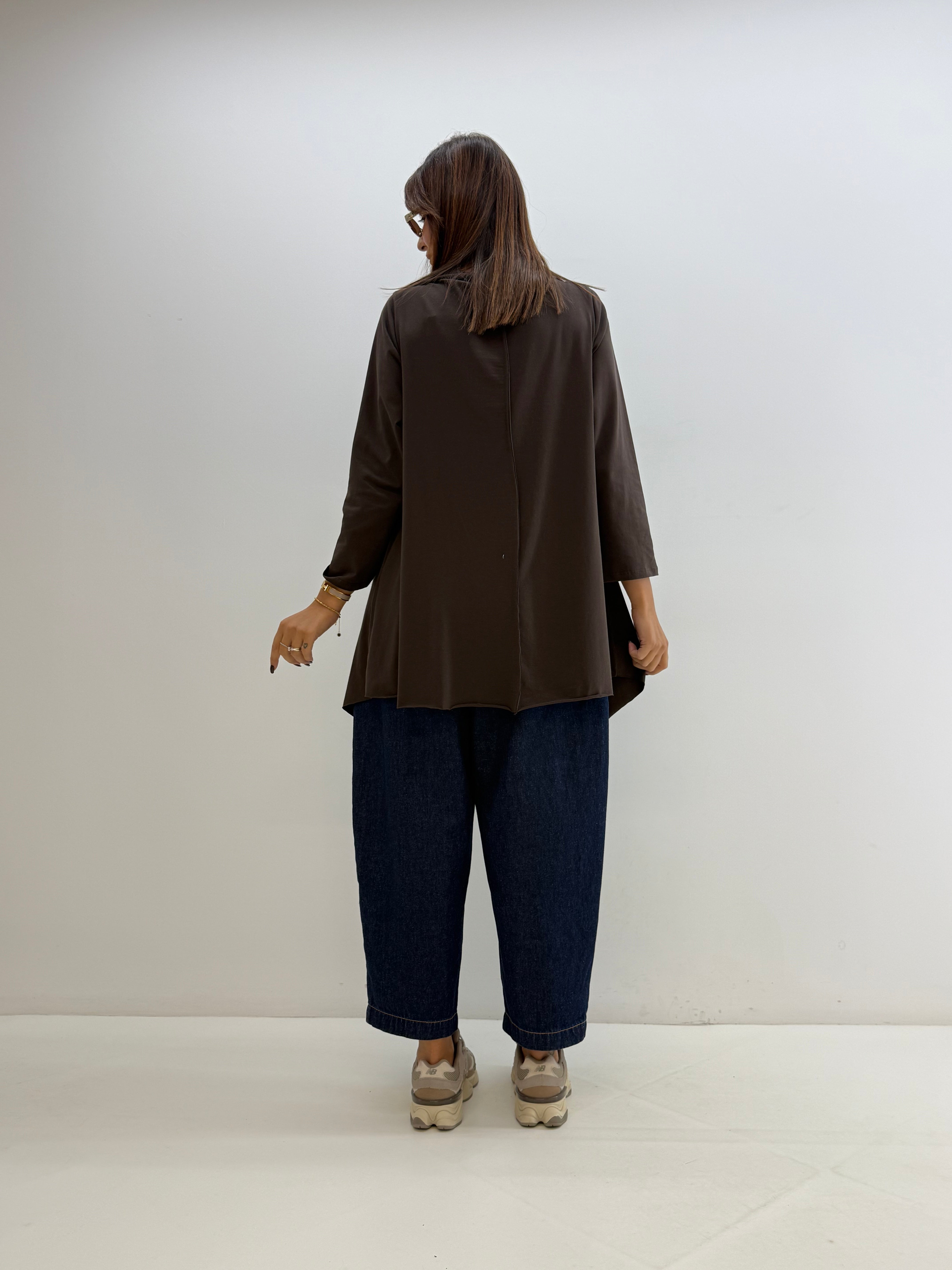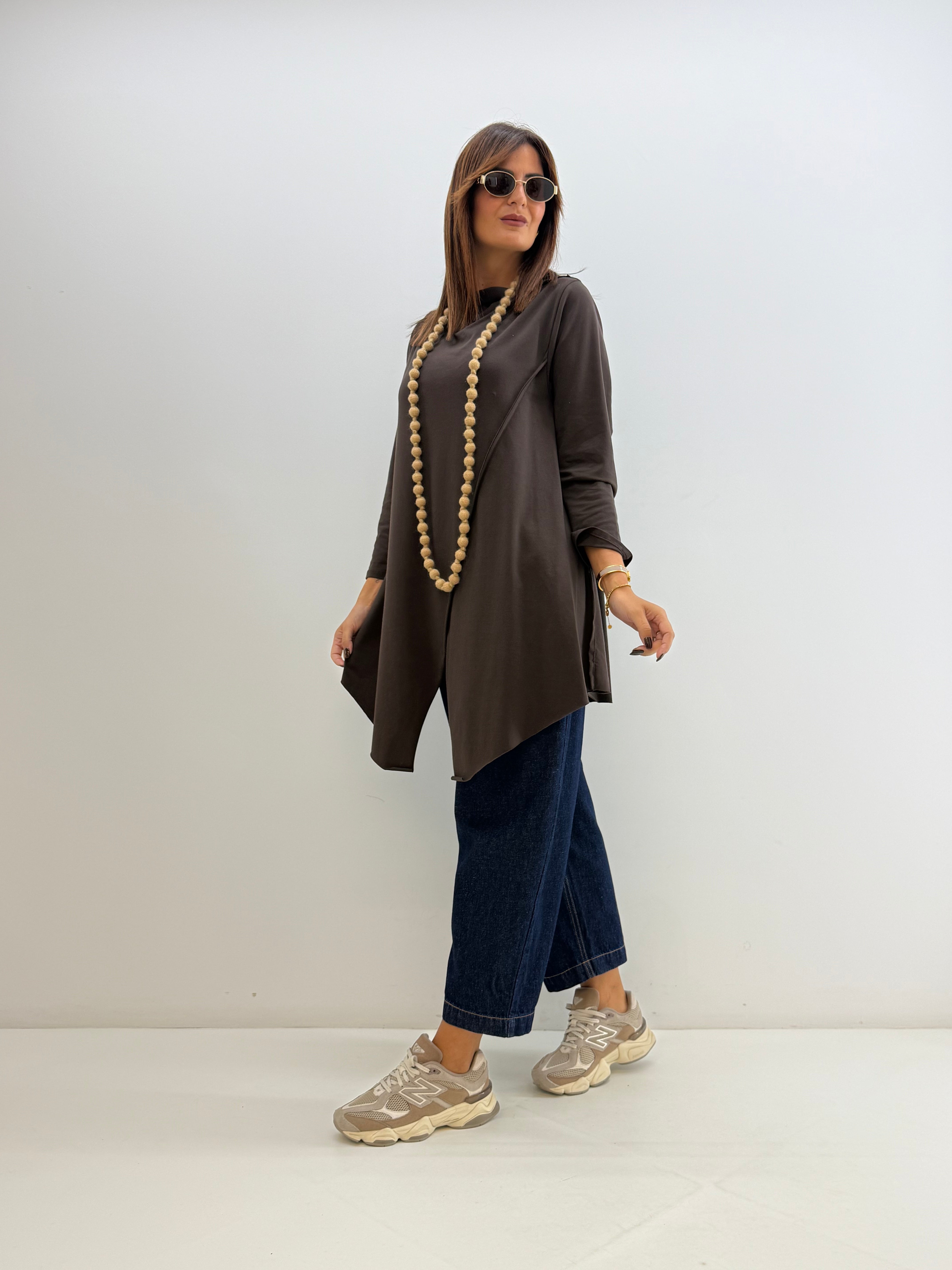 Maglia asimmetrica in cotone, taglio asimmetrico e cuciture a vista.