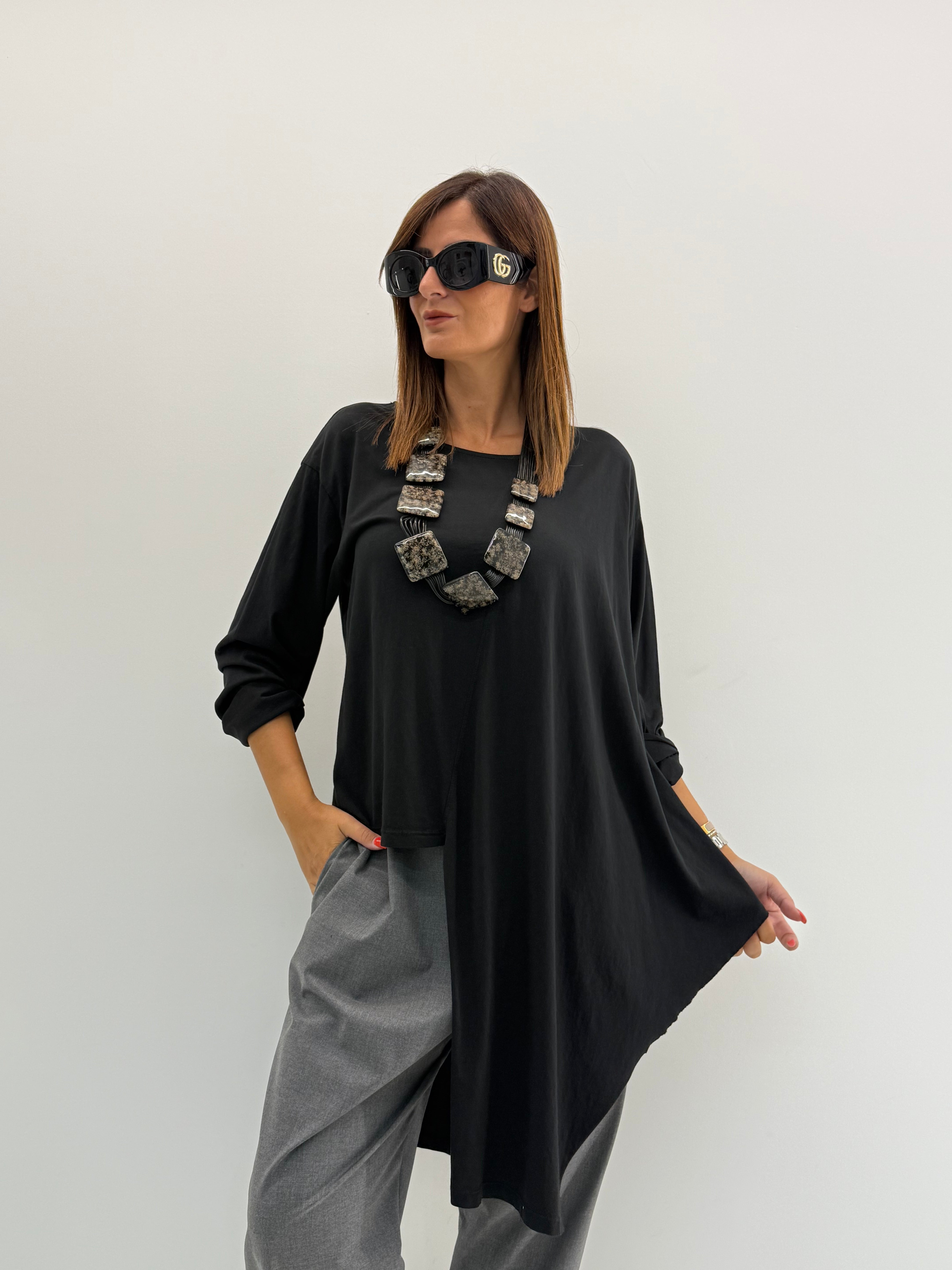 Maglia asimmetrica in cotone. Scollo rotondo. Spalla calata e maniche lunghe, più lunga nella parte sinistra.