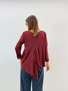 Maglia asimmetrica in cotone. Scollo rotondo. Spalla calata e maniche lunghe, più lunga nella parte centrale.