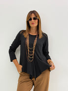 Maglia asimmetrica in cotone. Scollo rotondo. Spalla calata e maniche lunghe, più lunga nella parte centrale.