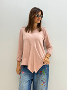 Maglia asimmetrica in cotone. Scollo rotondo. Spalla calata e maniche lunghe, più lunga nella parte centrale.