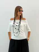 Maglia in cotone, manica a 3/4 e scollo a barca, orli a taglio vivo.